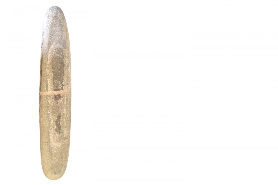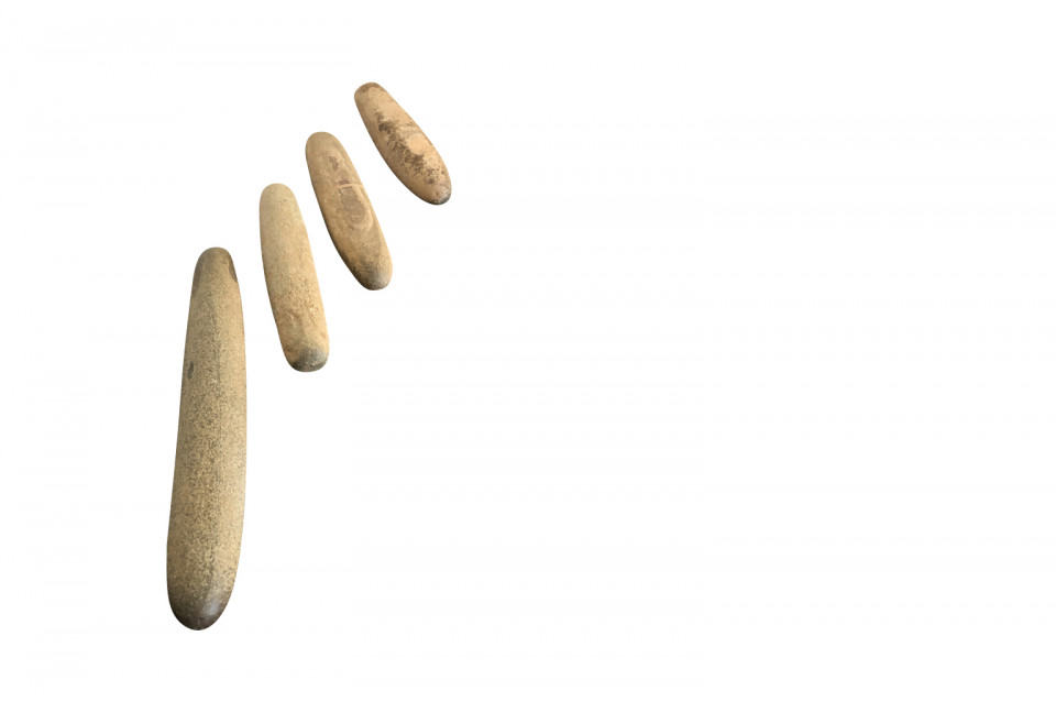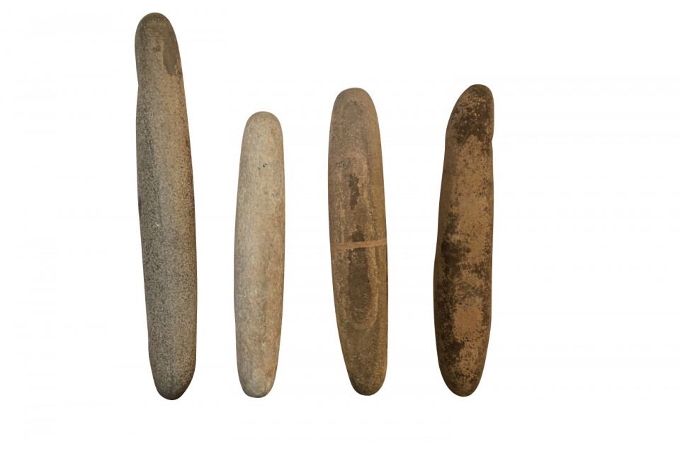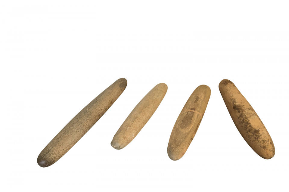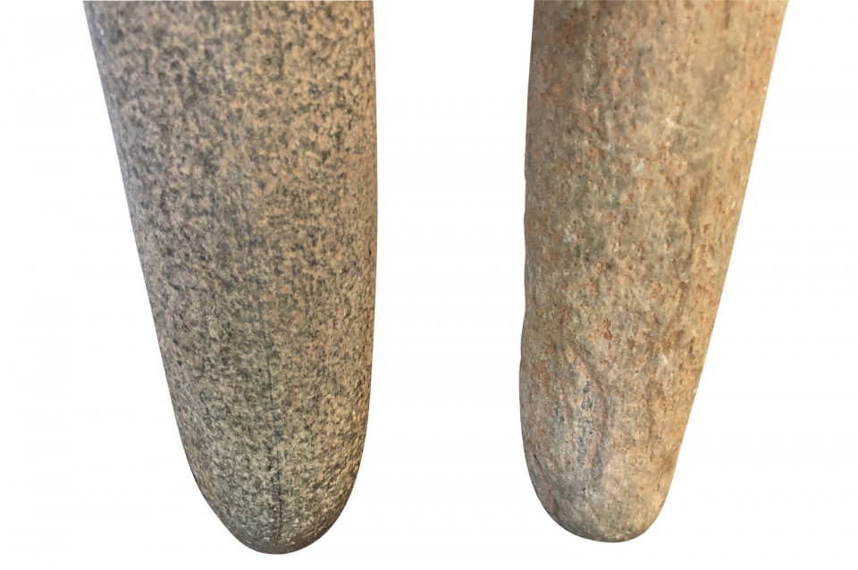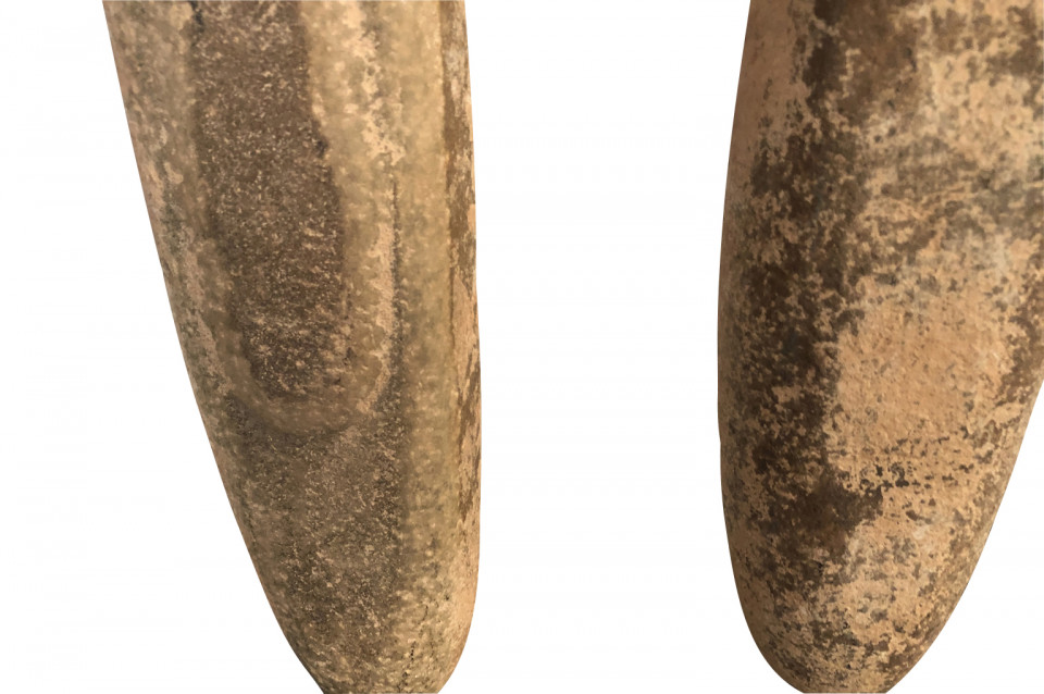 An amazing set of 4 prehistoric stone lithophones origining from the Sahara Dessert. “Litho” is Greek for stone and “phone” means sound. Lithophones are musical instruments consisting of a purposely-selected rock that is tapped or rubbed with friction to produce musical notes. Portable and stationary lithophones have been utilized in ancient and modern cultures around the world, including Europe, the Far East, Africa, the South Seas, and South America. The pieces range from 15 7/8" H X 3" W X 2 5/8" D to 20 7/8" H X 3" W X 2 7/8" D. A tremedous collection of intriguing objects.