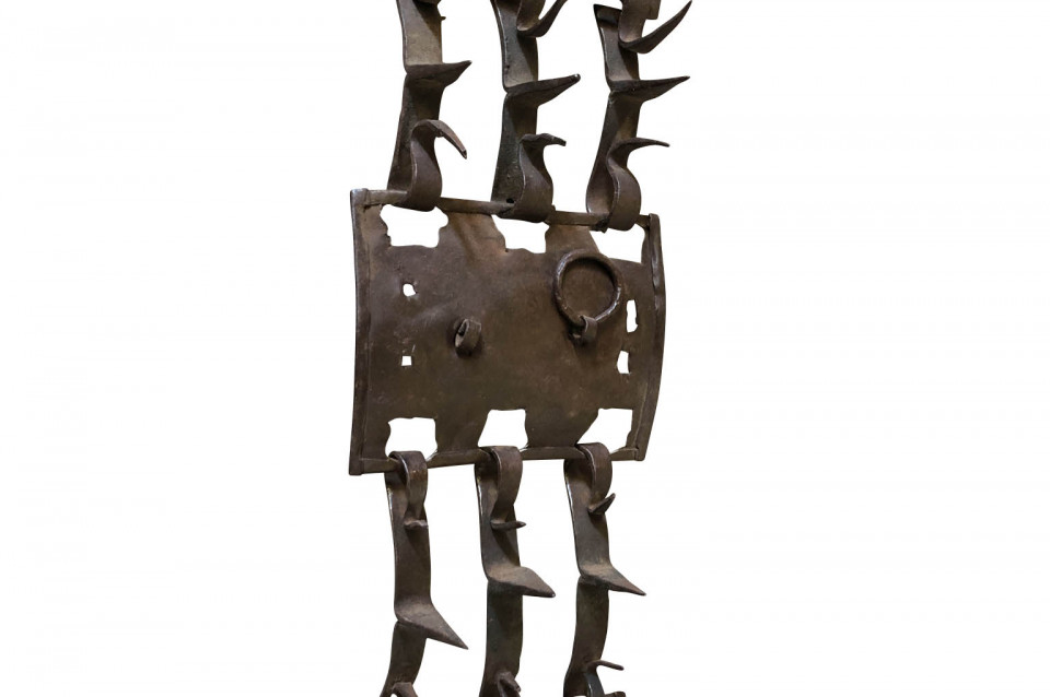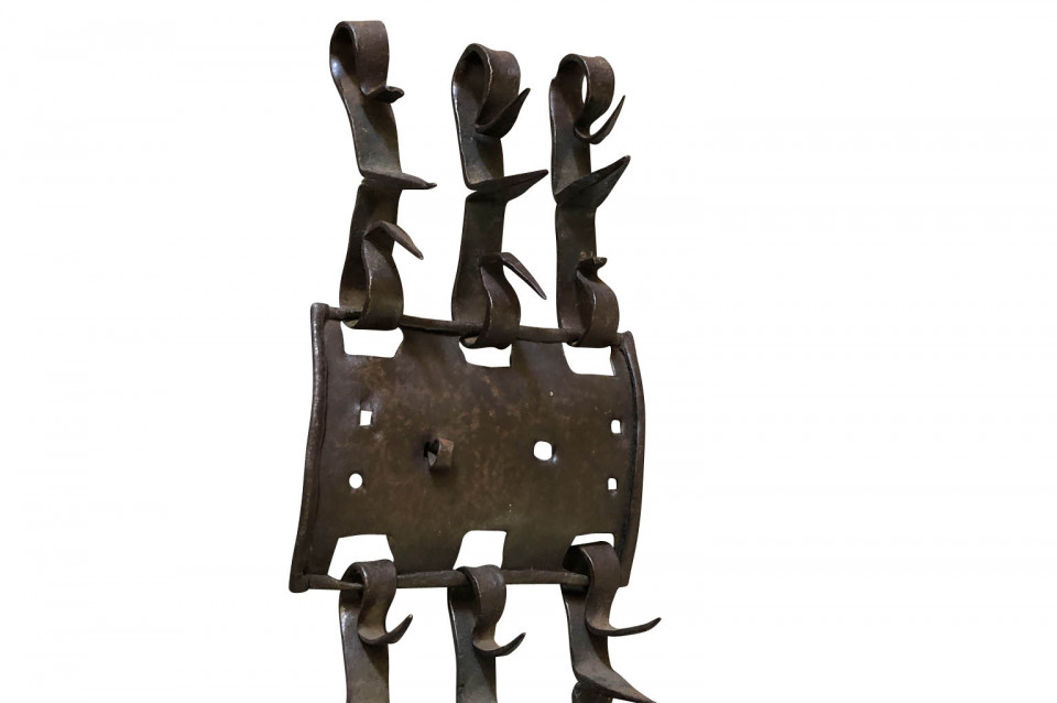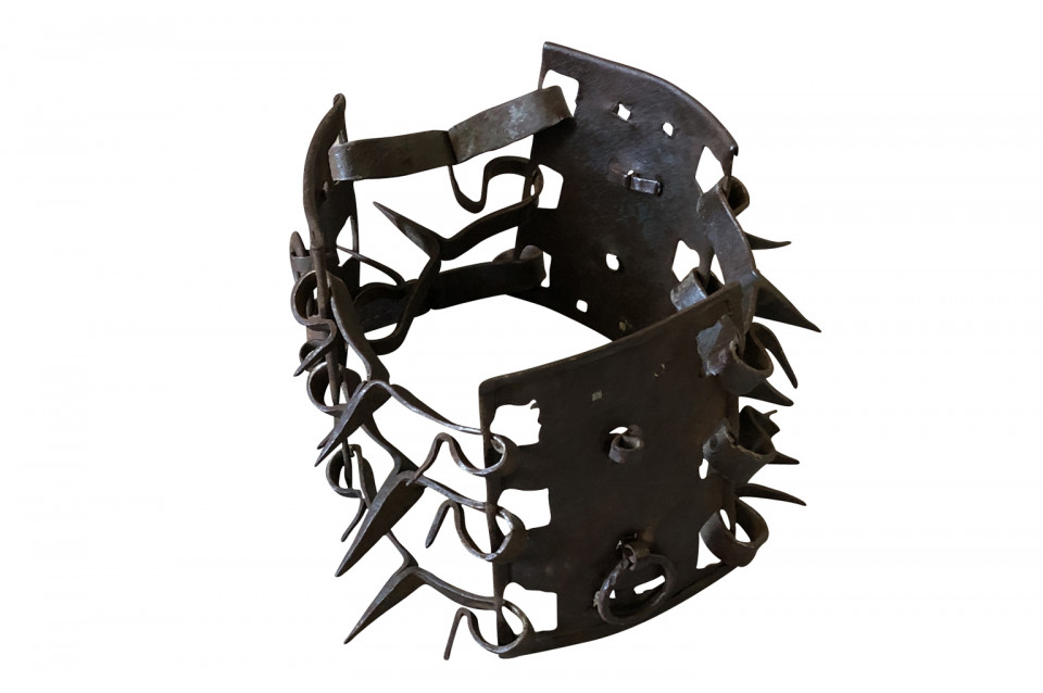 A very interesting 18th century Dog Collar expertly crafted in iron. Collars such as this one were used to protect the dog from attack. An intriguing art piece to lay on a table top or display from a stand.