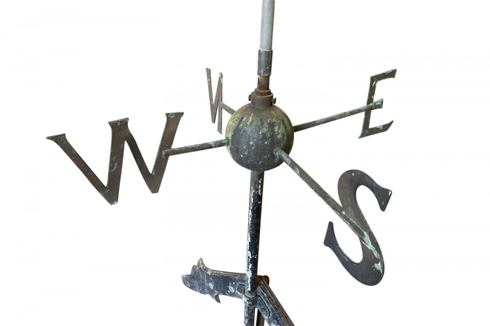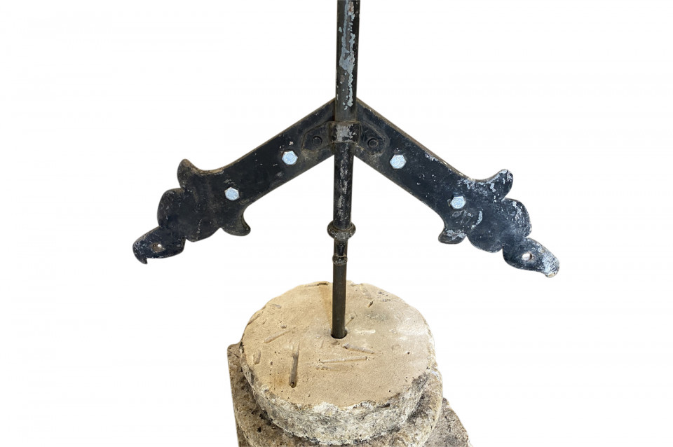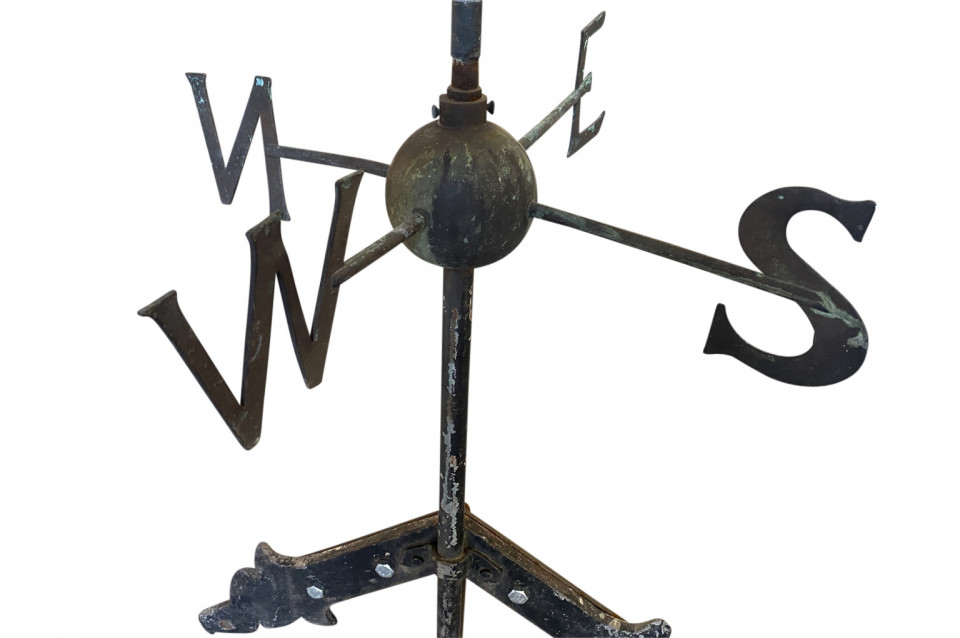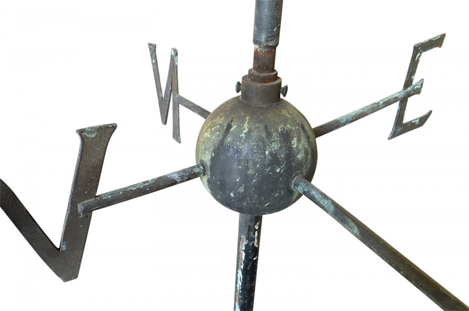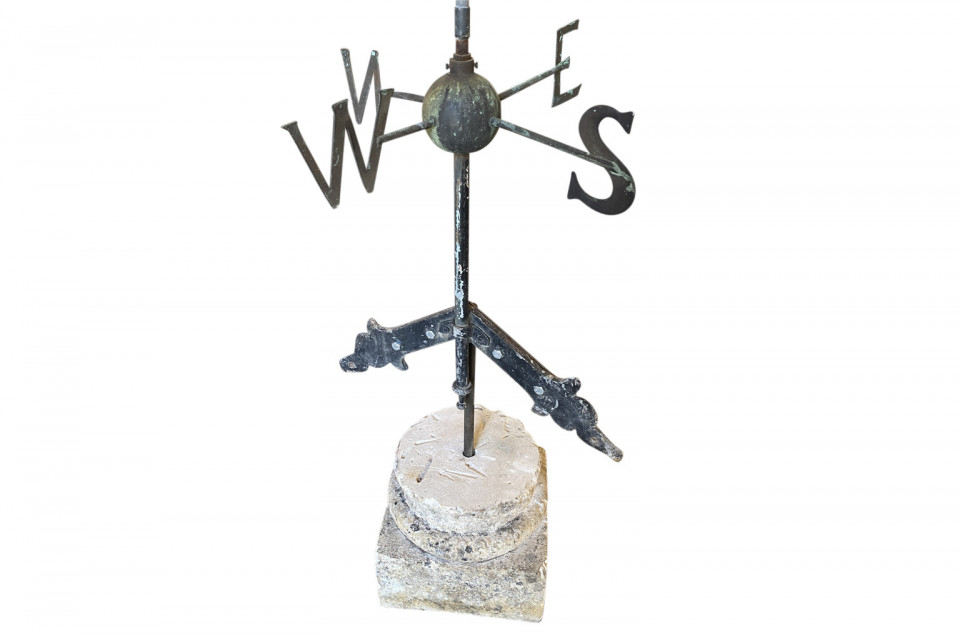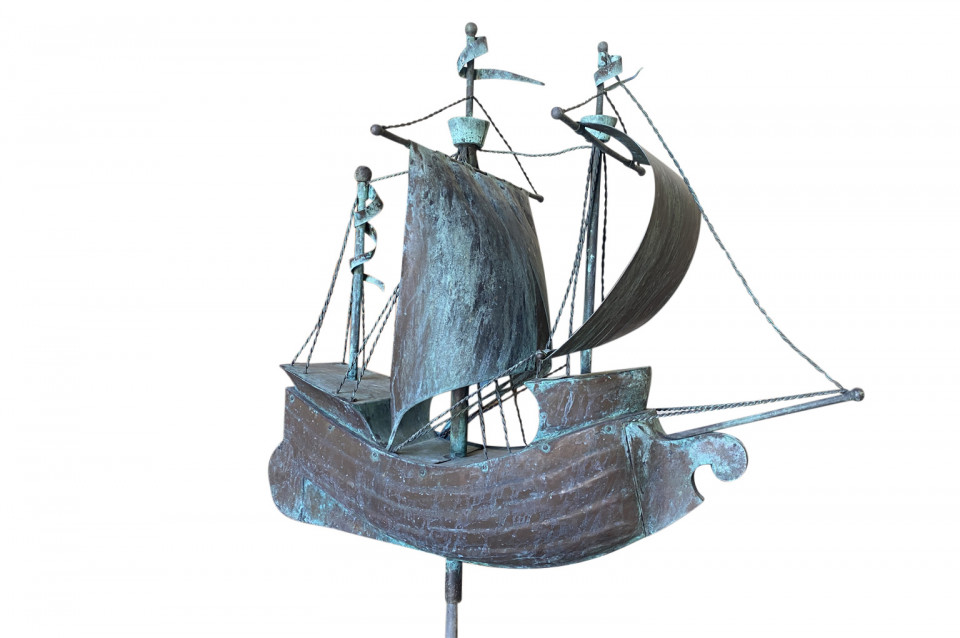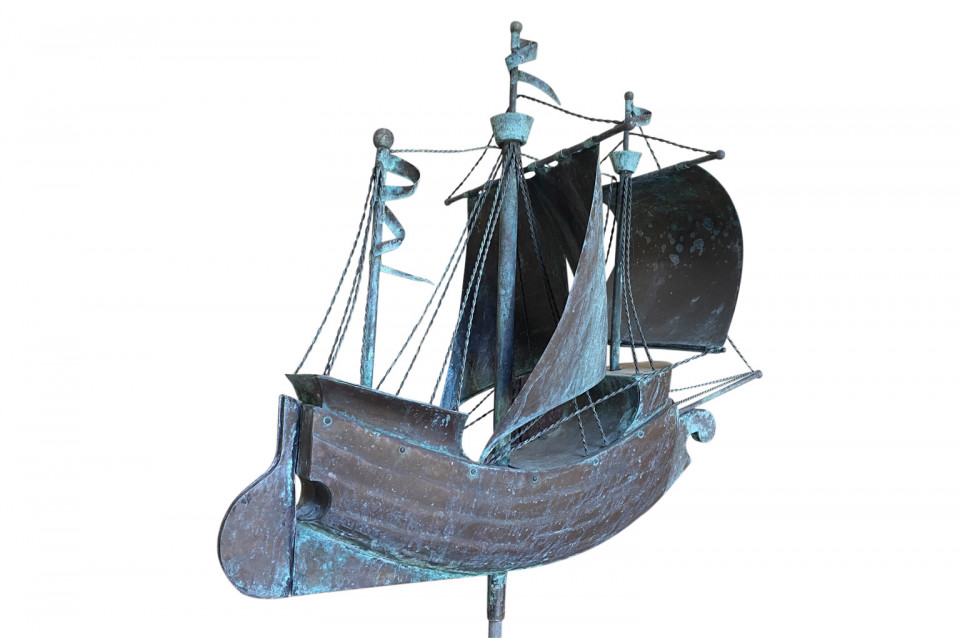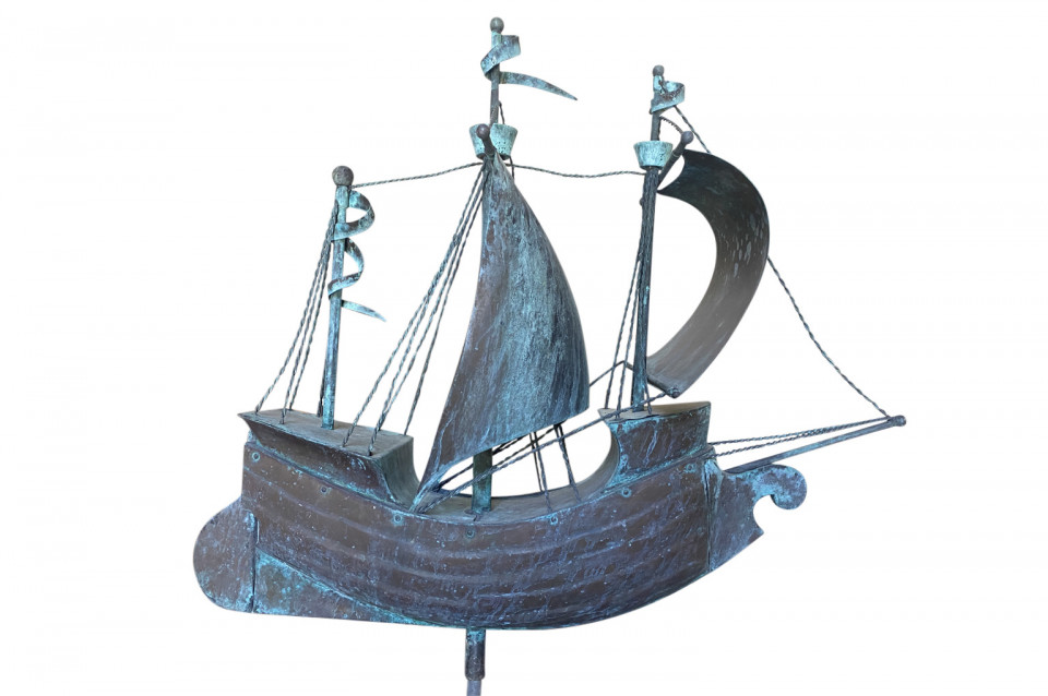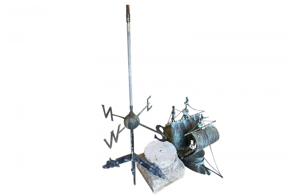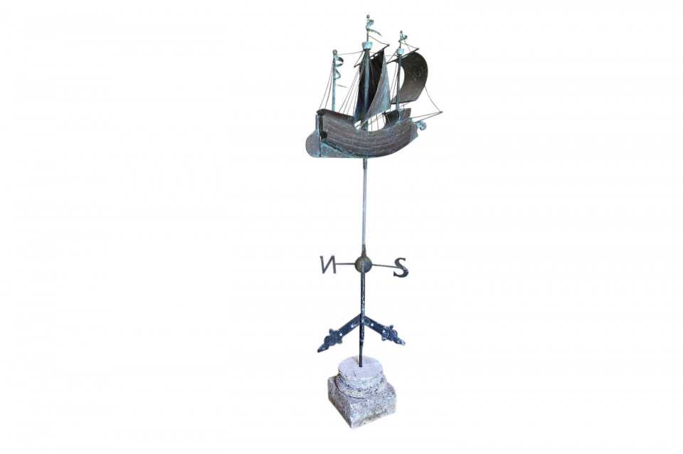 A sensational later 19th century Girouette - Weather Vane of a Galleon found in the South of France. The galleon is expertly crafted from beautifully patina'd copper and rests in its stone base. A wonderful accent piece for any beach or lake house.