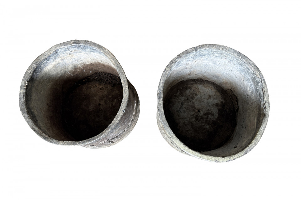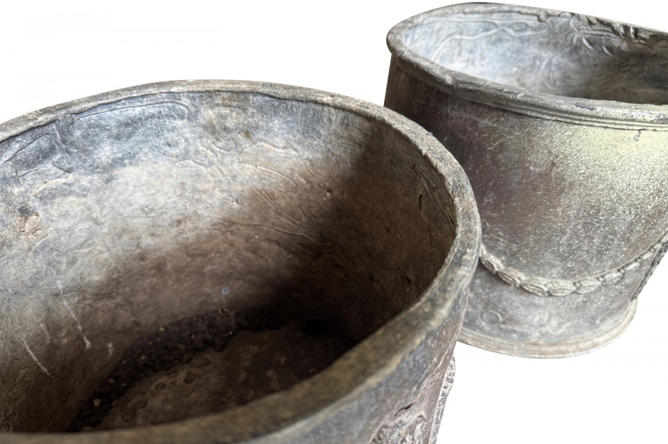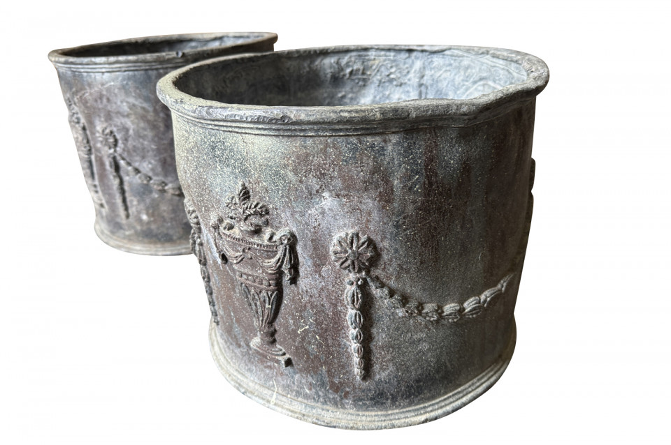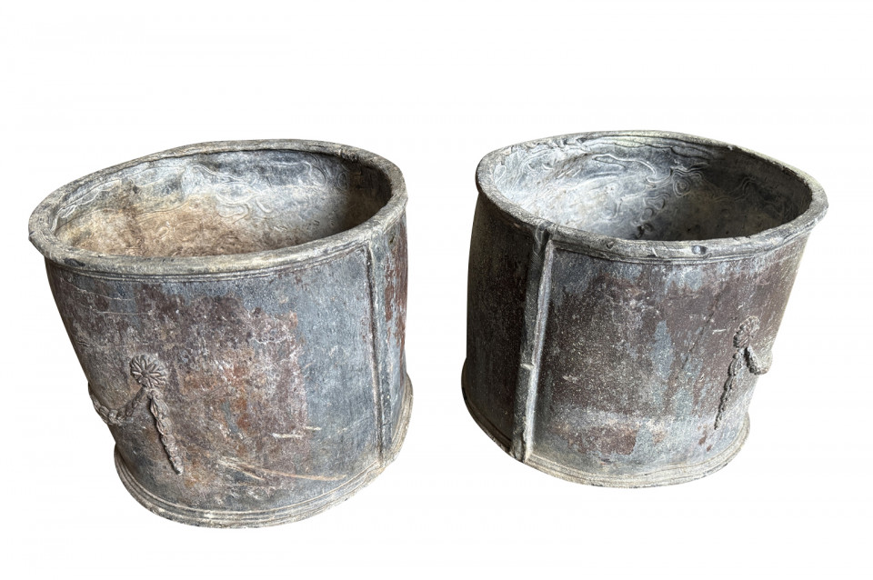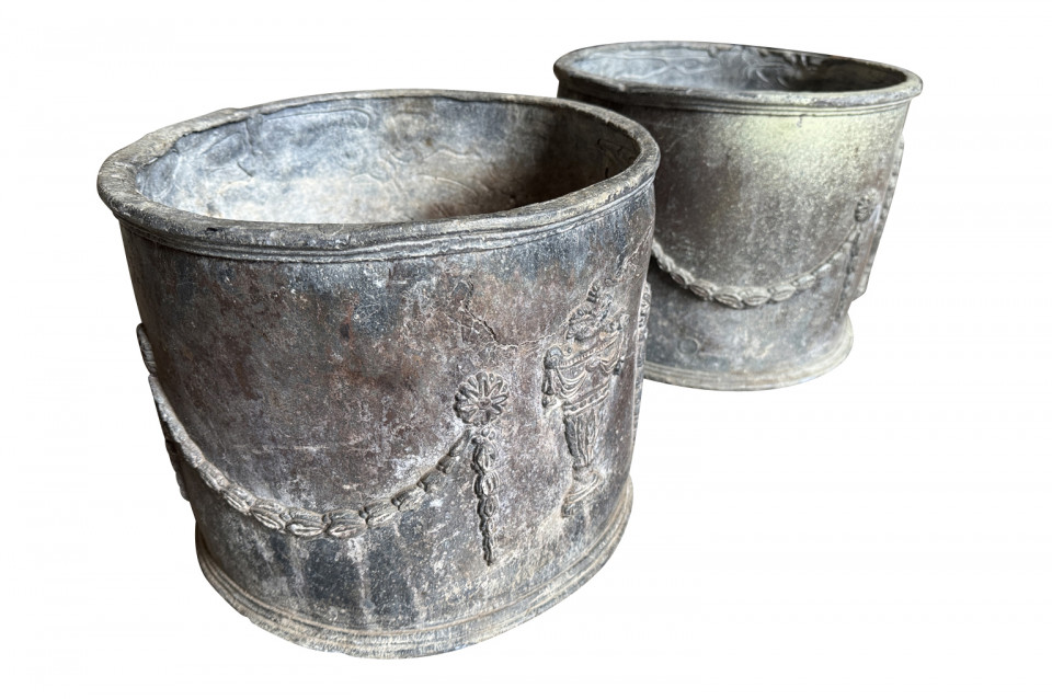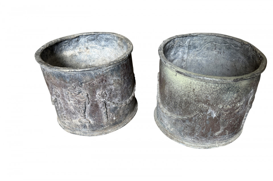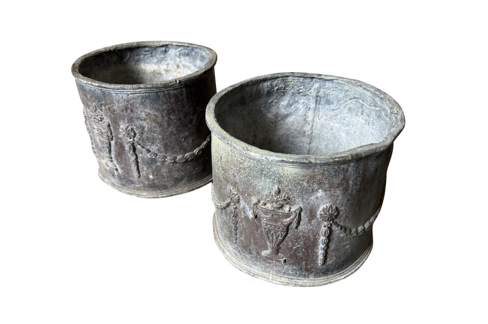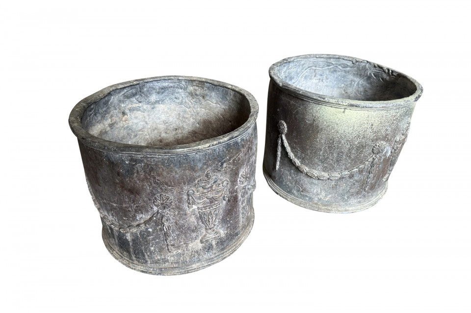 A very lovely pair of 17th century Cache Pots from the Provence region of France. Handsomely crafted in lead with decorative urns and swags. Sensational patina.