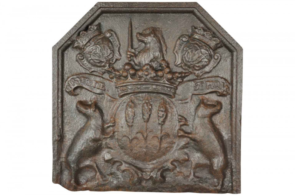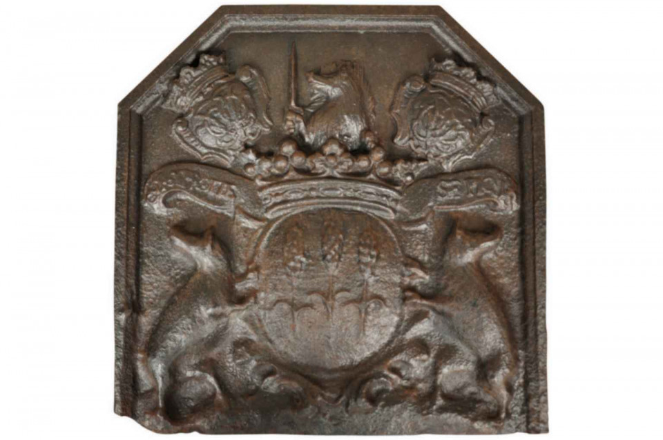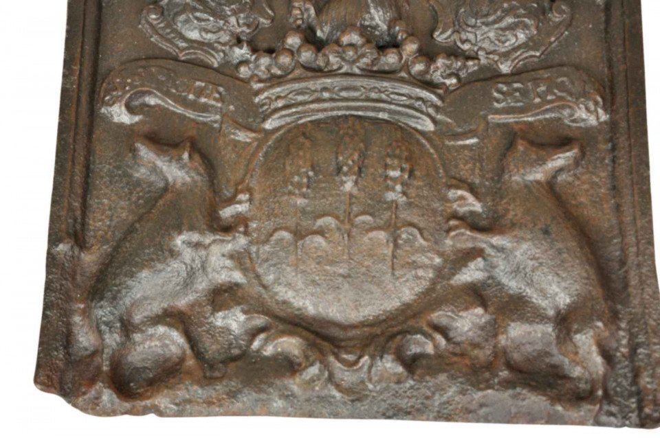 An exceptional 17th century French Fireback in cast iron. A luxury item that served not only to adorn the fireplace, but to protect the backwall of the fireplace and to radiate heat outwards. Decorated with a family crest or Blason. Firebacks also serve beautifully as kitchen back splashes and wall mounted pieces for the interior or any garden.