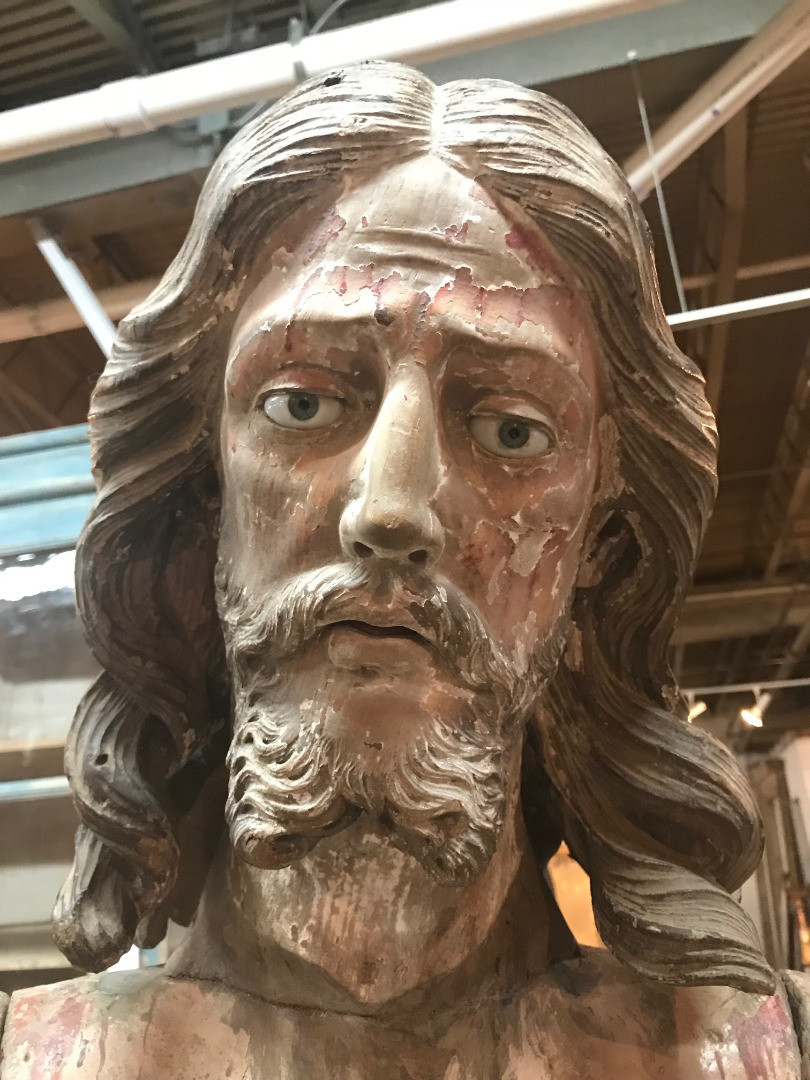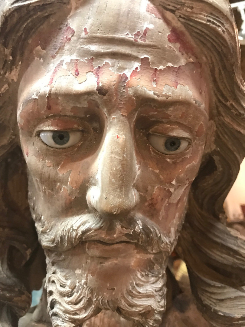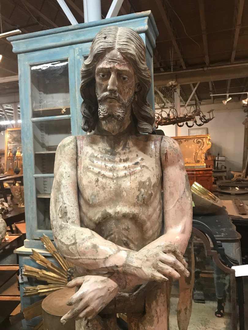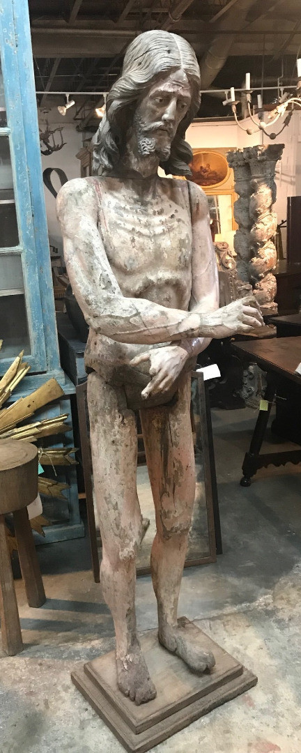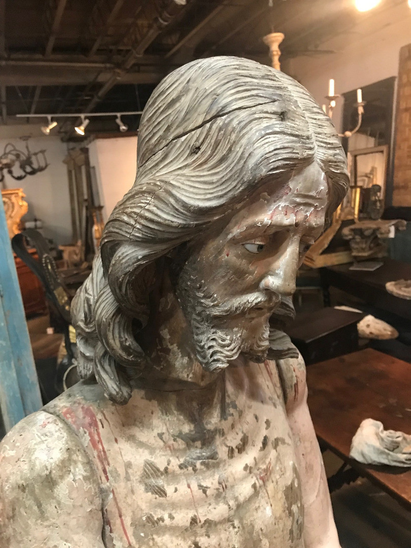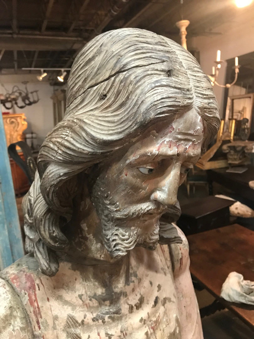 A monumental & exceptional later 15th century Spanish statue of Jesus Christ. Exquisitely carved from Mulberry and Chestnut woods. The head is carved from Mulberry and the body is carved from chestnut. The carving detail is breathtaking. The form of the hair and the pointed beard are typical of this period. The eyes are made from sulphur. The polychrome has a magnificent patina. The statue rests on a more recent base. Indeed a truly exceptional work of art.