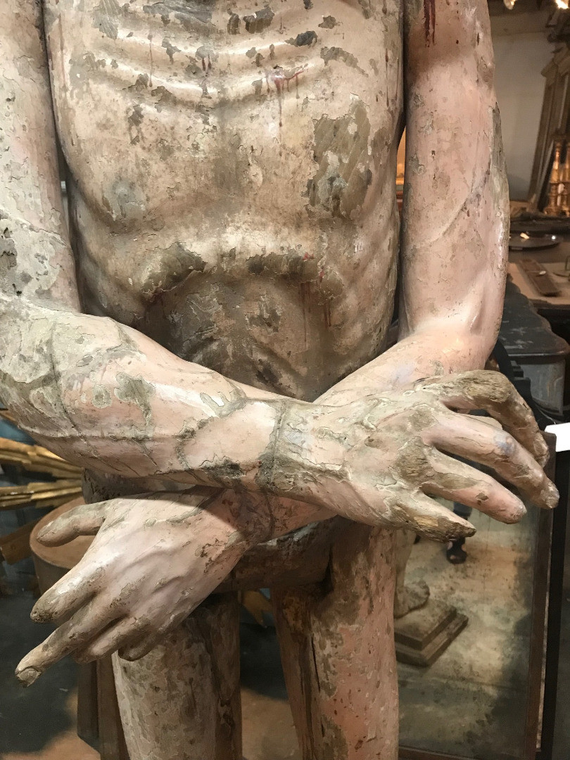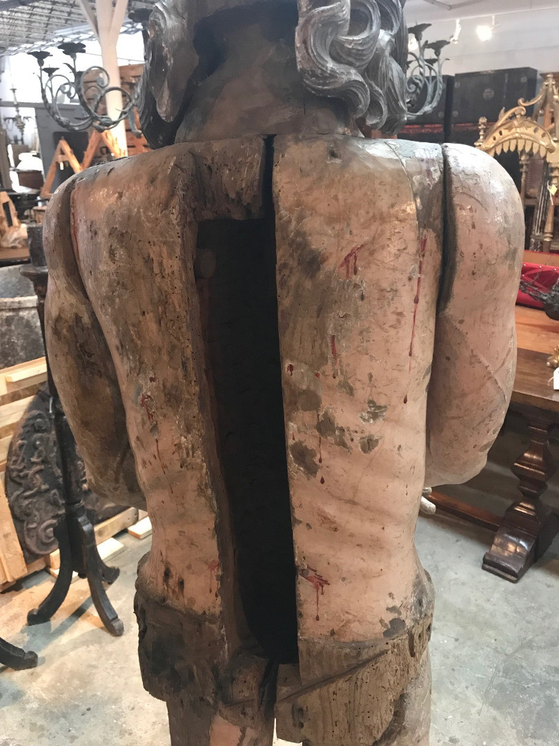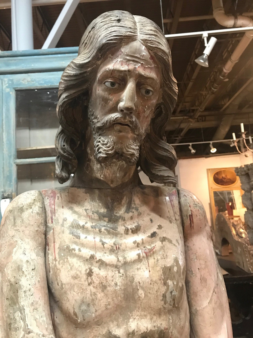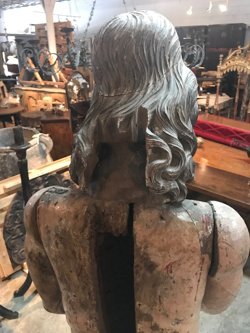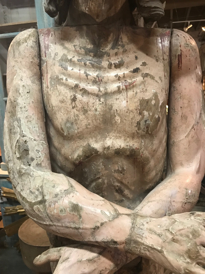 A monumental & exceptional later 15th century Spanish statue of Jesus Christ. Exquisitely carved from Mulberry and Chestnut woods. The head is carved from Mulberry and the body is carved from chestnut. The carving detail is breathtaking. The form of the hair and the pointed beard are typical of this period. The eyes are made from sulphur. The polychrome has a magnificent patina. The statue rests on a more recent base. Indeed a truly exceptional work of art.