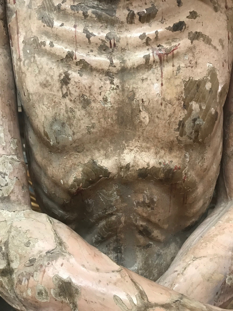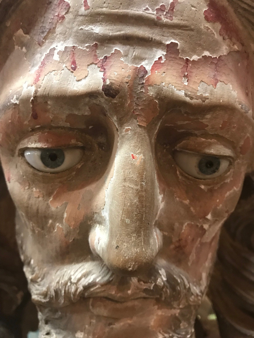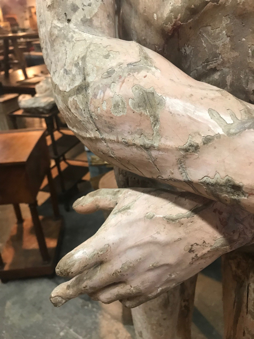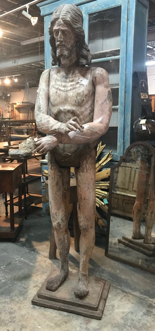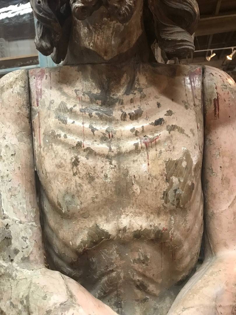 A monumental & exceptional later 15th century Spanish statue of Jesus Christ. Exquisitely carved from Mulberry and Chestnut woods. The head is carved from Mulberry and the body is carved from chestnut. The carving detail is breathtaking. The form of the hair and the pointed beard are typical of this period. The eyes are made from sulphur. The polychrome has a magnificent patina. The statue rests on a more recent base. Indeed a truly exceptional work of art.