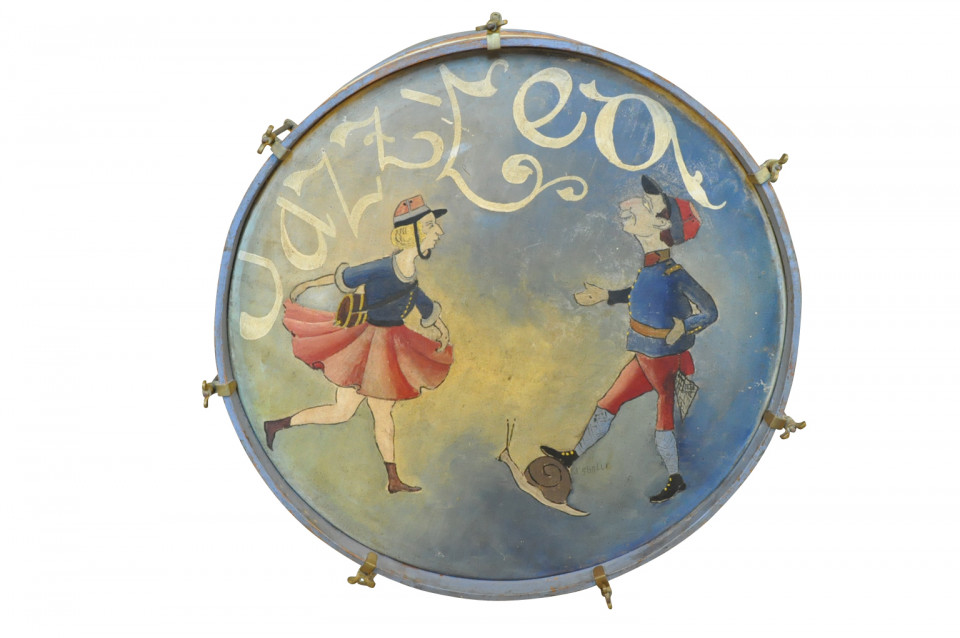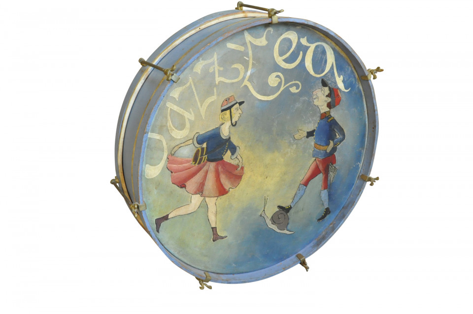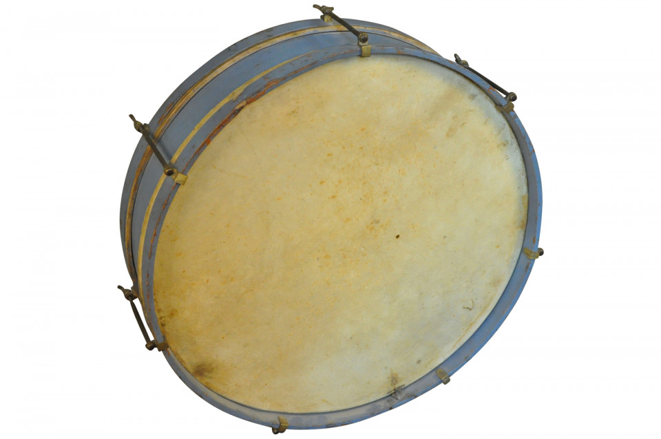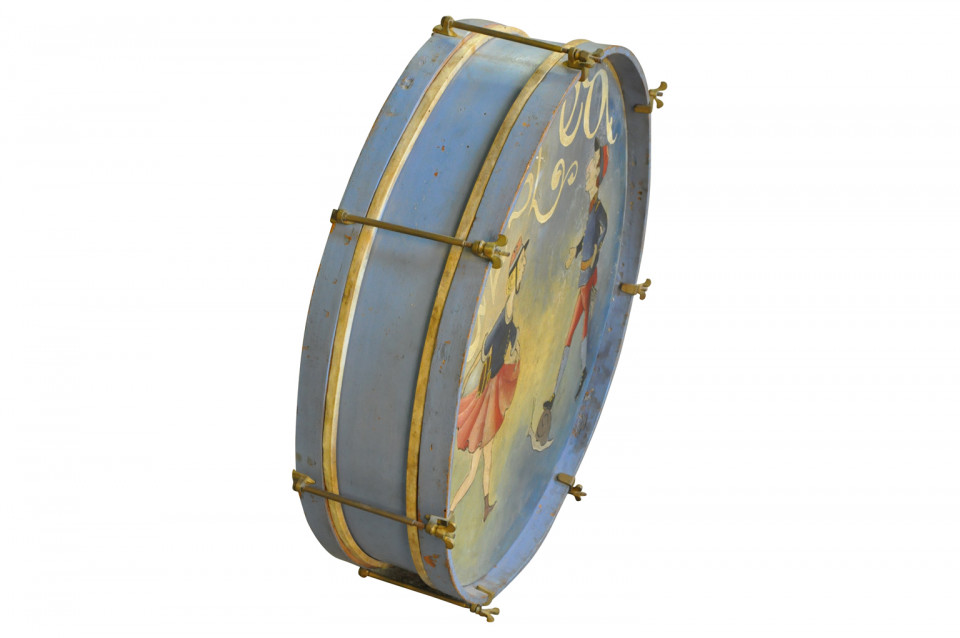 A charming French drum with whimsical paintings. A wonderful decorative piece for any child's bedroom or a music room.