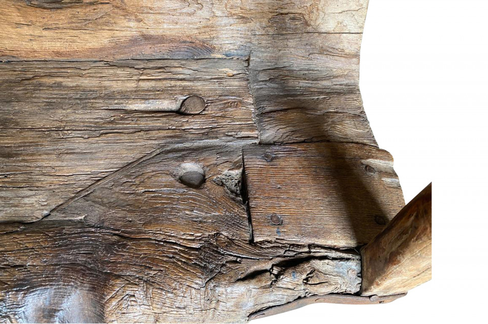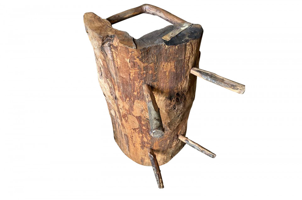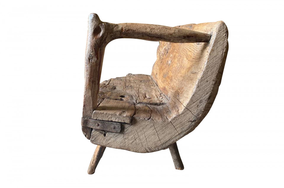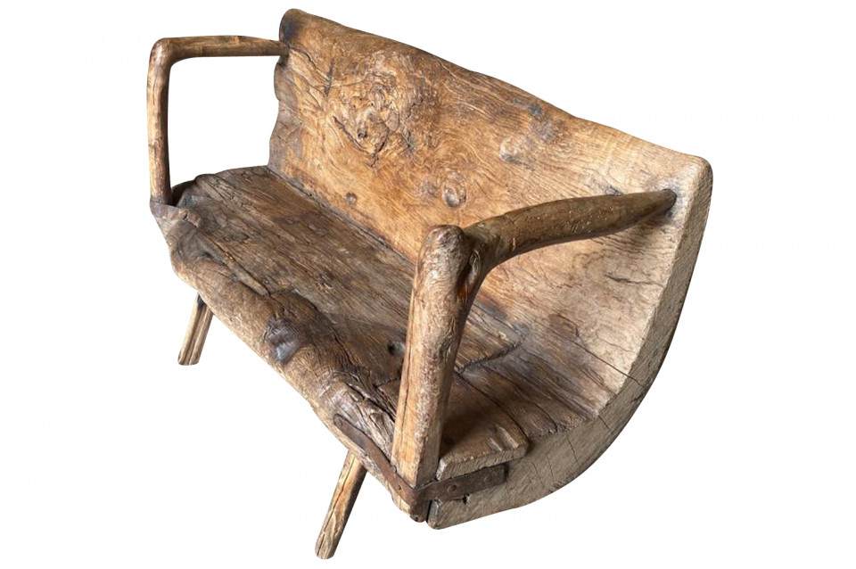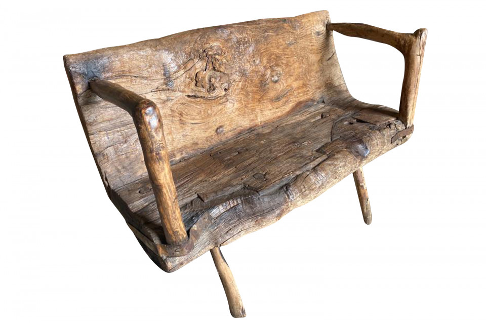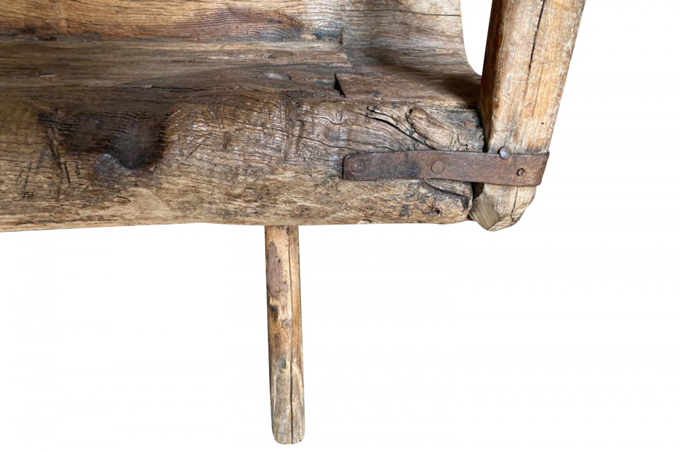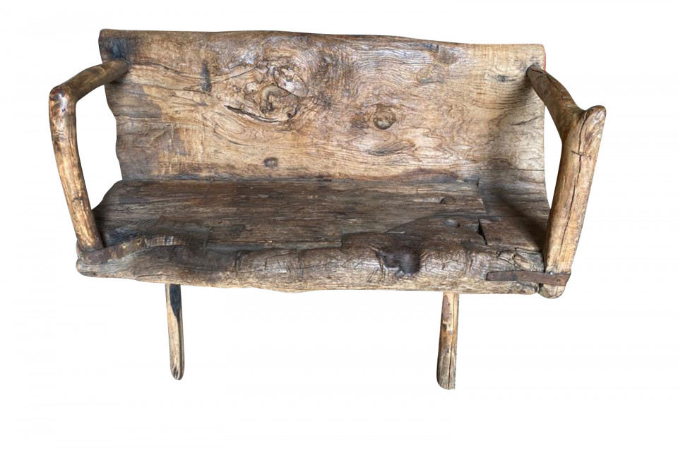 A delightful 17th century Arte Populaire Bench from the Cevennes region of France. Wonderfully constructed from chestnut with the back and seat being a single piece carved from a trunk with iron strapping. Fabulous patina and charm. The seat height is 13 1/2"