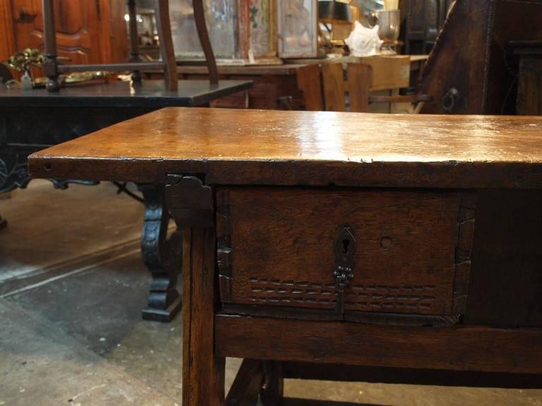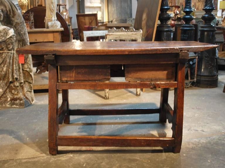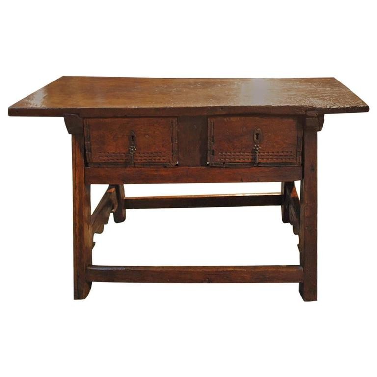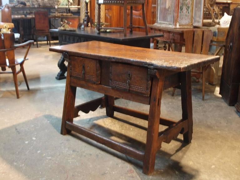 T2826 - Outstanding 17th century table with two drawers in walnut - from the Catalan region of Spain. This delightful table has a very rich and luminous patina - and a beautiful grain pattern. Wonderful not only as a side table, but as a bedside table a