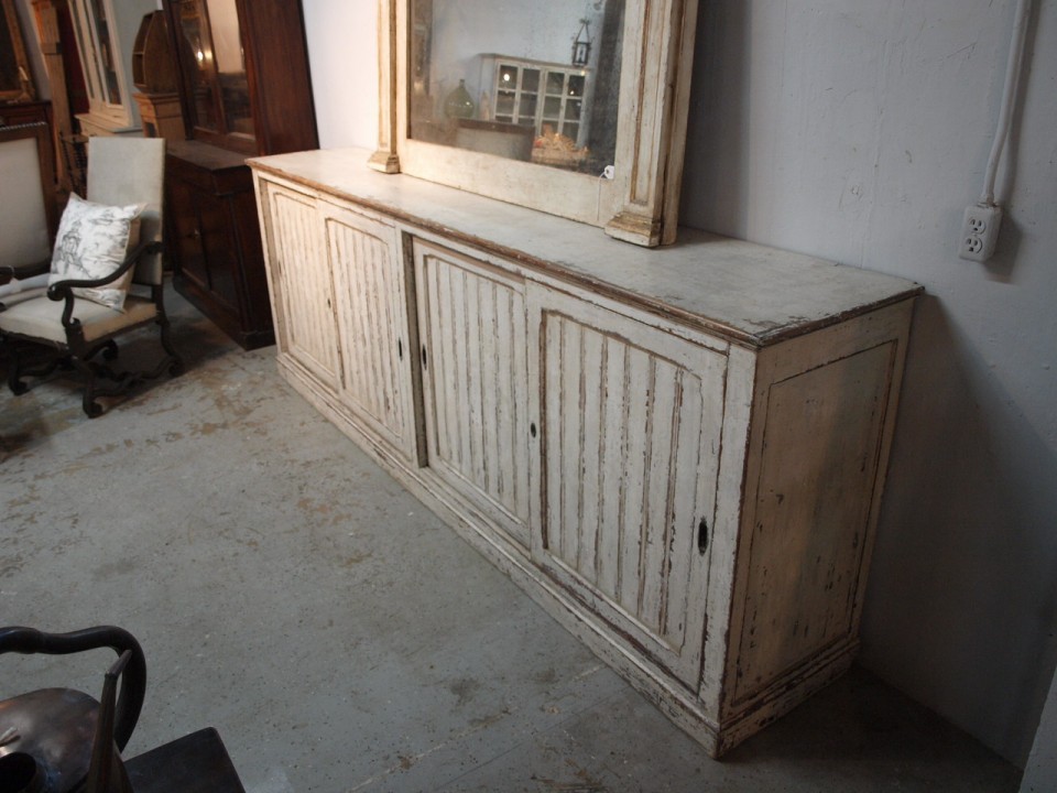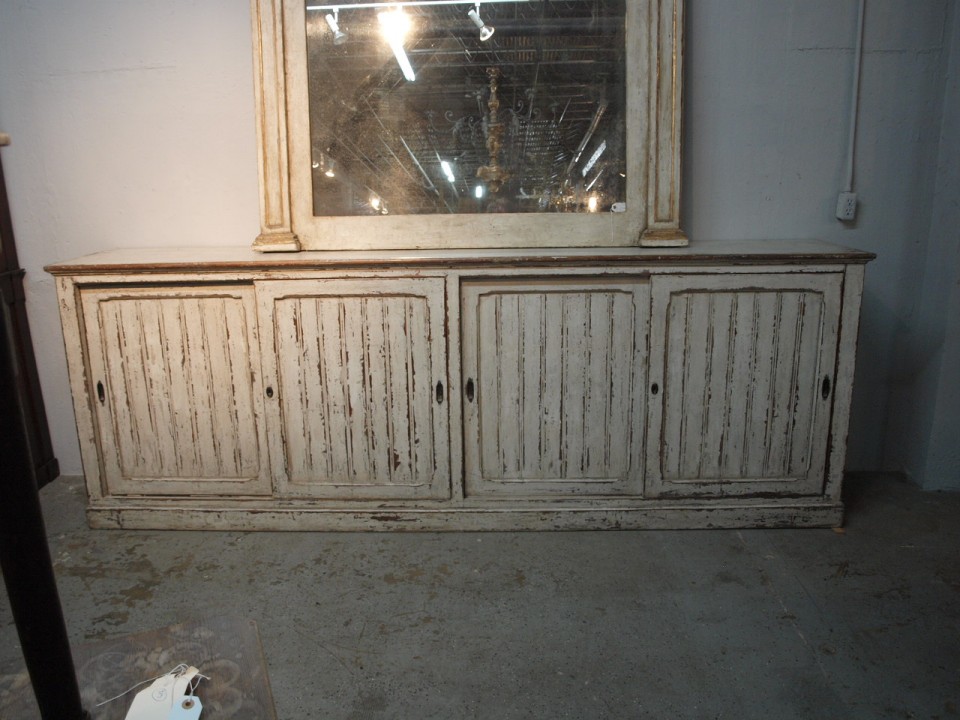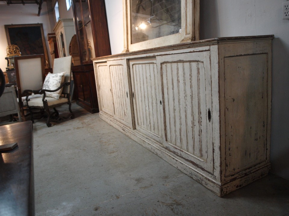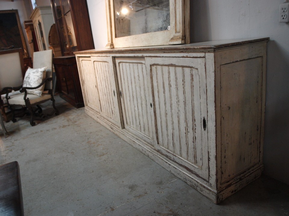 A primitive and very charming long enfilade from the Catalan region of Spain. Handsomely constructed in painted wood - with sliding doors and interior shelving. Perfect for any kitchen, living or dining area.