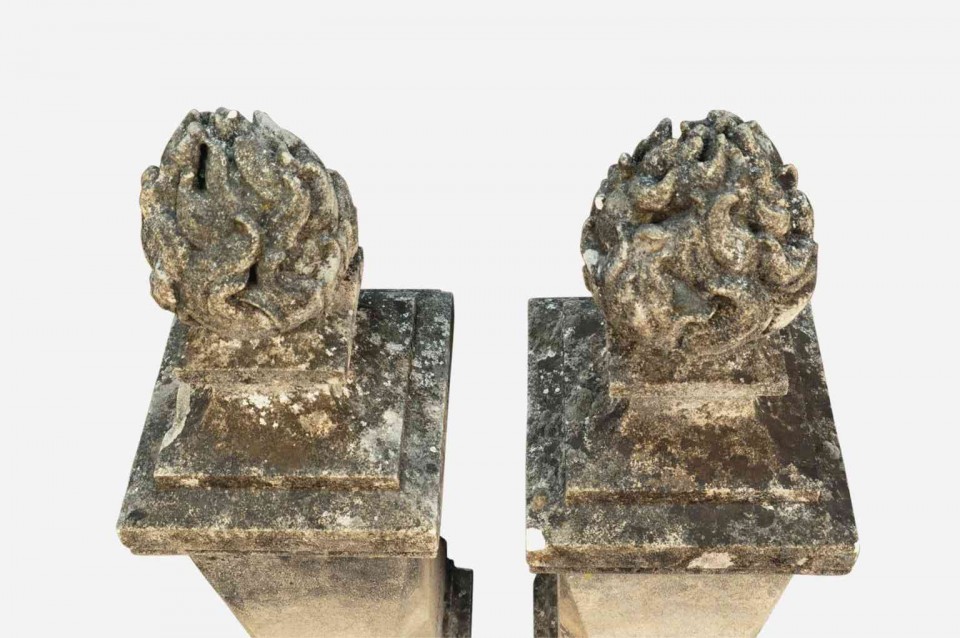 An outstanding pair of 19th century flambeaux finials - flame finials from France. Masterly carved with a fantastic patina. Not only fabulous as a garden decoration, but as an interior accent as well.