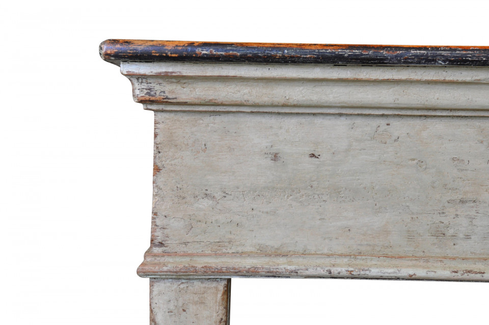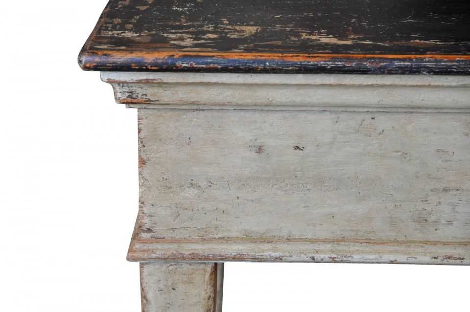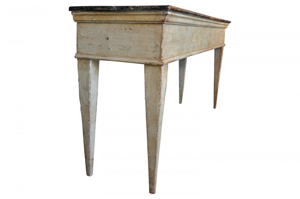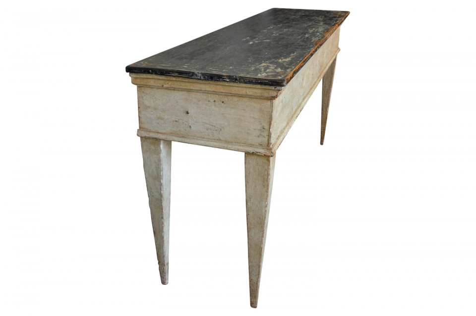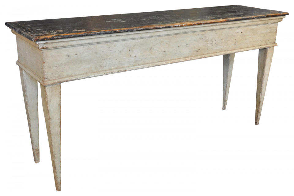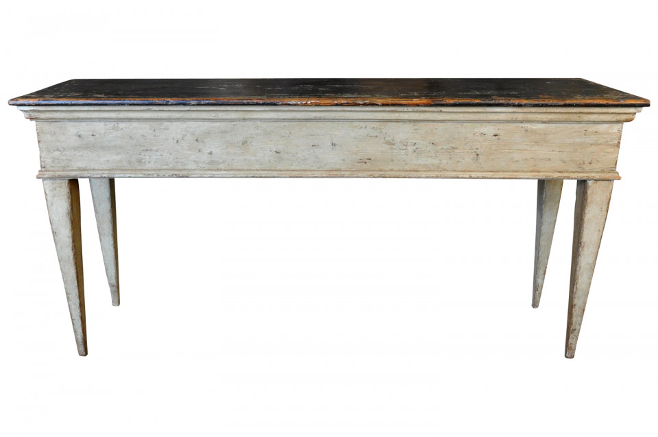 A very striking painted console from Spain. This console is beautifully constructed from 19th century elements and has a wonderful painted finish - terrific patina and texture - in hues a soft sage with an almost black top surface. An excellent piece for any living or dining area.