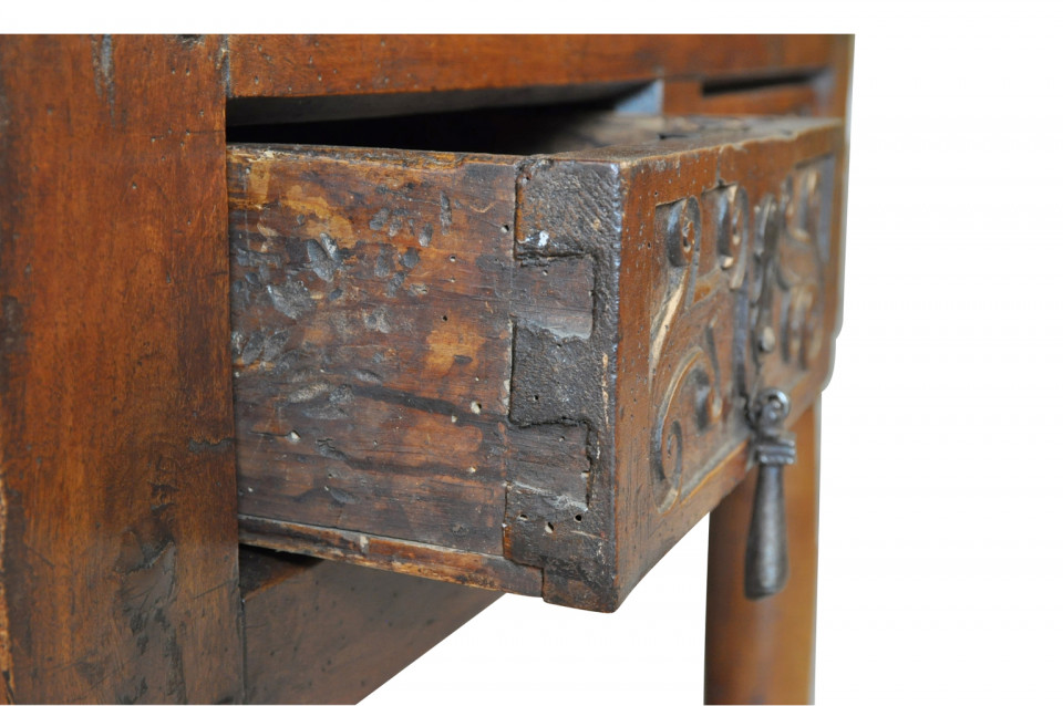A very handsome and very sound 17th century side table from the Catalan region of Spain. Wonderfully constructed from beautiful walnut with a tremendous solid board top, two drawers and substantial turned legs. Wonderful patina, rich and luminous.