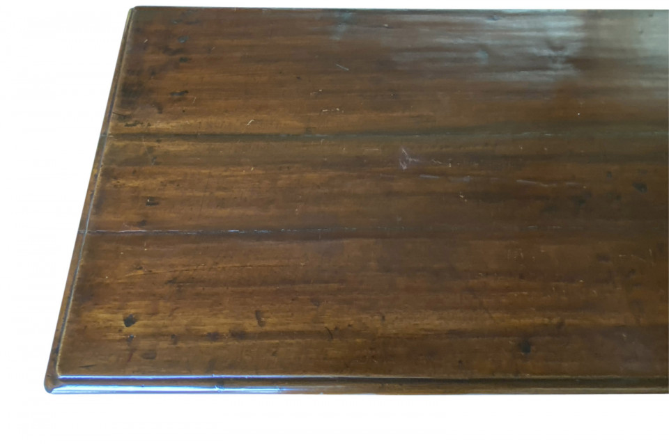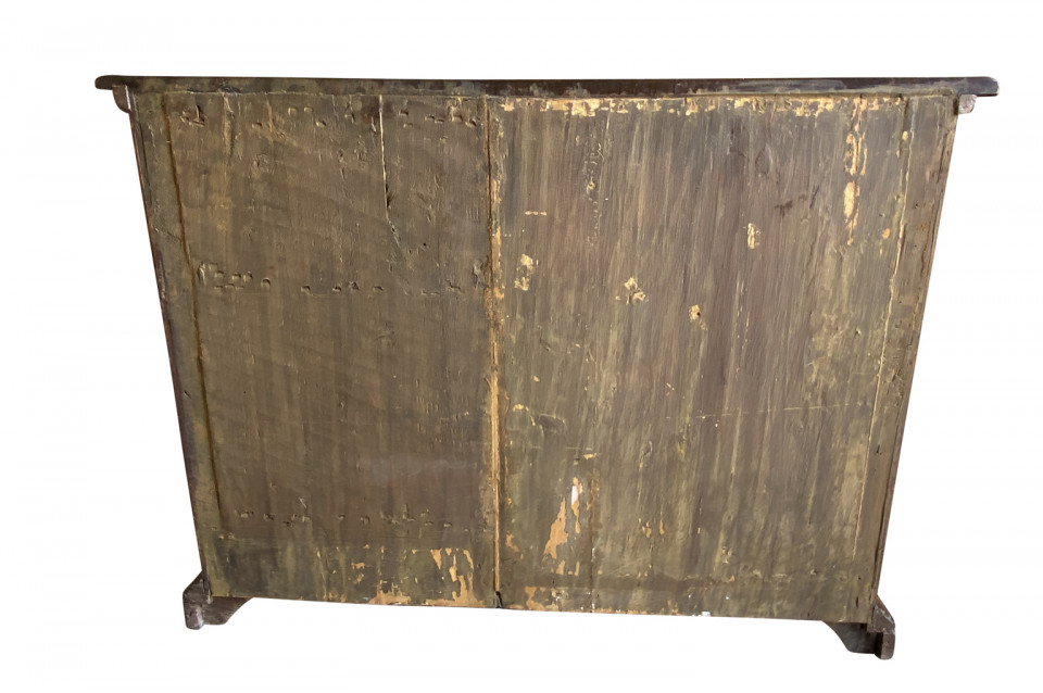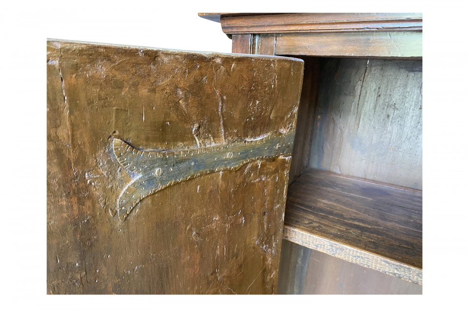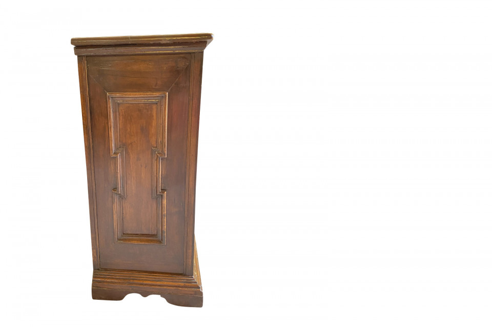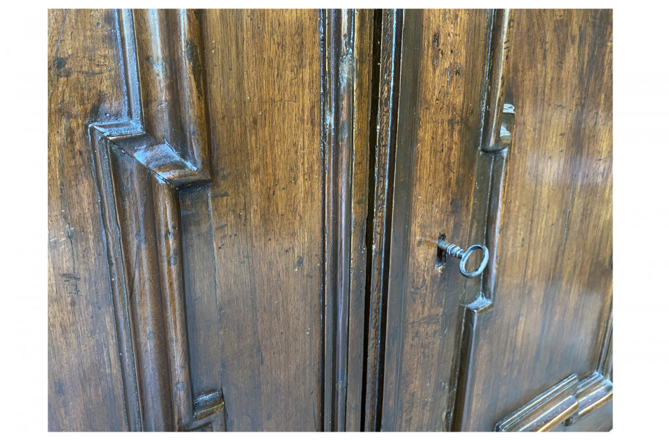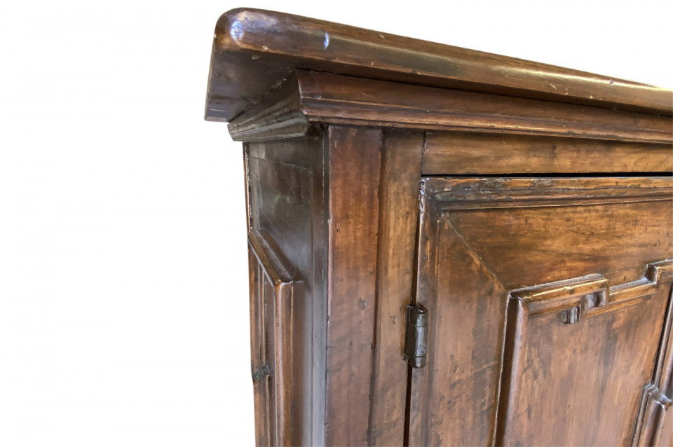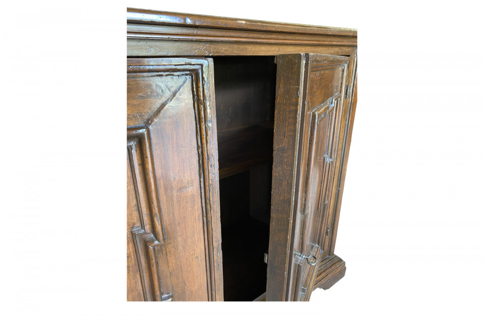 A very handsome 18th century two door credenza from Florence, Italy in walnut with a rectangular top with slightly overhanging apron above a conforming case housing two doors each with carved raised panels raised on shaped bracket feet.