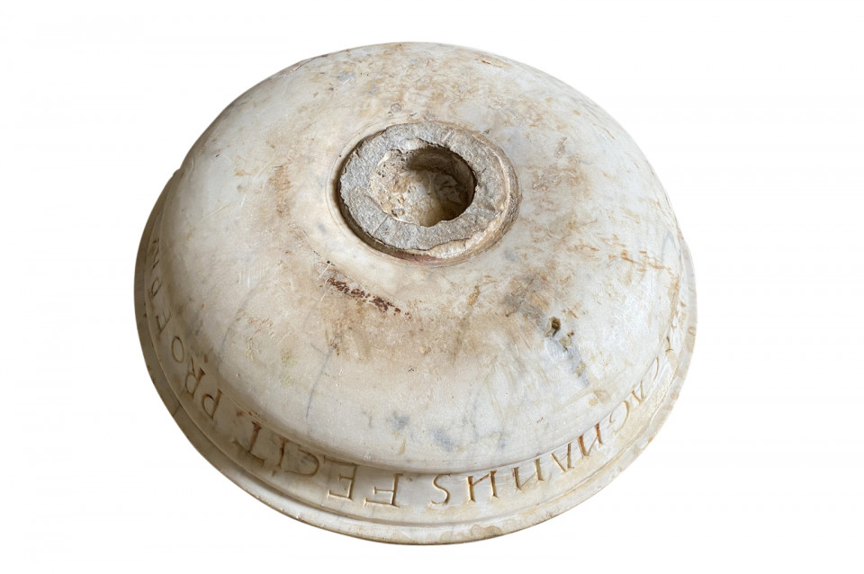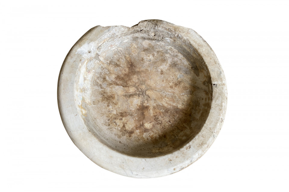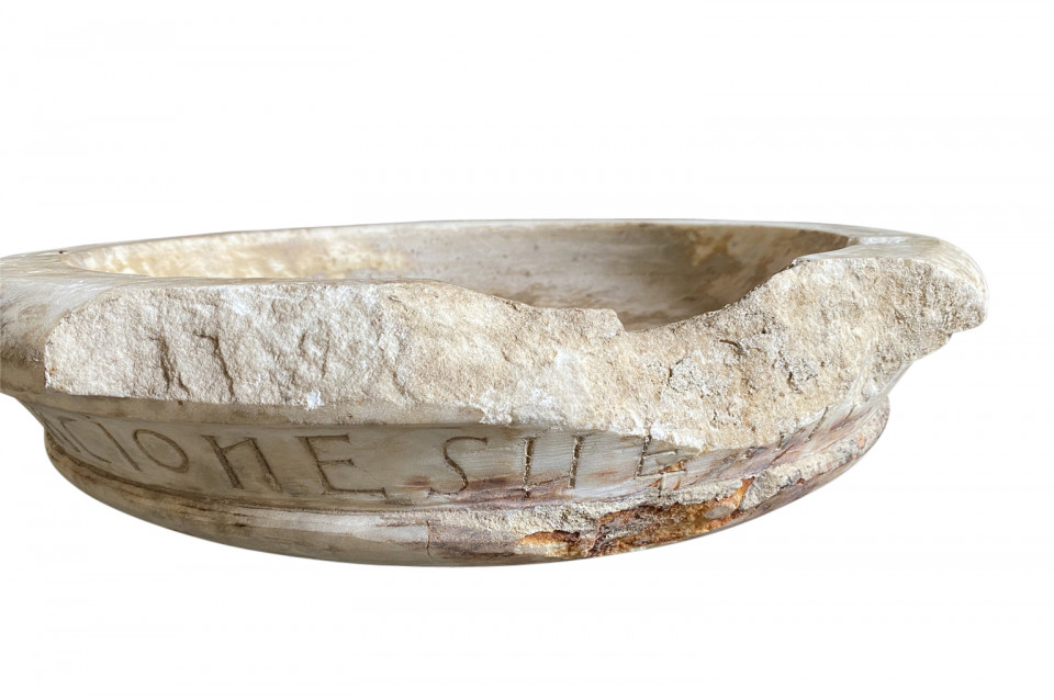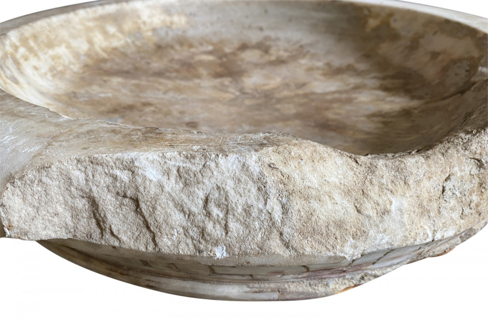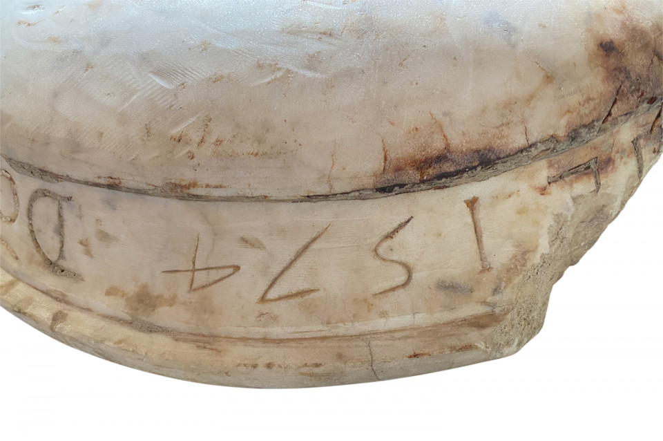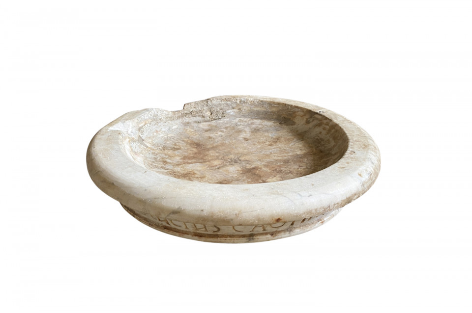 A very beautiful 16th century Italian Holy Water Font masterly carved from carrara marble in a very minimalist shape. Dated 1574. Wonderful as a countertop vessel or birdbath.