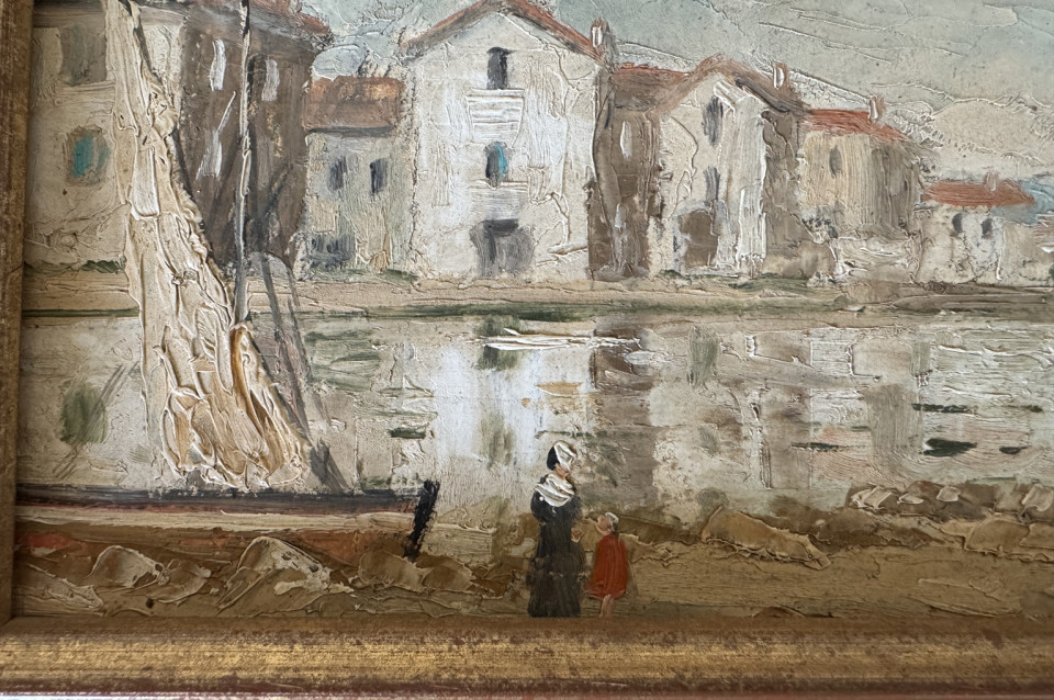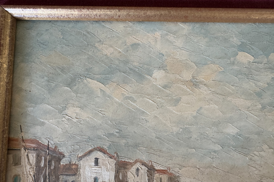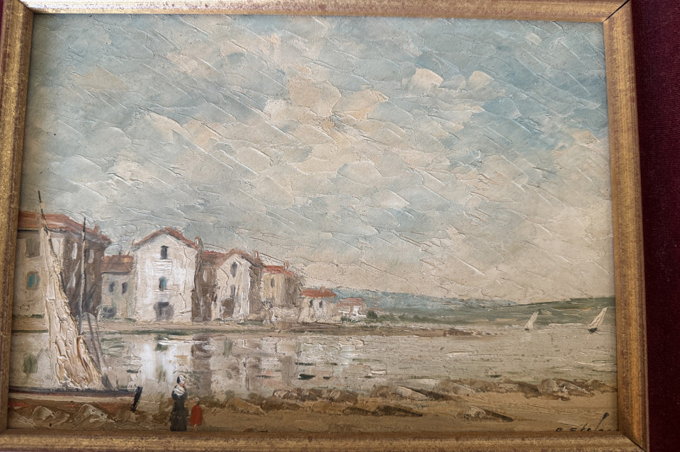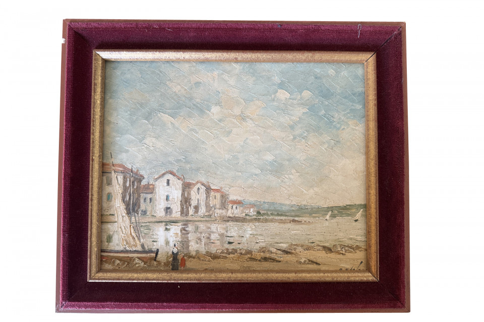 A very lovely early 20th century Oil On Board Painting from the South of France. A charming village port scene with sailboats. Beautiful and soothing coloration and wonderful brushwork.