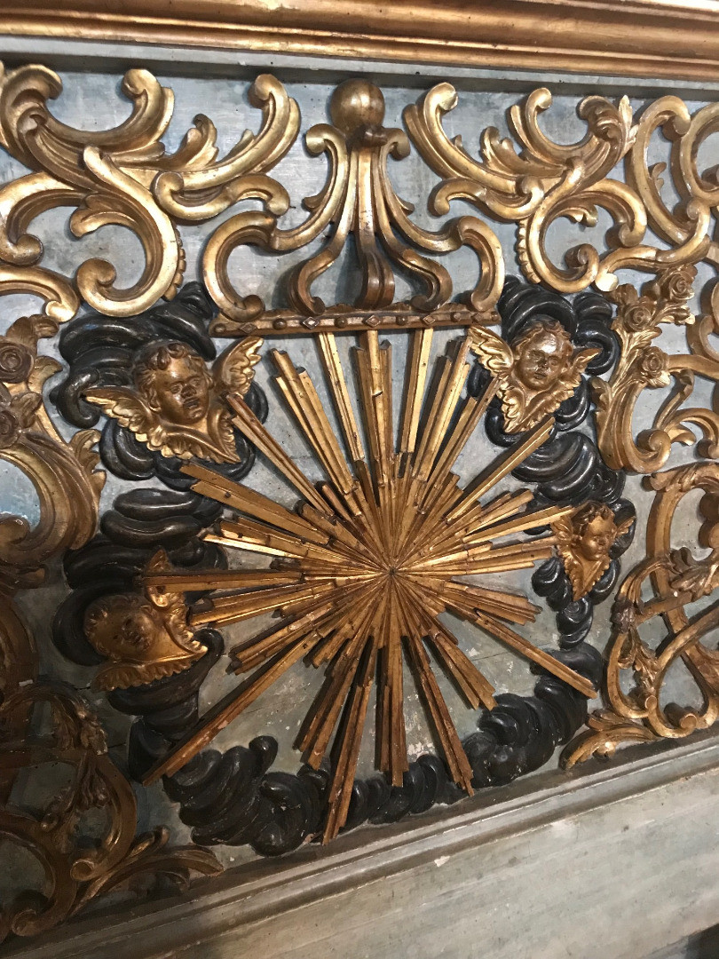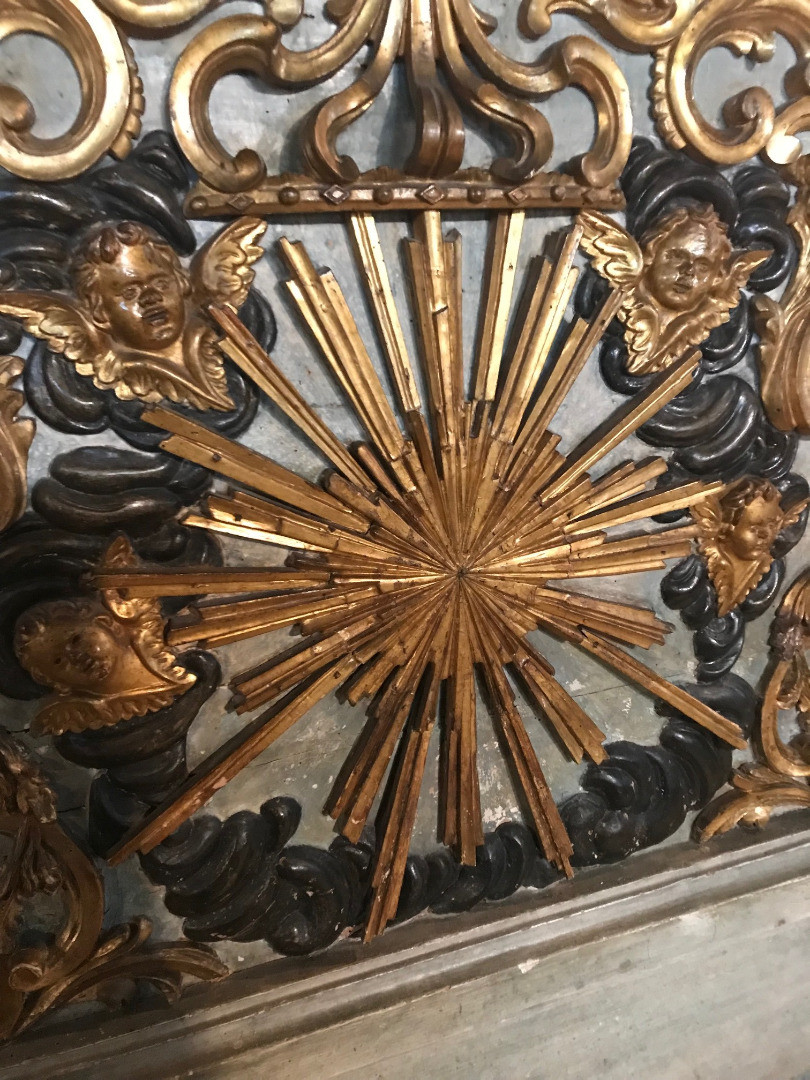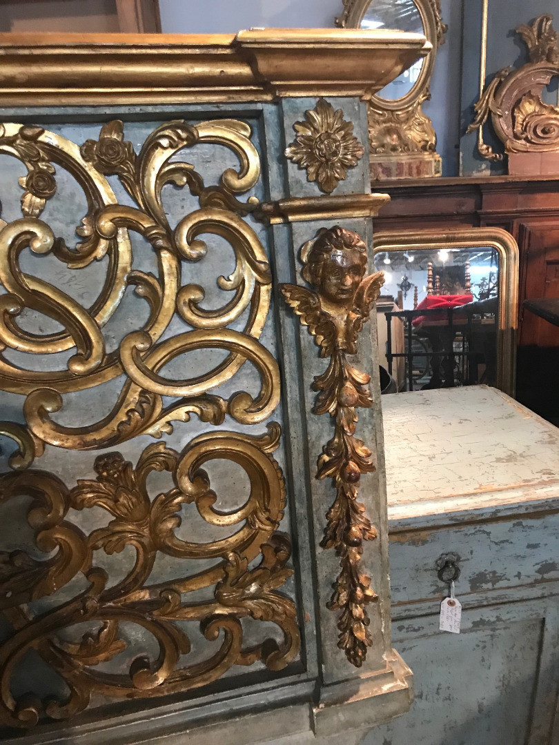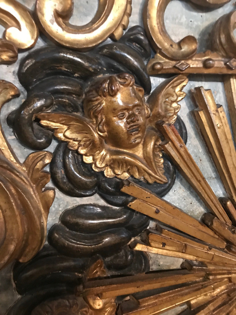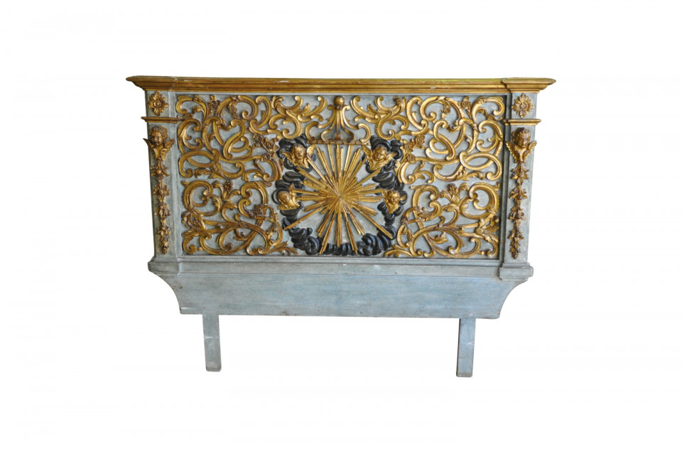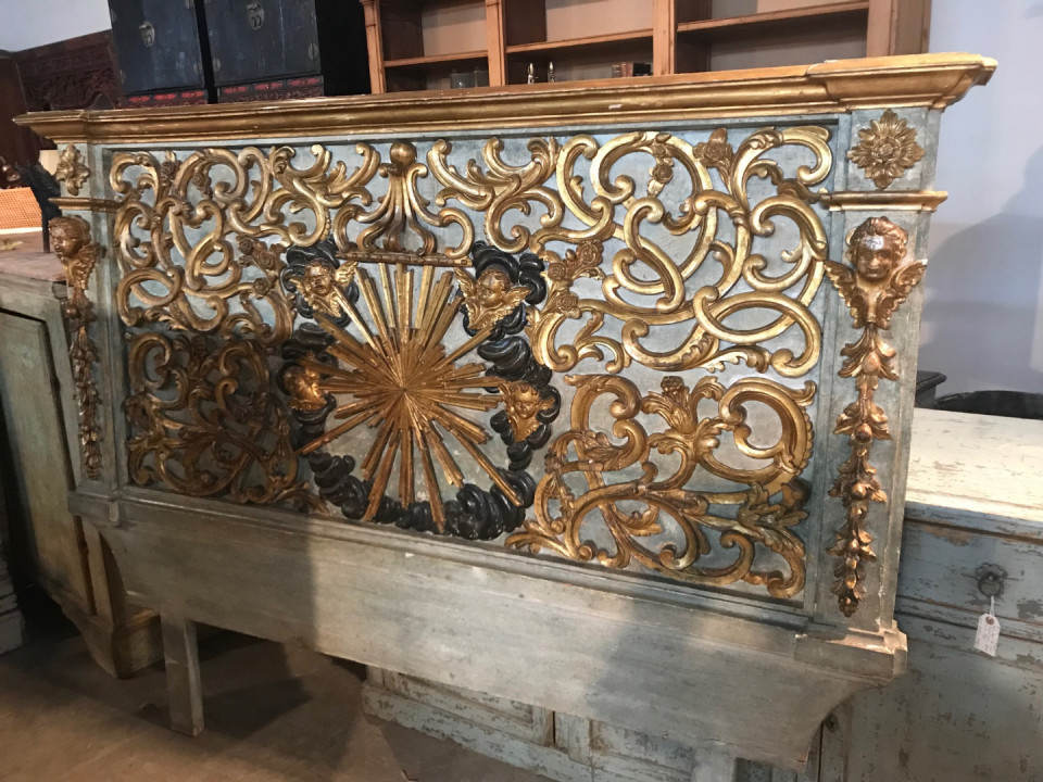 A sensational 17th century Boisserie Panel from the Veneto region of Italy. Beautifully constructed from polychromed and gilt wood with a sunburst surrounded by putti and clouds. The panel has since been converted into a headboard.
