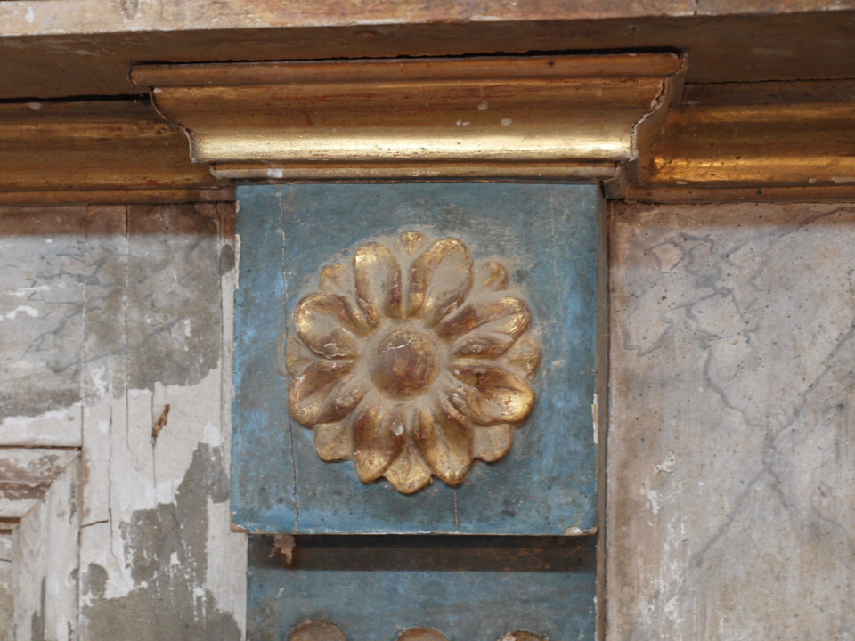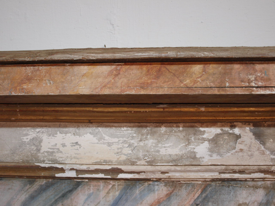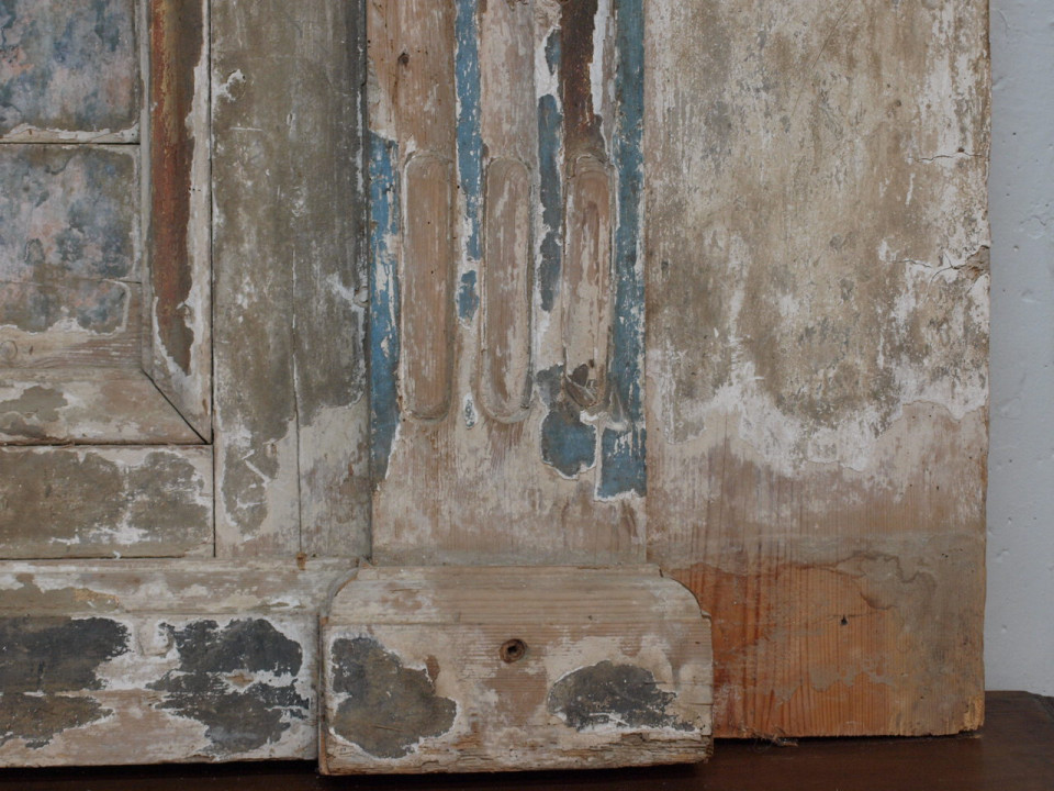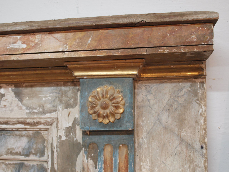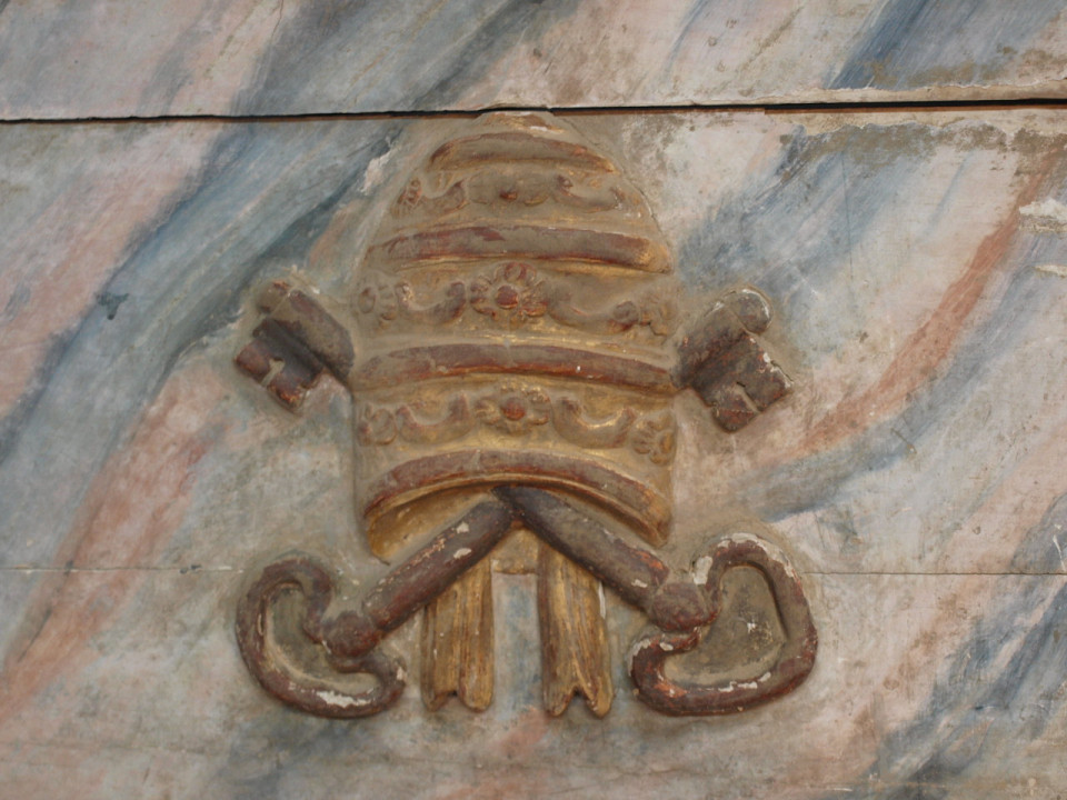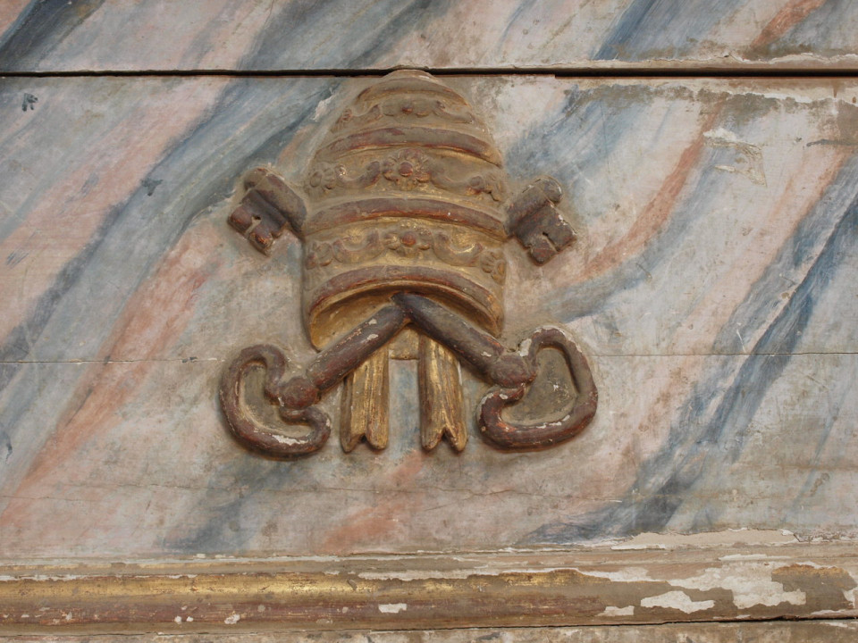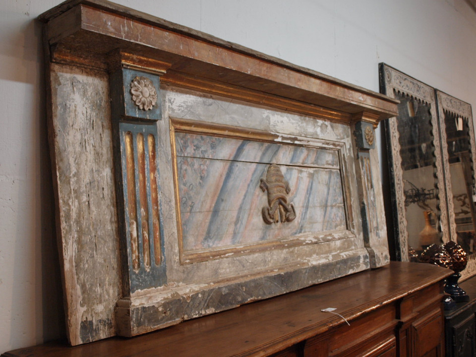 A stunning 18th century Altar Facade from Portugal in polychromed wood. The facade is beautifully decorated with the MITRE - the headwear worn by a bishop and the "Keys To The Kingdom". This architectural element is a wonderful piece that can easily be converted into a console, or a terrific headboard.