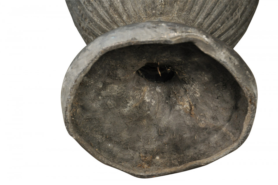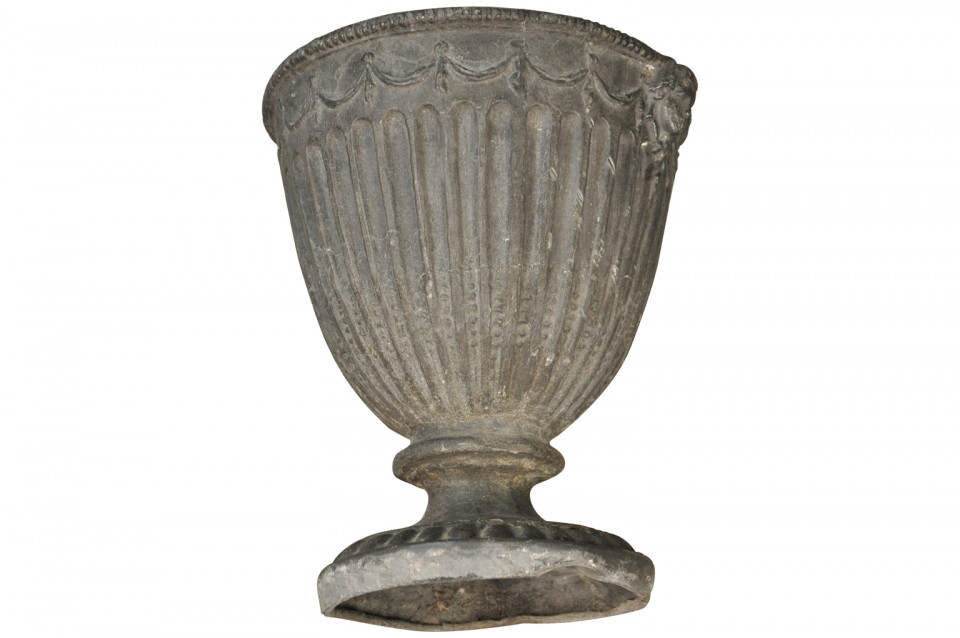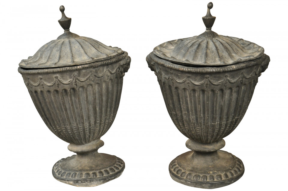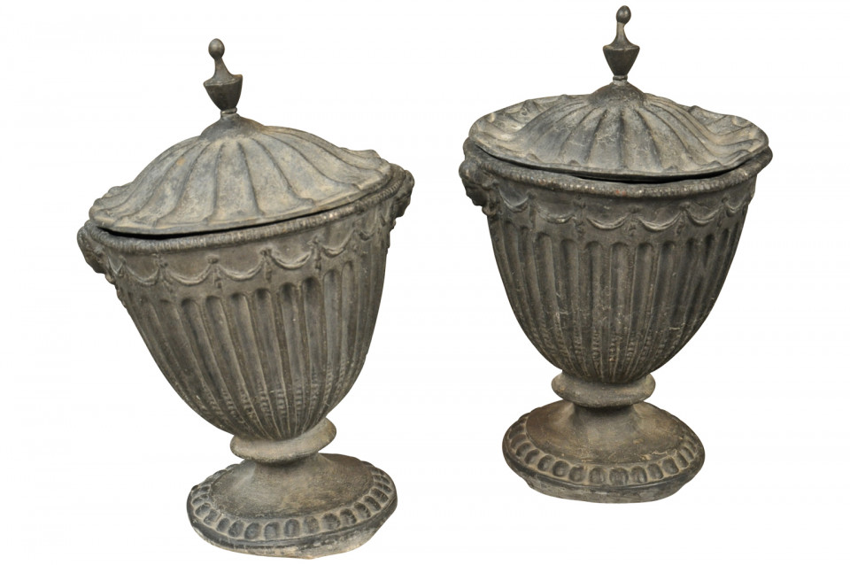A stunning pair of 18th century English lidded urns handsomely crafted from lead. Exquisite mantel or table top decoration. Wonderful as garden accents as well.