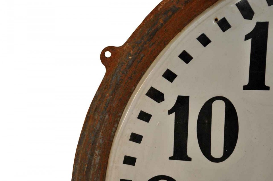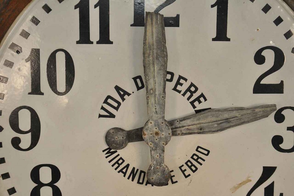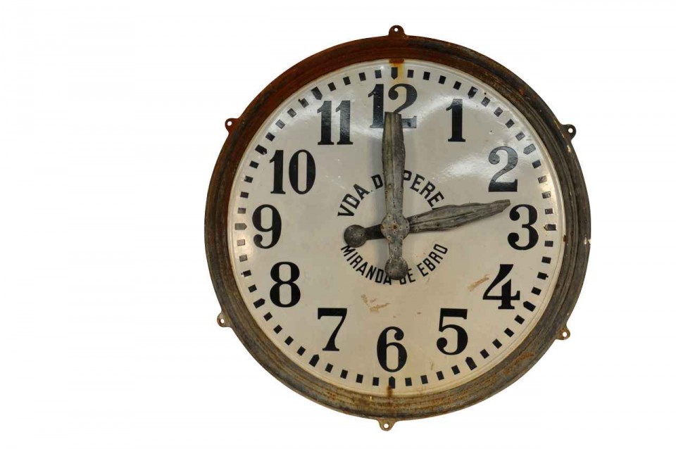 Late 19th century decorative enamel clock face from Miranda De Ebro, Spain - in the province of Burgos. This wonderful clock face is constructed from from iron with an enamel face and zinc arms. A terrific art piece!