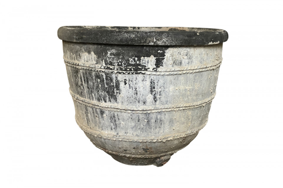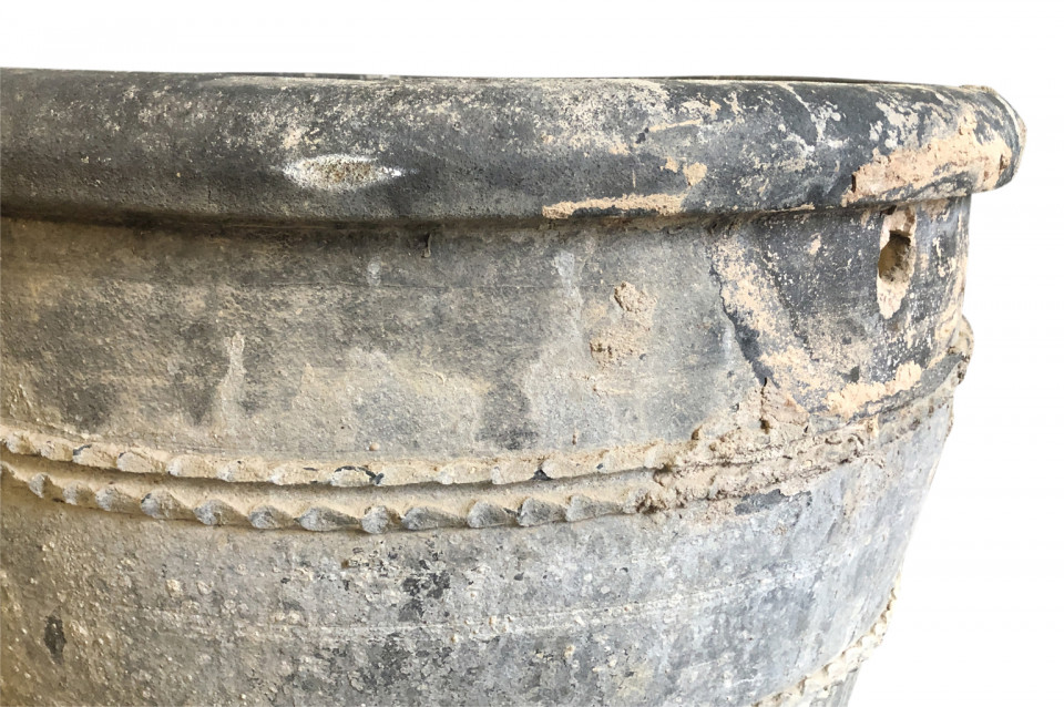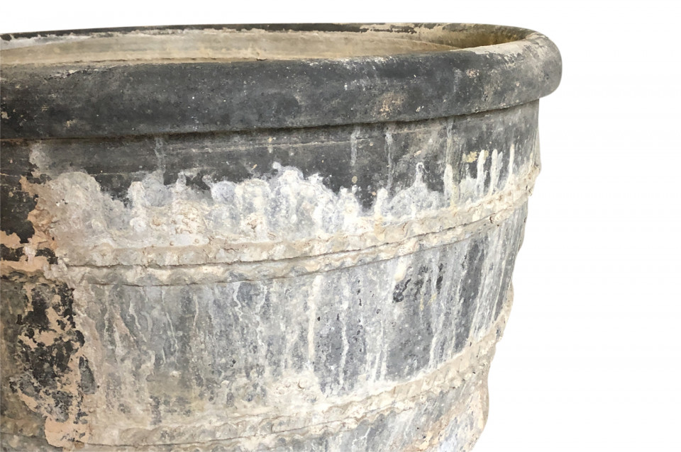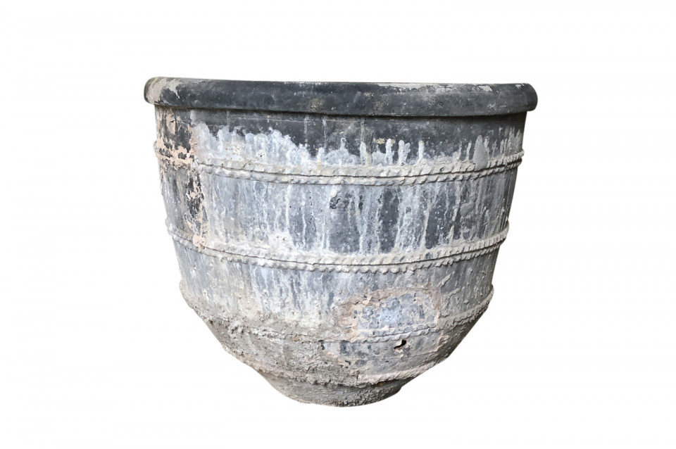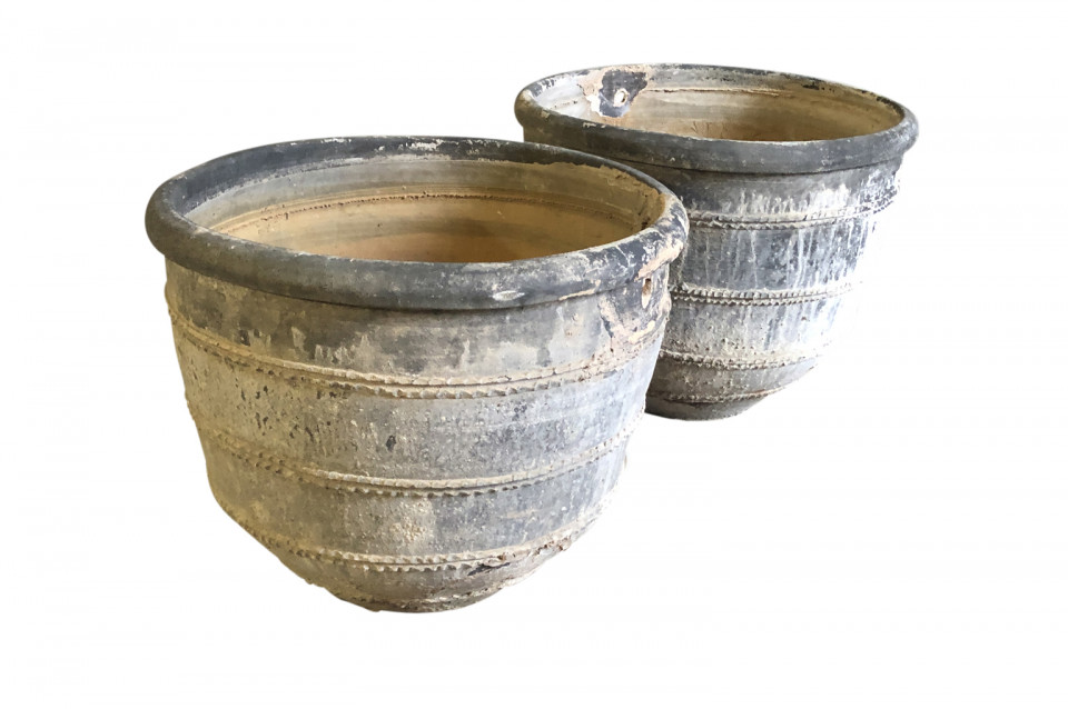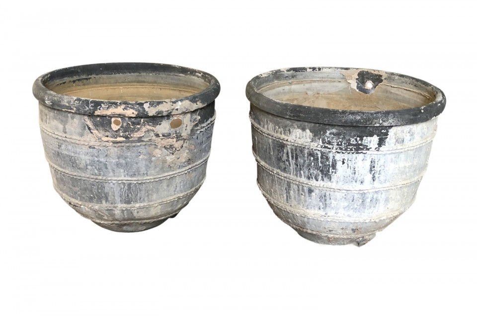 A rare and stunning pair Black Terracotta Urns from the Girona area of Spain. Beautiful patina and condition. Wonderful planters for any interior of exterior. One urn measures 26 1/4" H X 30 3/4" diameter. The second urn measures 26 1/4" H X 31 3/4" diameter.