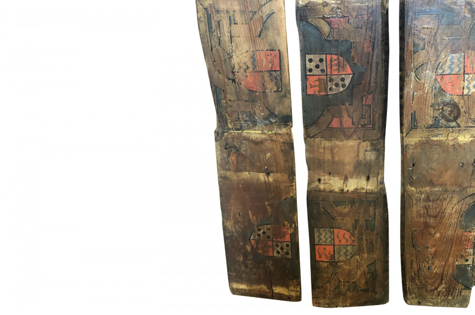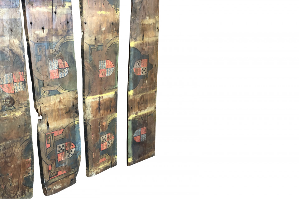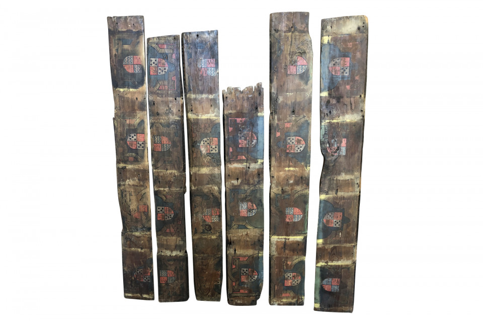 A wonderful collection of 6 XVth century Spanish Coffered Ceiling Fragments in polychromed wood decorated with heraldic family shields. Wonderful architectural elements to incorporate into paneling or a ceiling. The sizes vary from 38" to 47 1/4" in length.