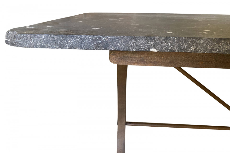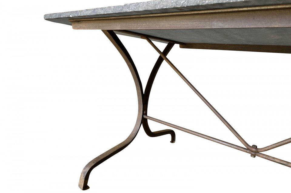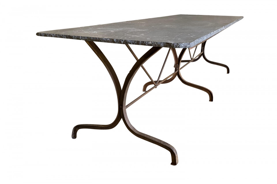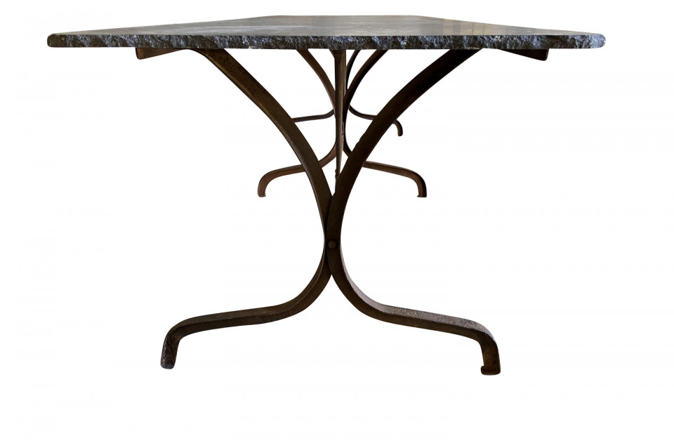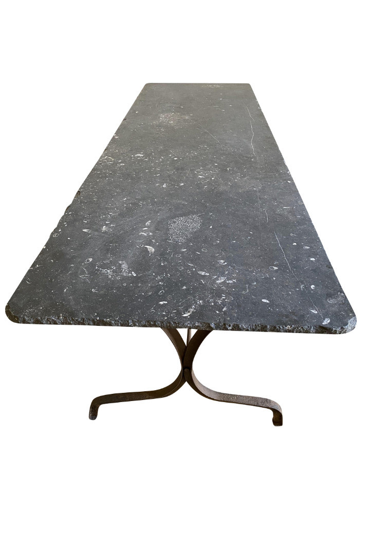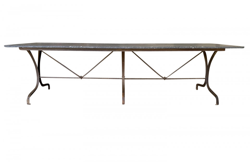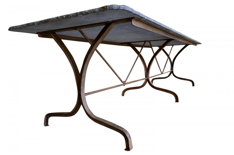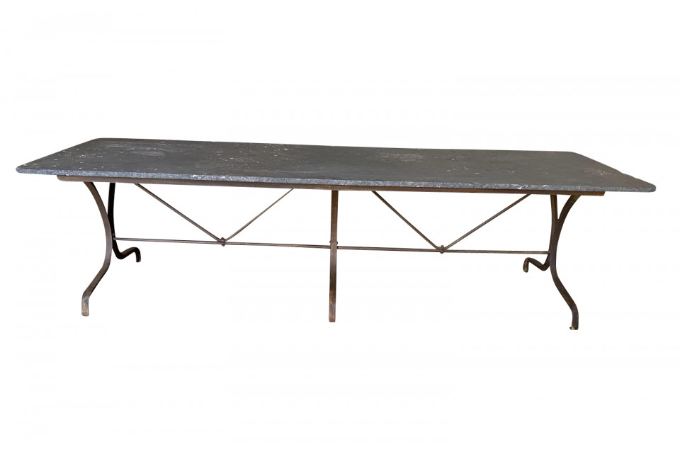 A terrific 19th century Garden Dining Table from the Provence region of France. Soundly crafted from iron and a wonderful blue stone top. Super patina. A fabulous table for large gatherings. Arriving May 2021.