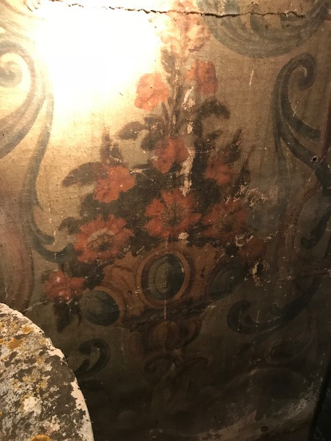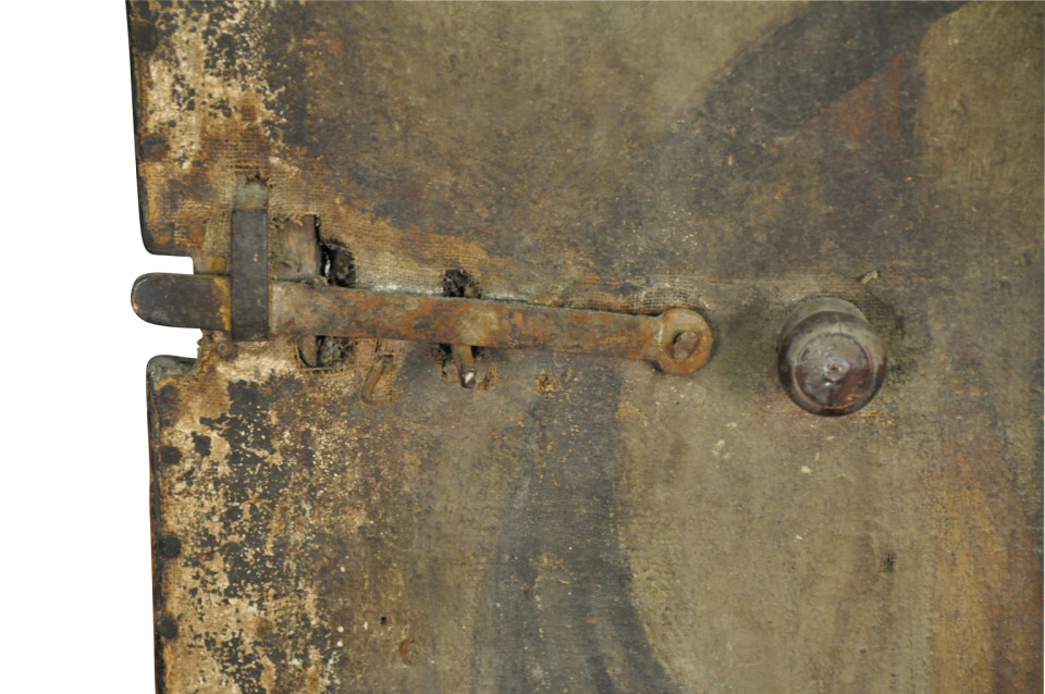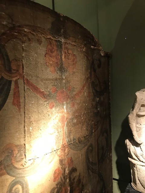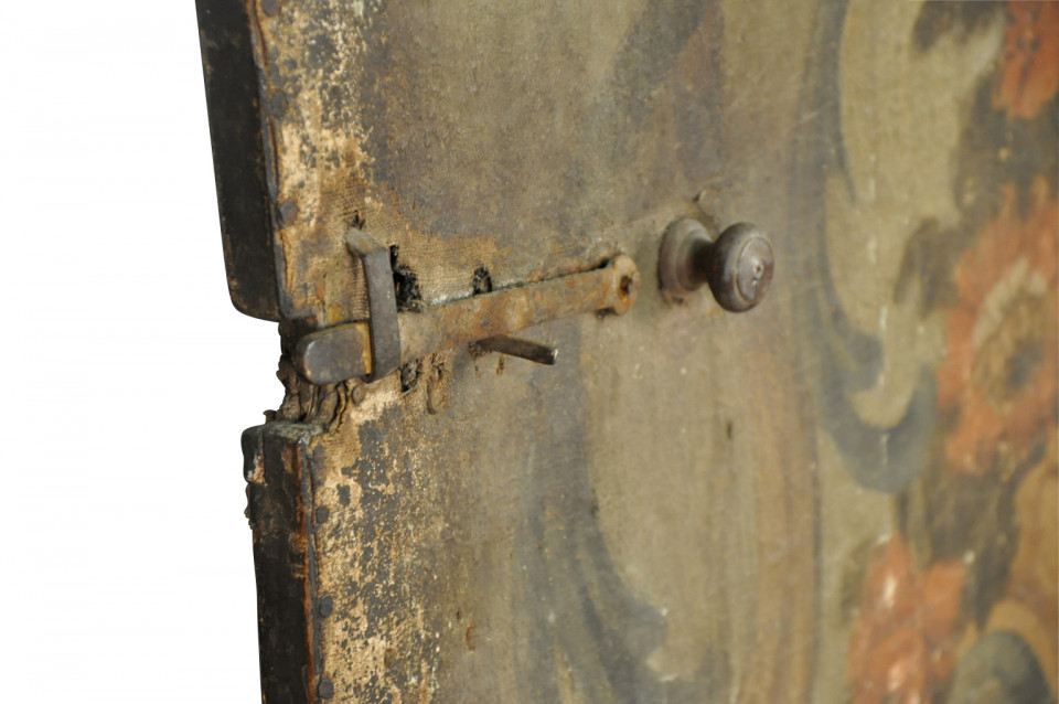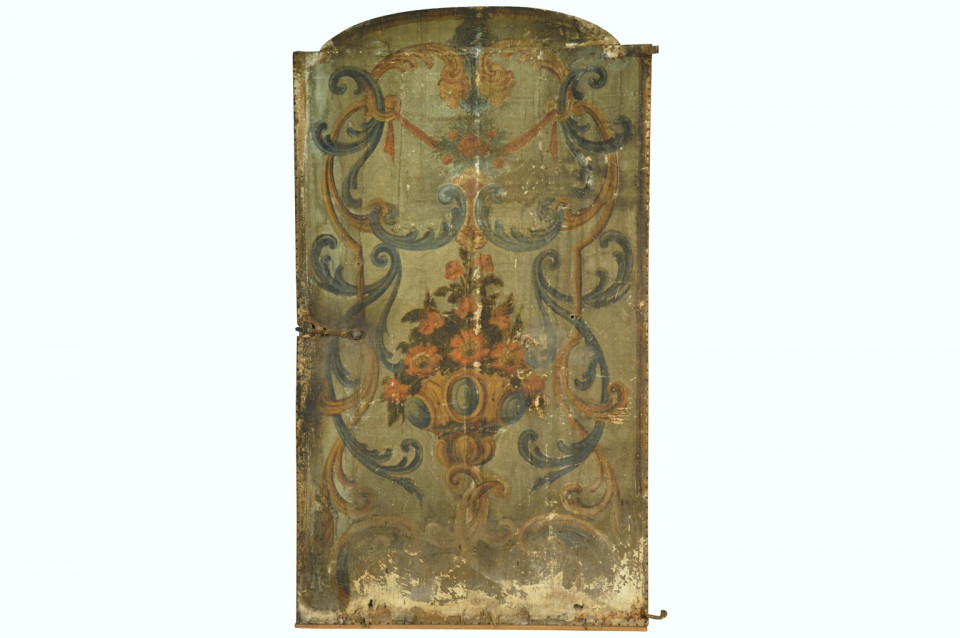An exquisite and rare 17th century double sided Palazzo Door from Venice, Italy. This sensational door is constructed with a wooden frame, canvas sides and its iron hardware. Two different beautiful oil paintings adorn the sides of the door. A stunning architectural accent.