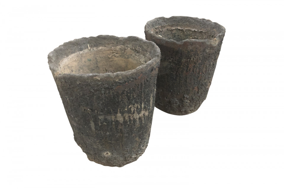 A wonderful pair of earlier 20th century French Foundry Pots - Creusets. Fabulous as jardinieres or planters. Perfect for any interior or garden. A crucible was made from a material with a much higher melting point than what was going to be melted in it. The pots absorb some of that material resulting in terrific texture and patina.