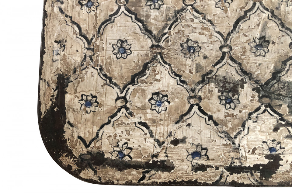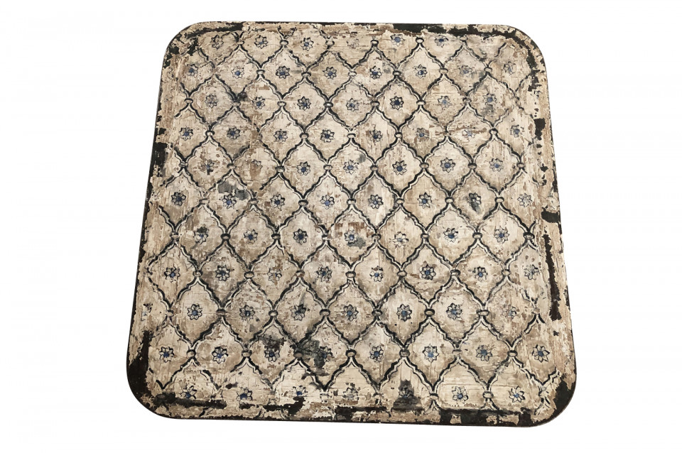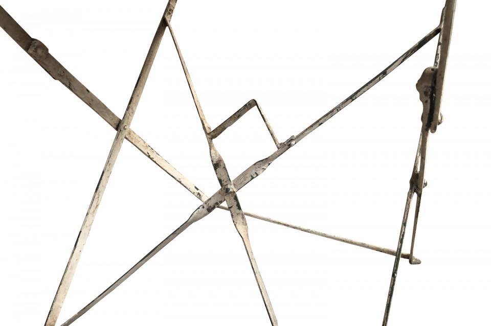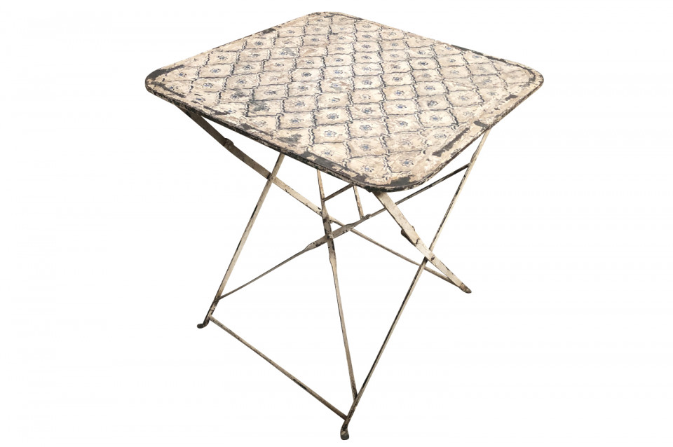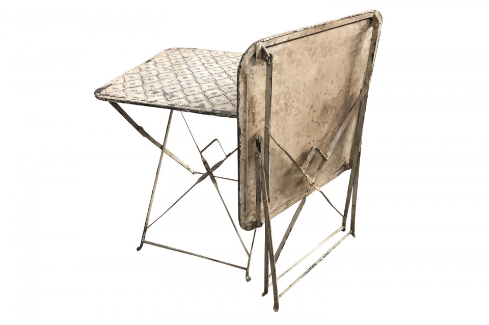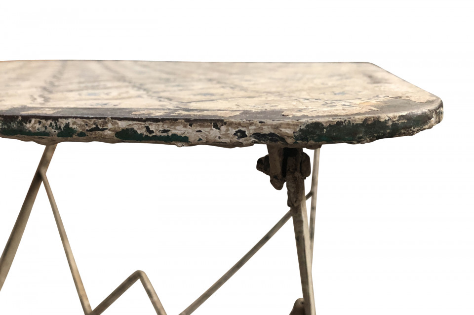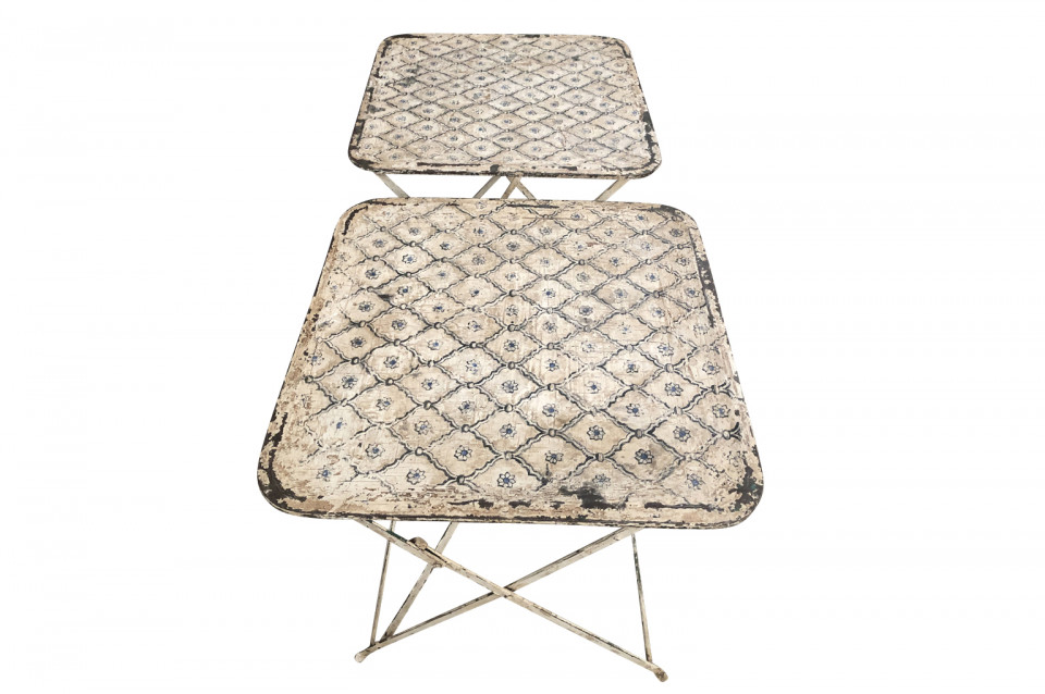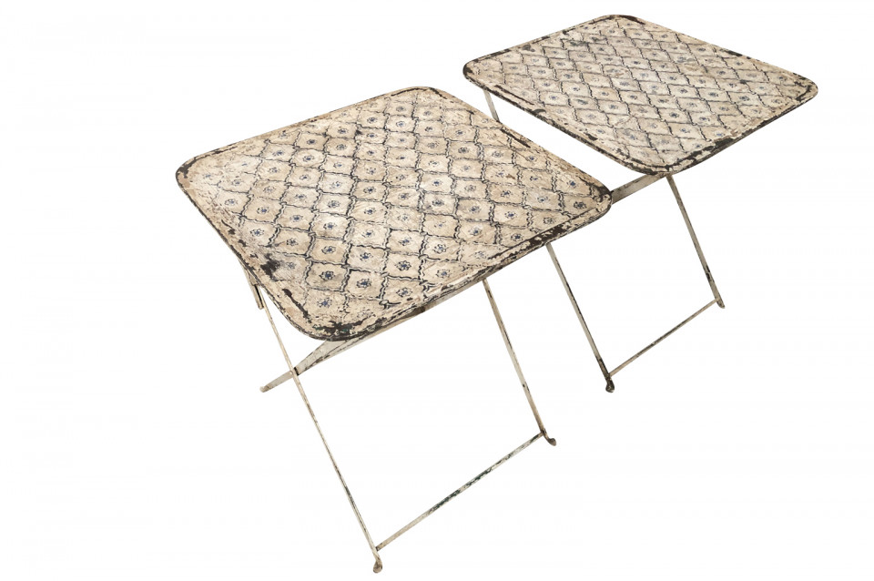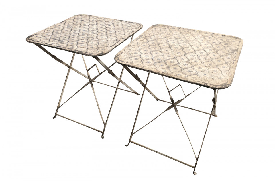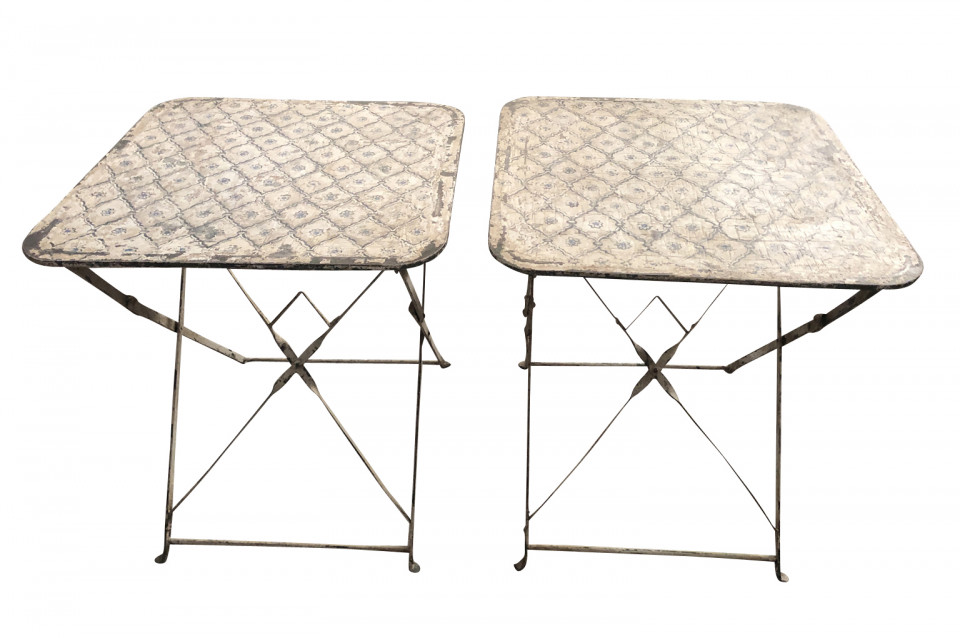 A delightful pair of later 19th century collapsible French garden tables in painted iron. Wonderful motif and painted finish. Perfect end tables, or smaller bedside tables.