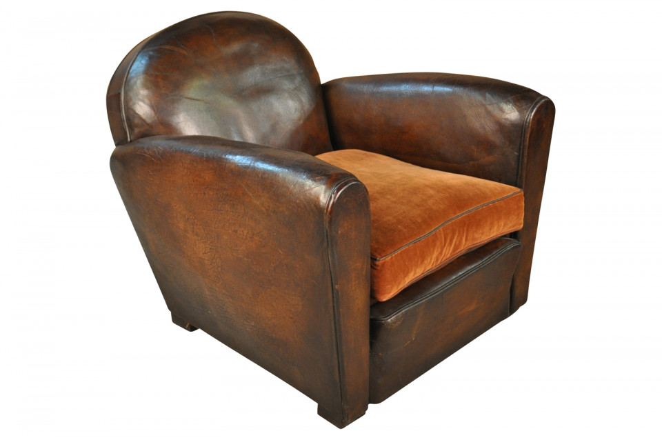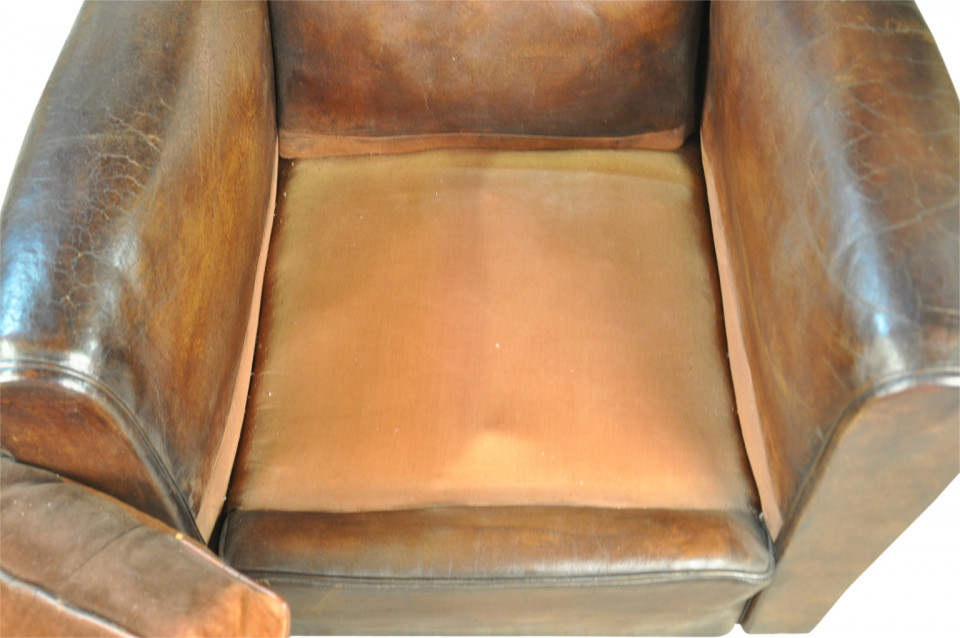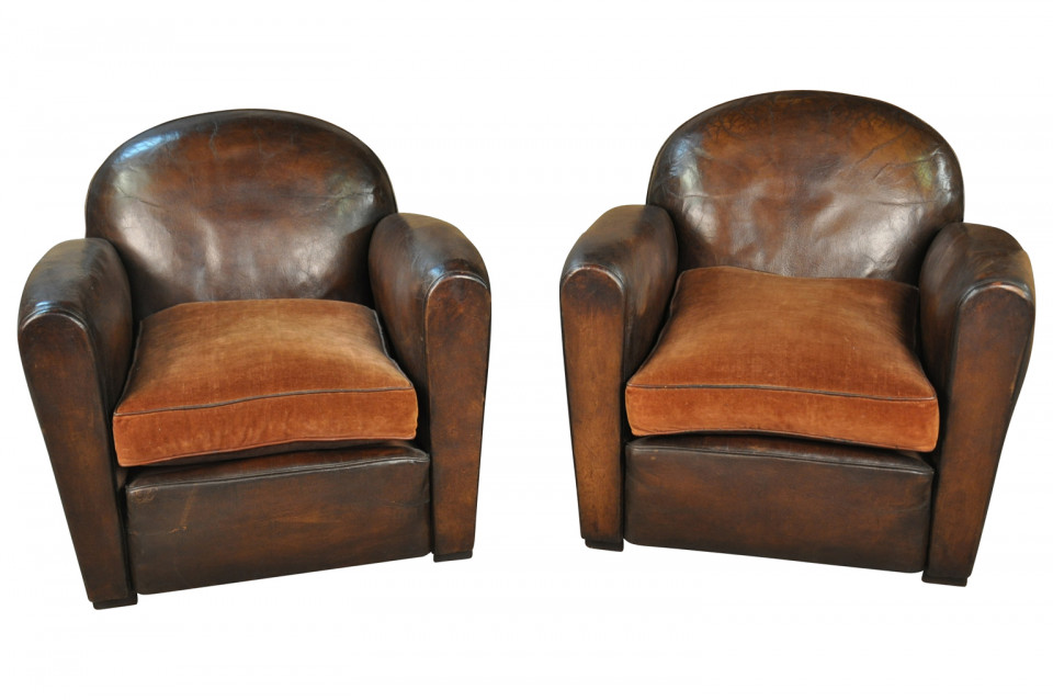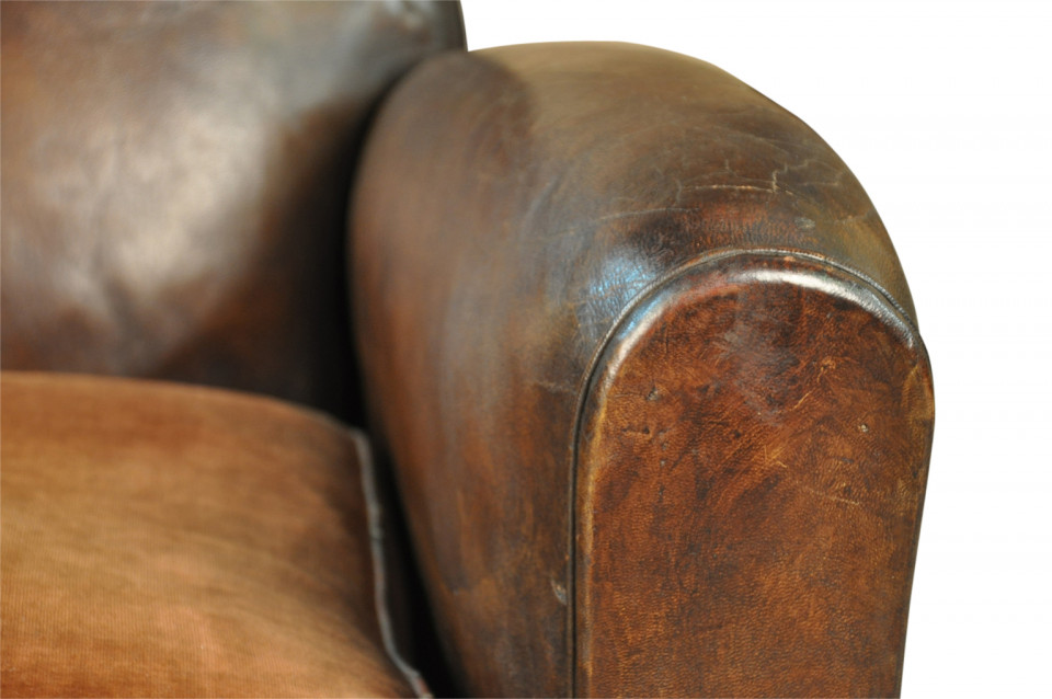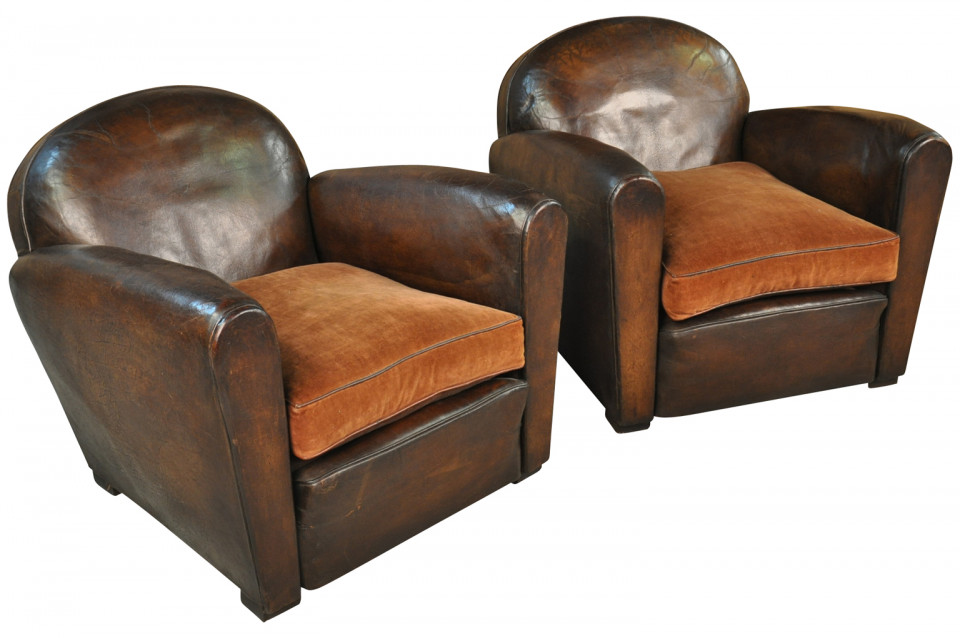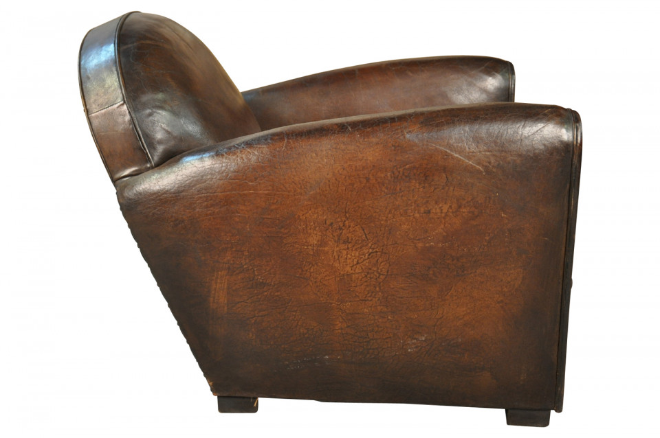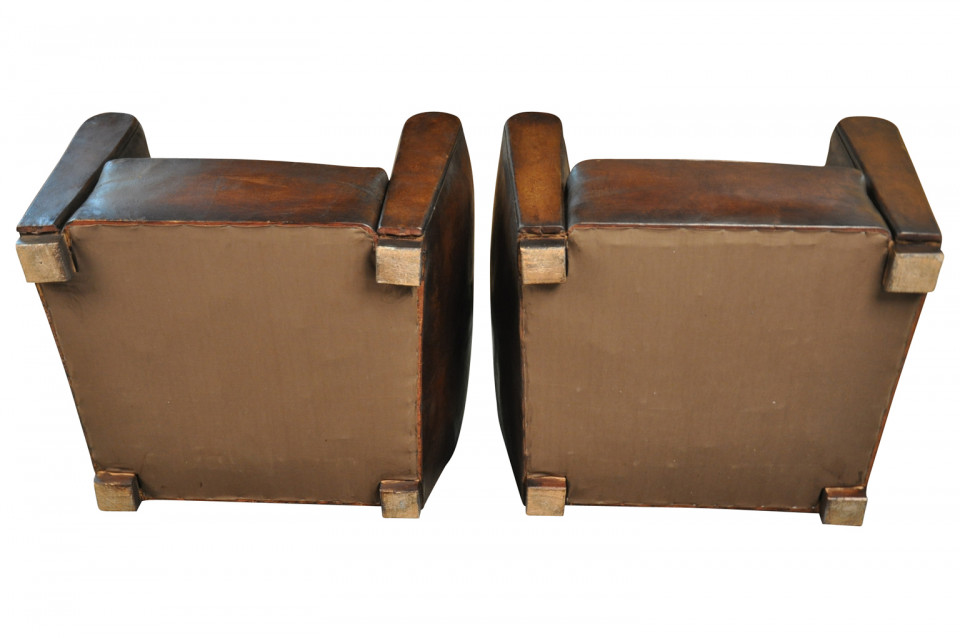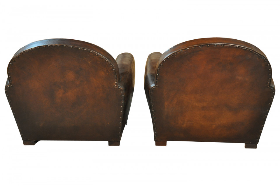 A sensational pair of French Art Deco Club Chairs in leather. Terrific form and patina. The seat height is 18".