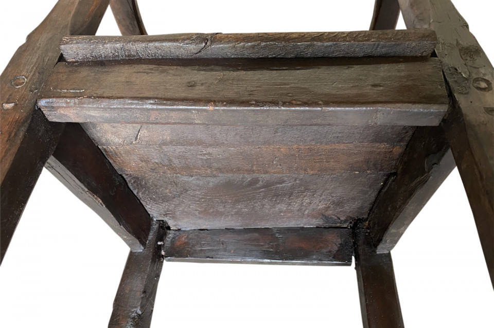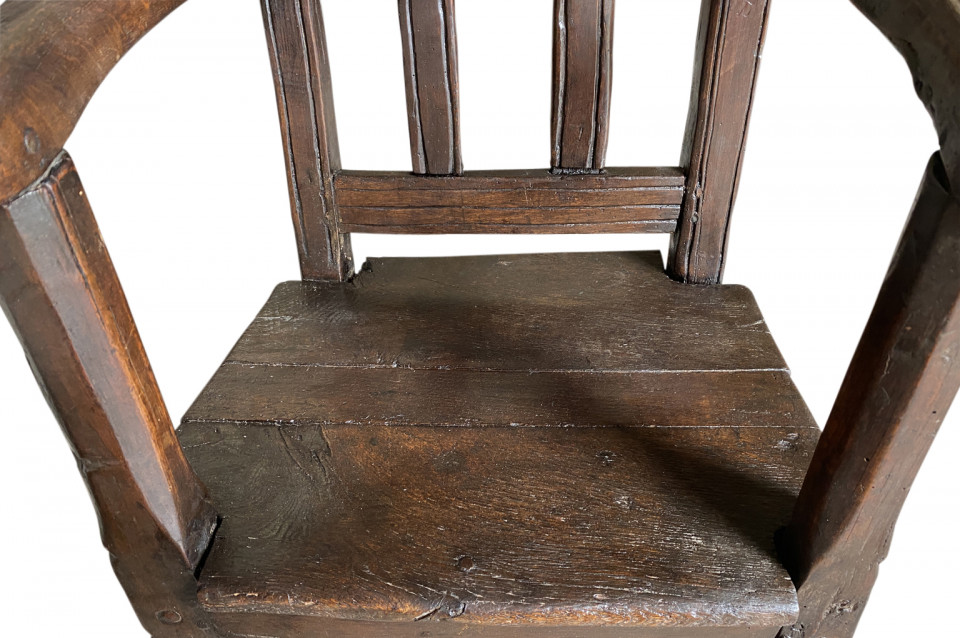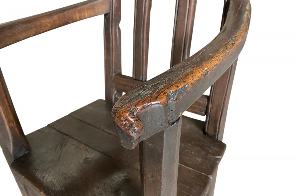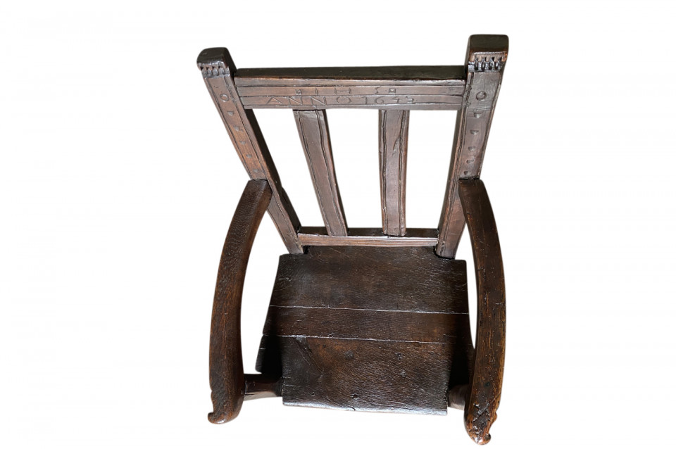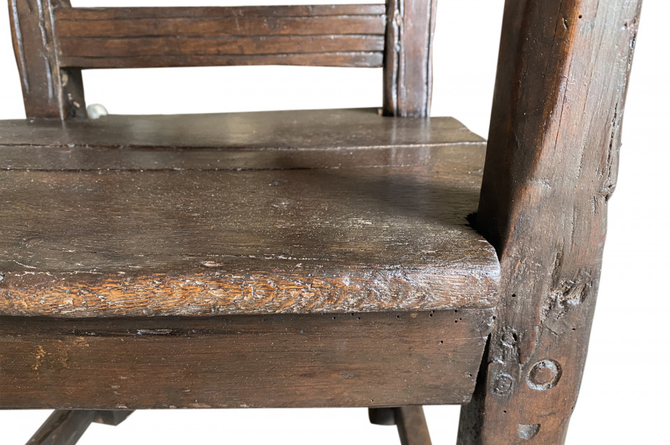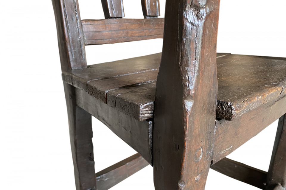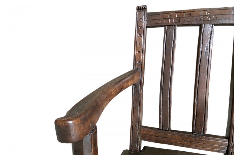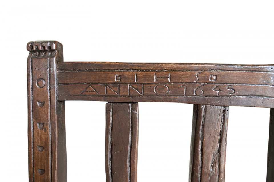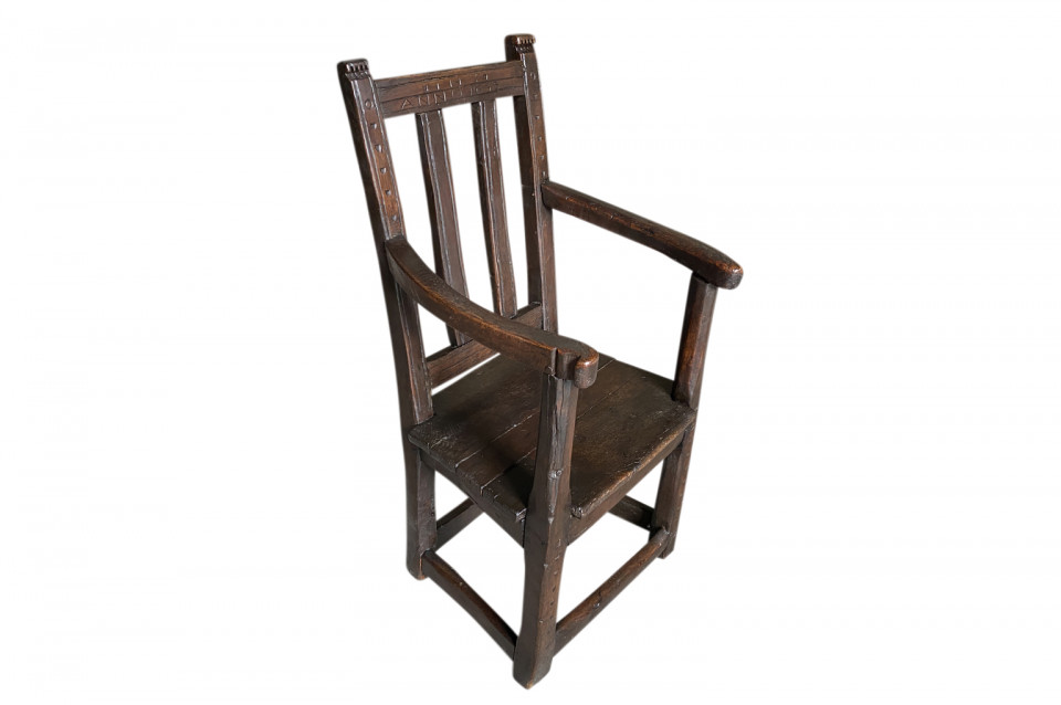 A very handsome 17th century armchair from Queyras, France. Soundly constructed from walnut and oak with curvilinear arms. This beautiful chair is dated 1645. The seat height is 15 3/4".