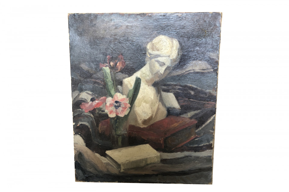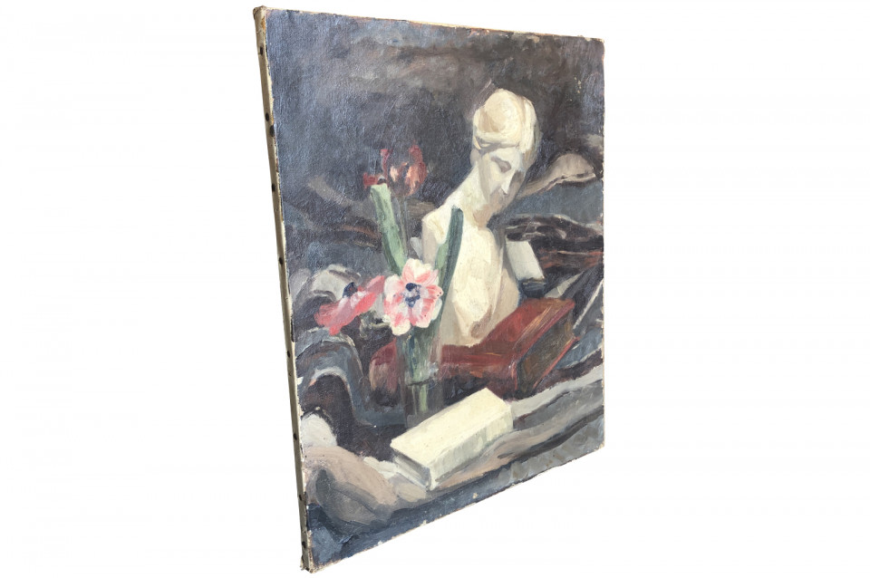 A very charming French early 20th century Nature Morte - Still Life. Oil on canvas, a charming grouping of a bust, flowers and books. Wonderful craquelure and brush work.