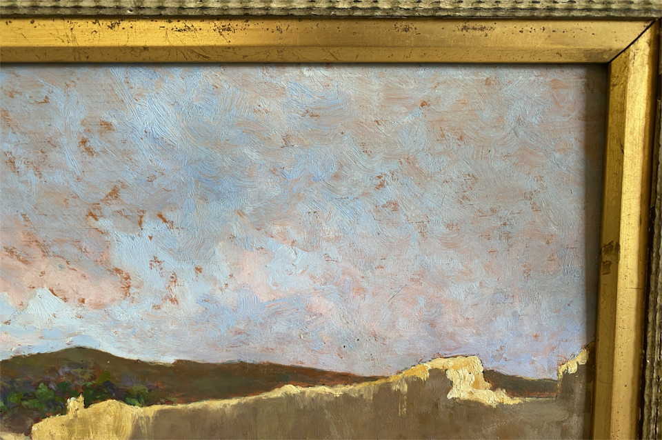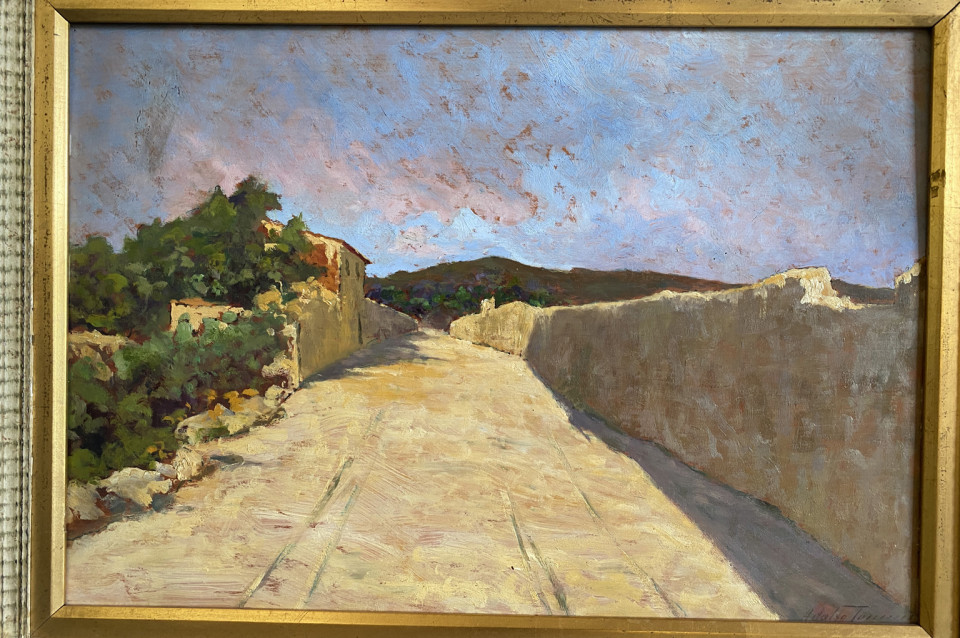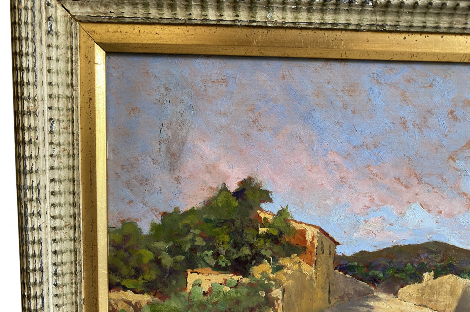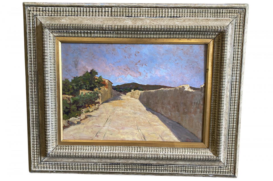 A very beautiful late 19th century - early 20th century oil on board painting entittled "Chemin Sous Le Soliel". The painting is expressing the intense heat of southwestern France - concentrating on the heat and the light. A wonderful piece of art housed in a handsome frame.