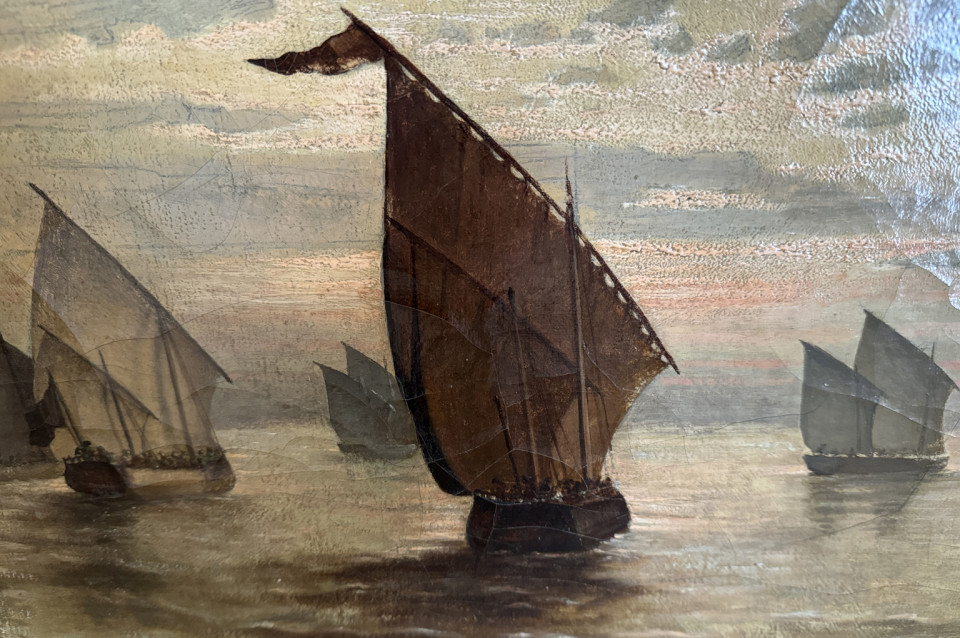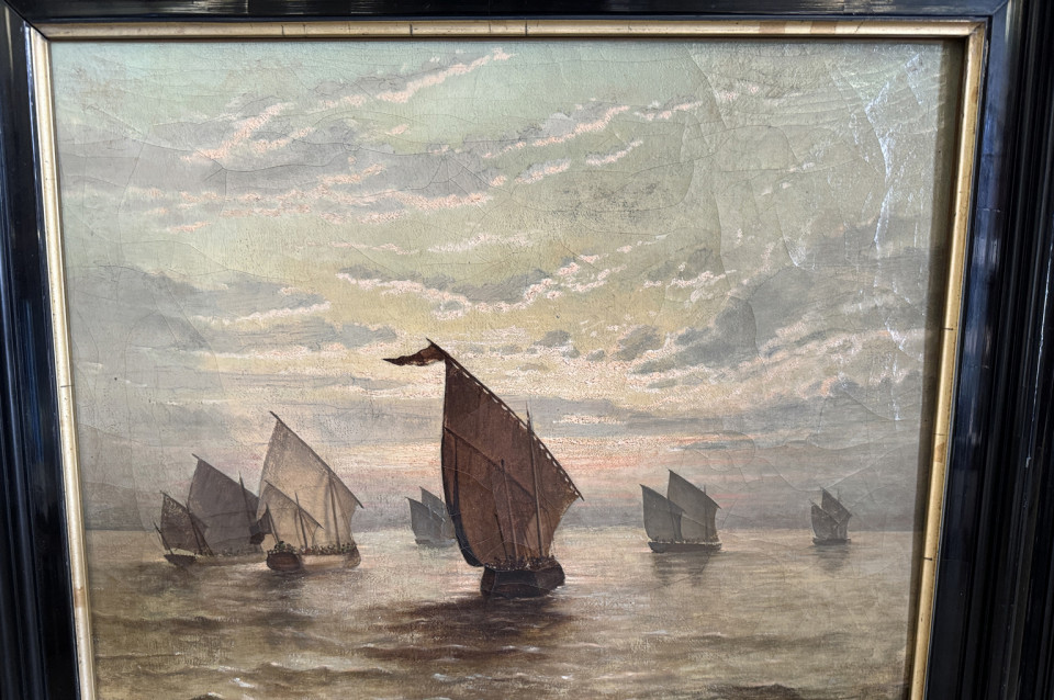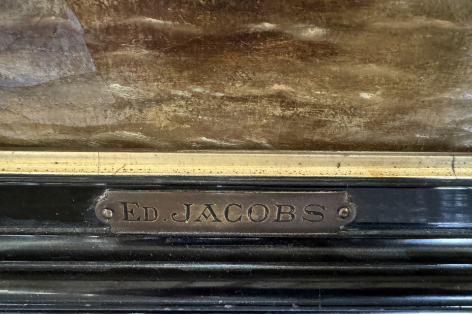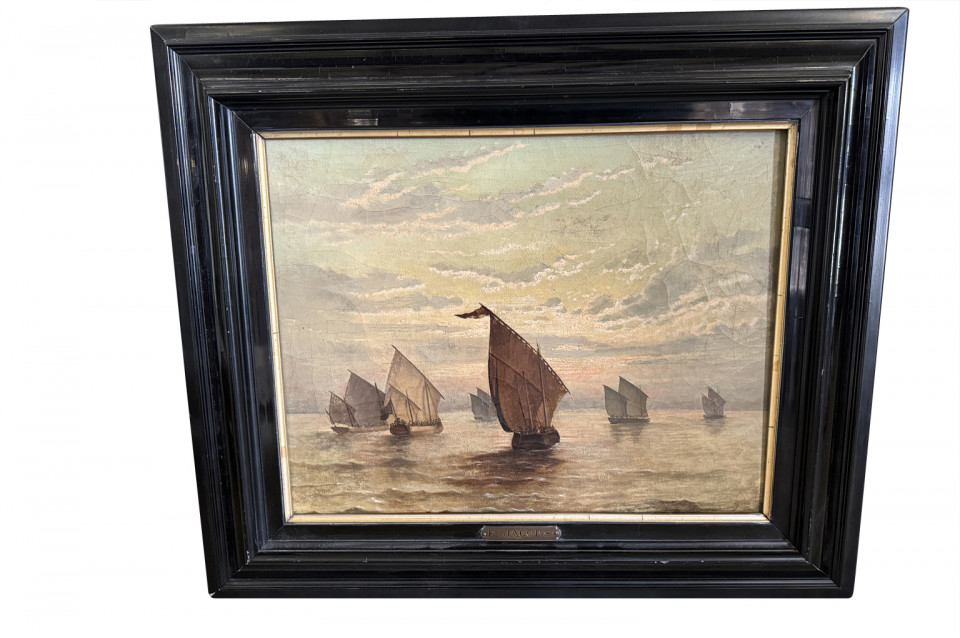 A very handsome late 19th century Dutch Oil On Canvas Painting by Ed. Jacobs housed in its ebonized frame depicting a marine scene with many sailing ships.