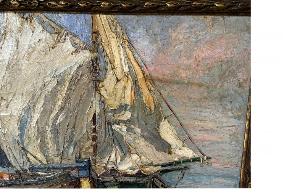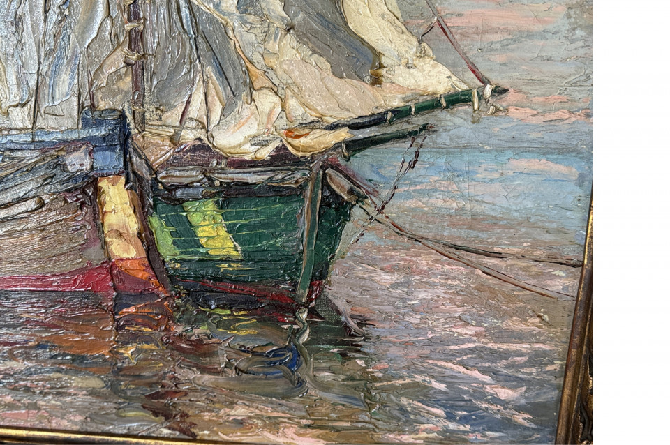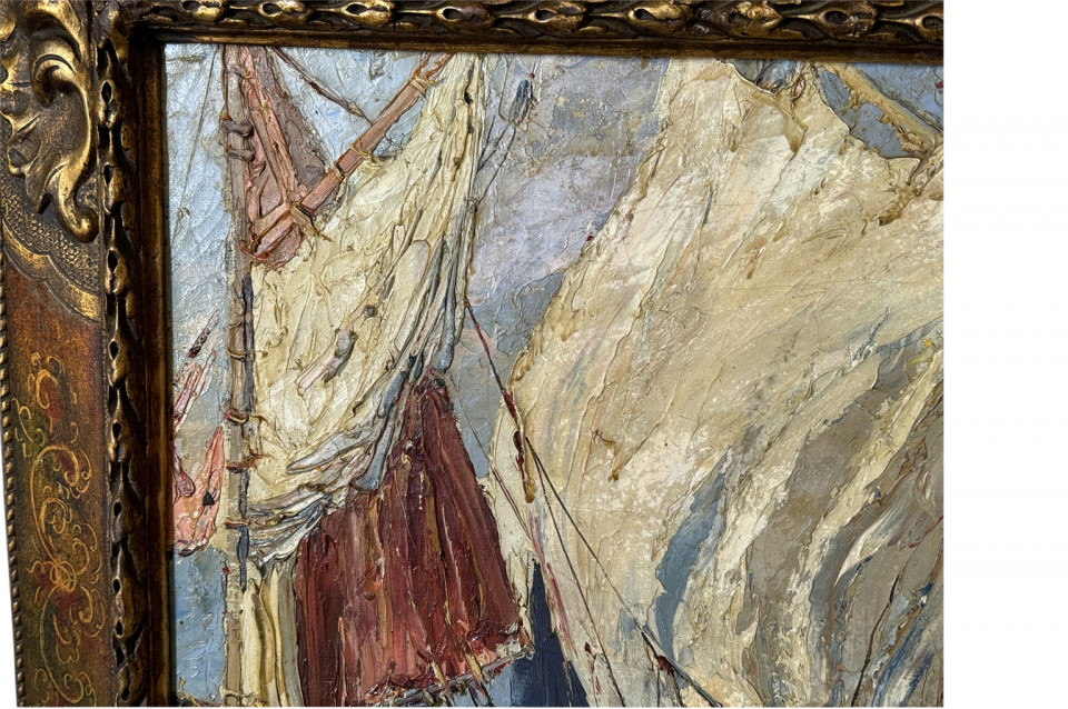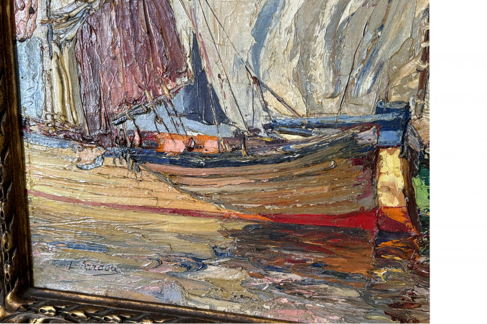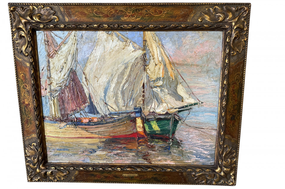 A delightful late 19th century - early 20th century Oil Painting by Louis Arraou housed in its charming frame. A wonderful Marine scene depicting 3 sailing boats. Fabulous color and texture.