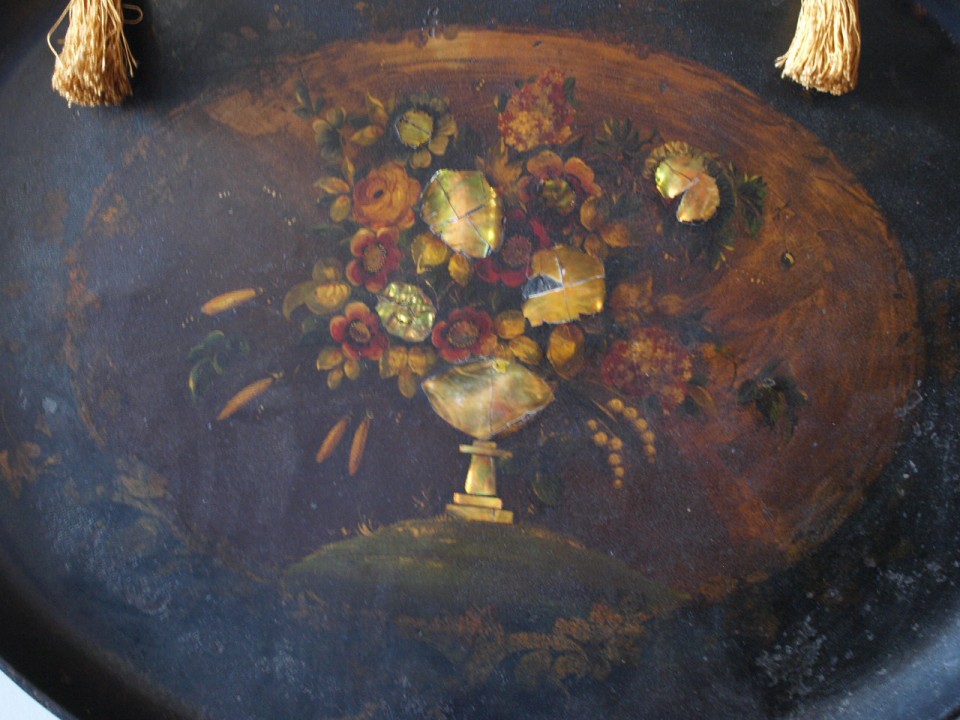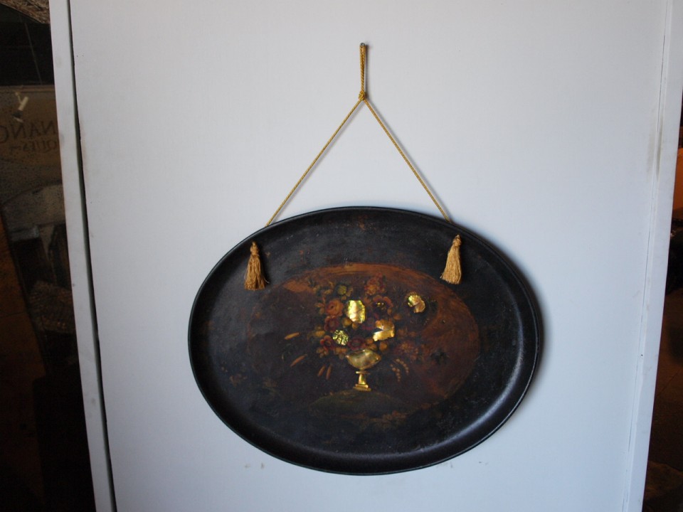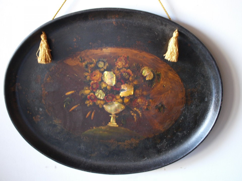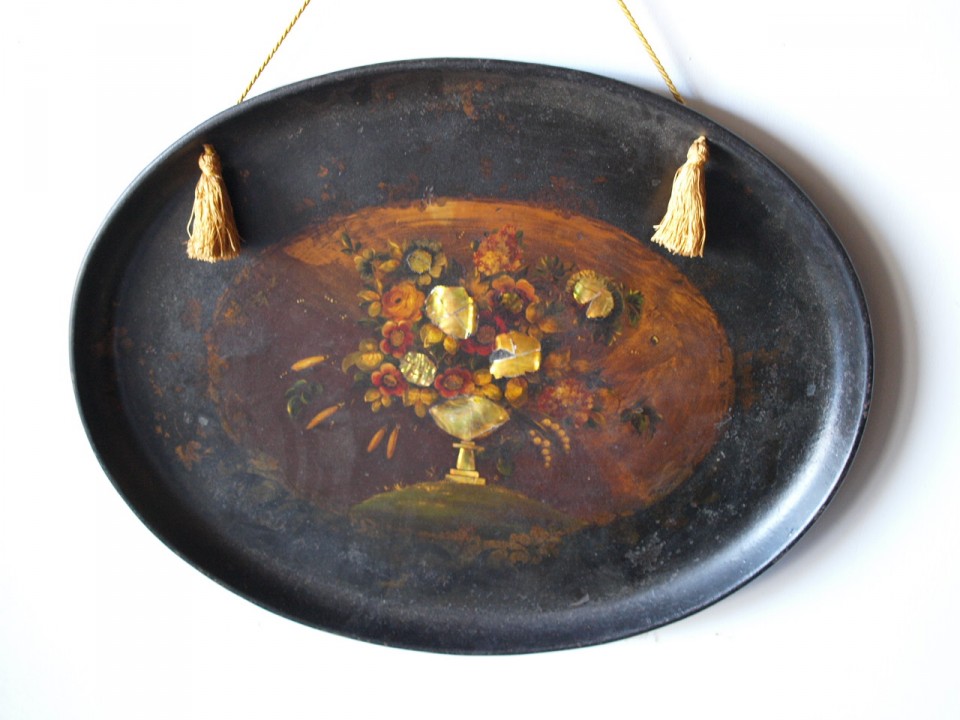 A very lovely French later 19th century painted tole tray. Wonderful texture and patina. A silk cord has been added to hang the tray... A delightful art piece.