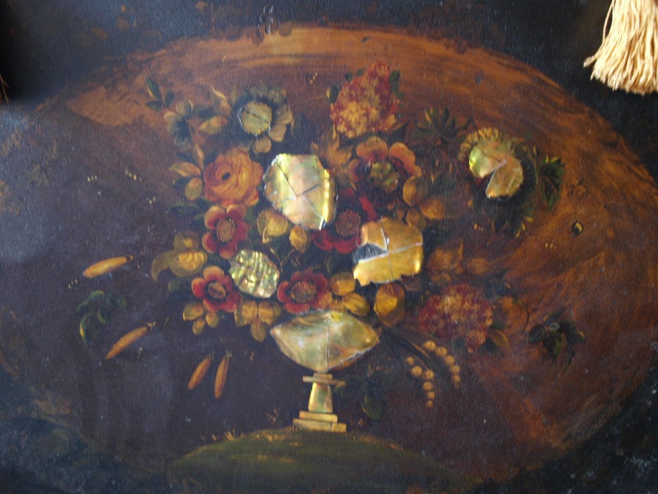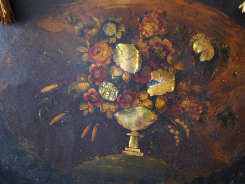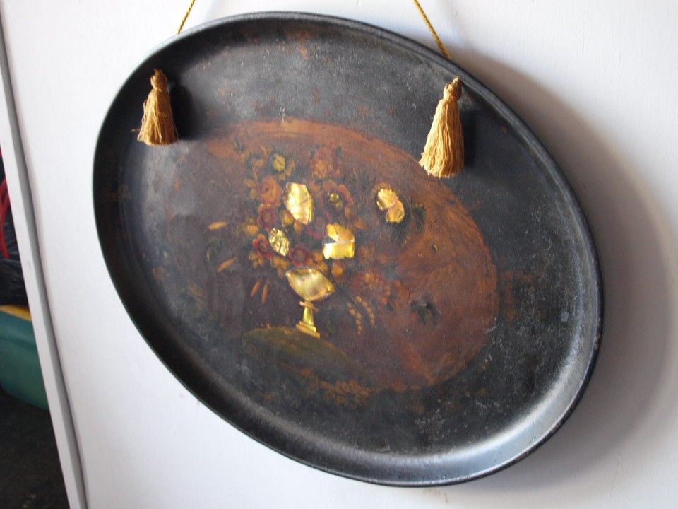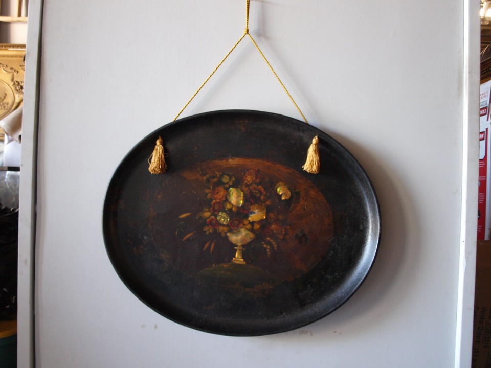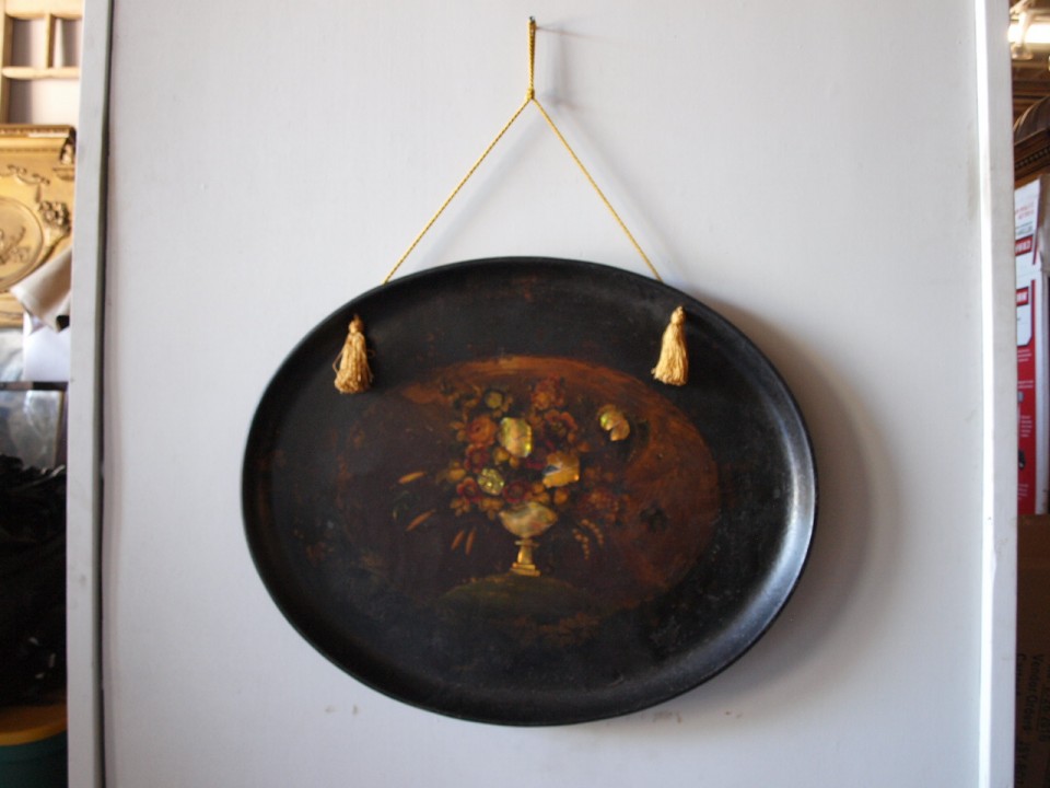 A very lovely French later 19th century painted tole tray. Wonderful texture and patina. A silk cord has been added to hang the tray... A delightful art piece.