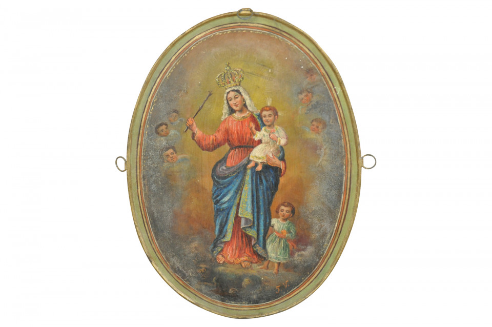 A wonderful pair of later 19th century Spanish religious paintings. Oil painted on metal in an oval shape. Both depicting Mary with the Baby Jesus. Wonderful color.