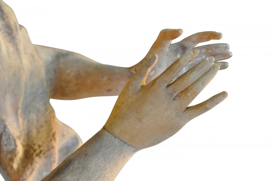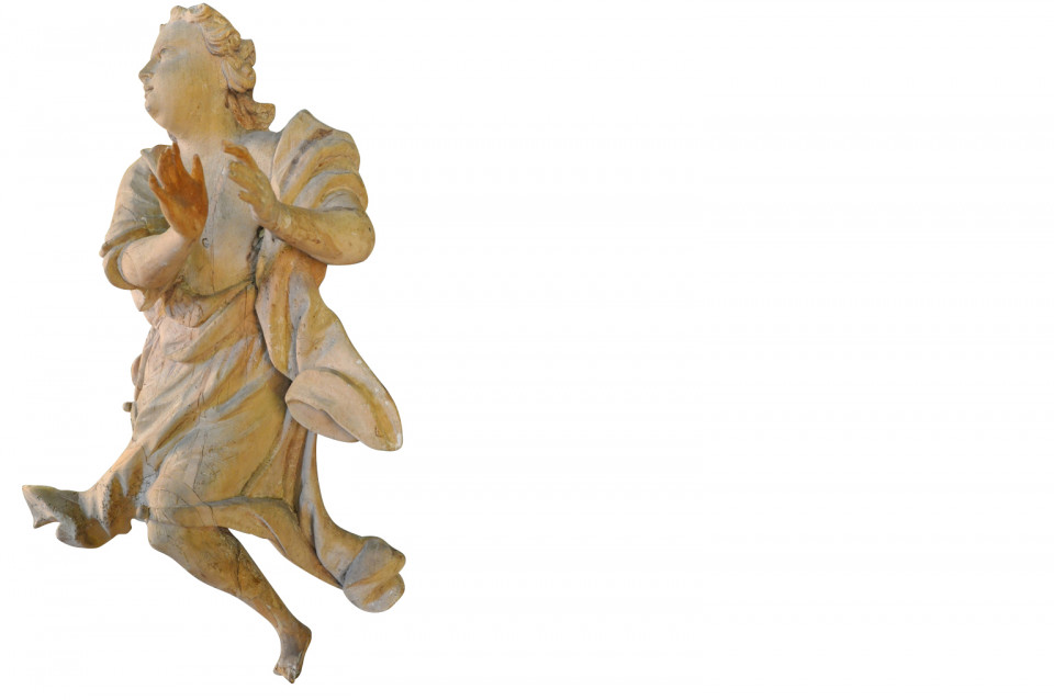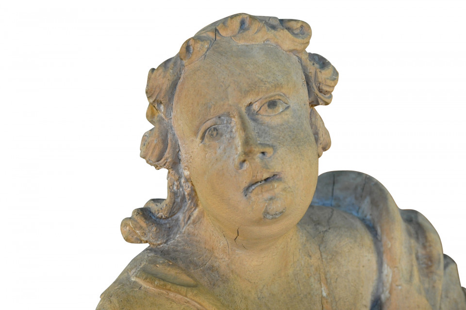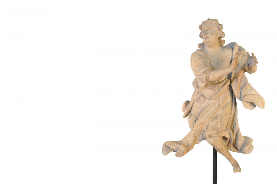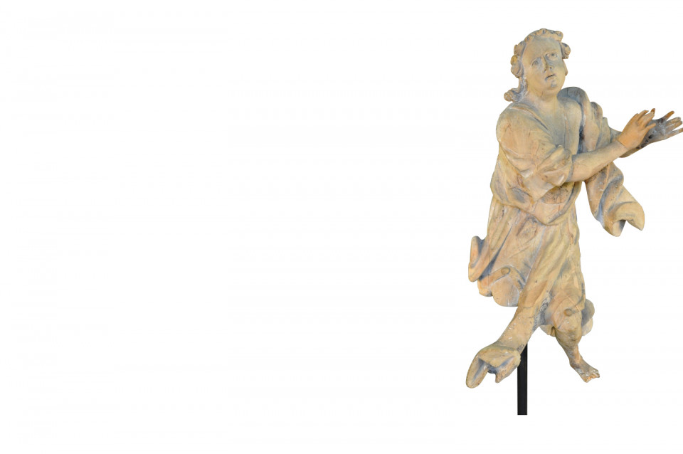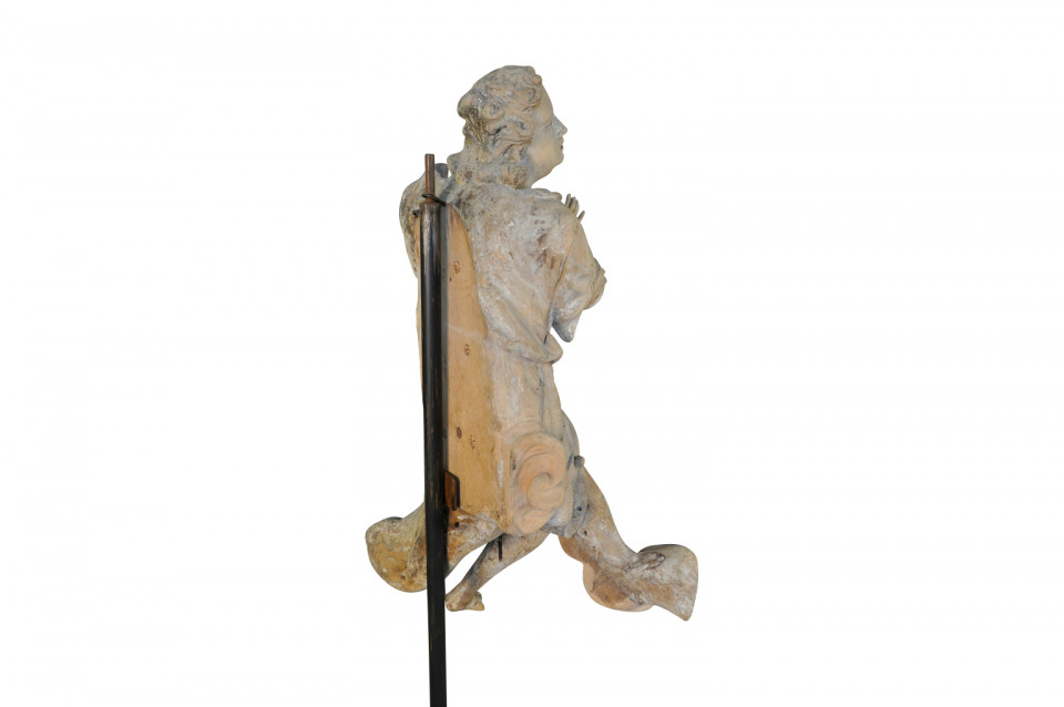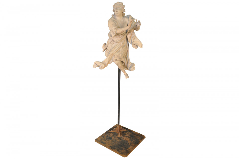 A very beautiful French 18th century statue of an angel - presented on its iron stand. Wonderfully hand carved with stunning detail. The statue itself measures 34 3/4" H X 20" W X 12" D