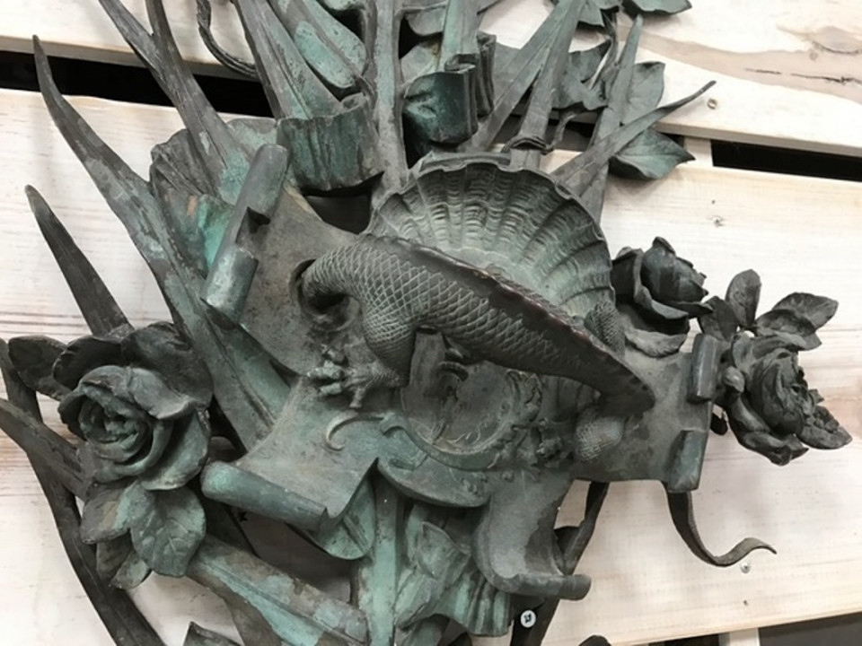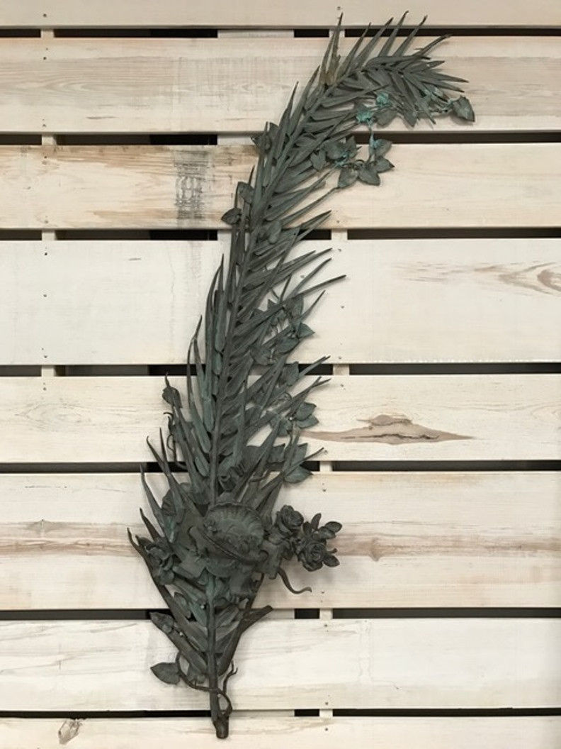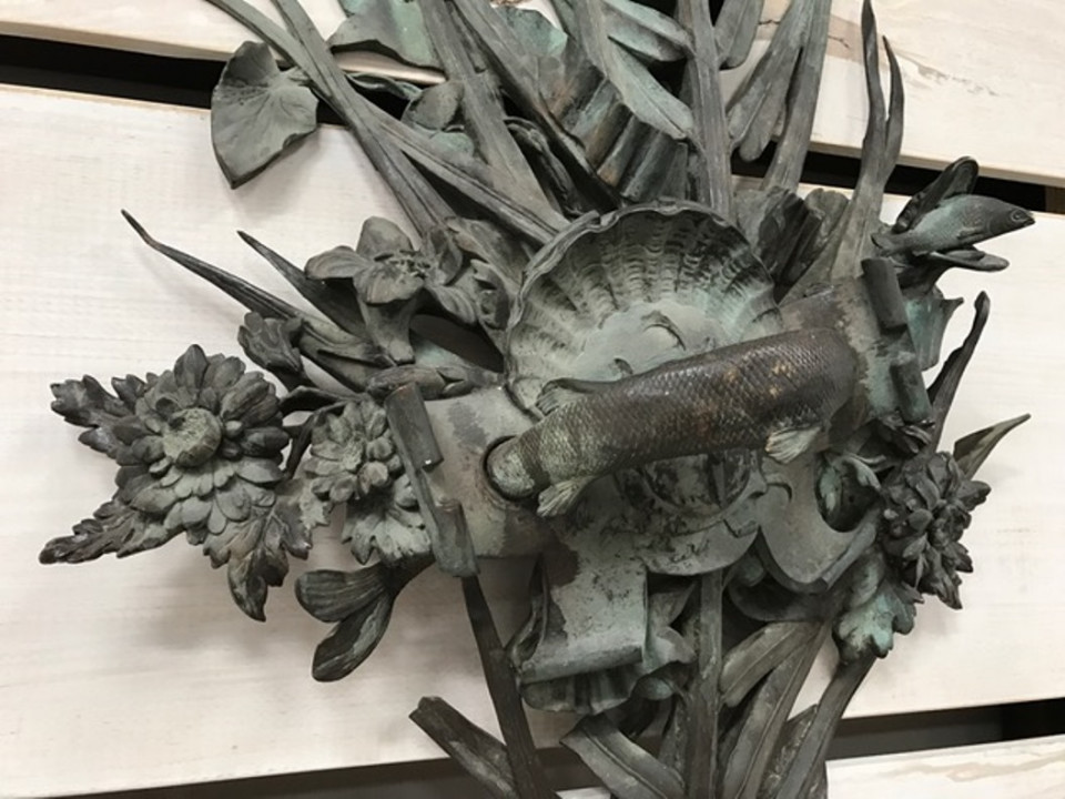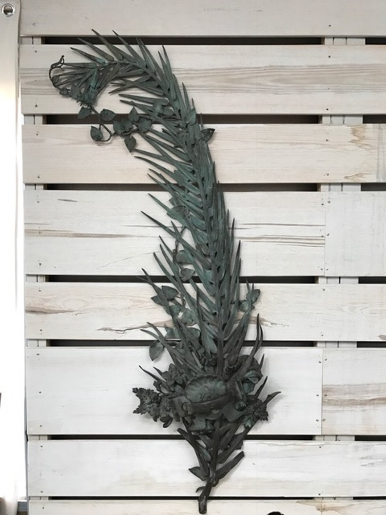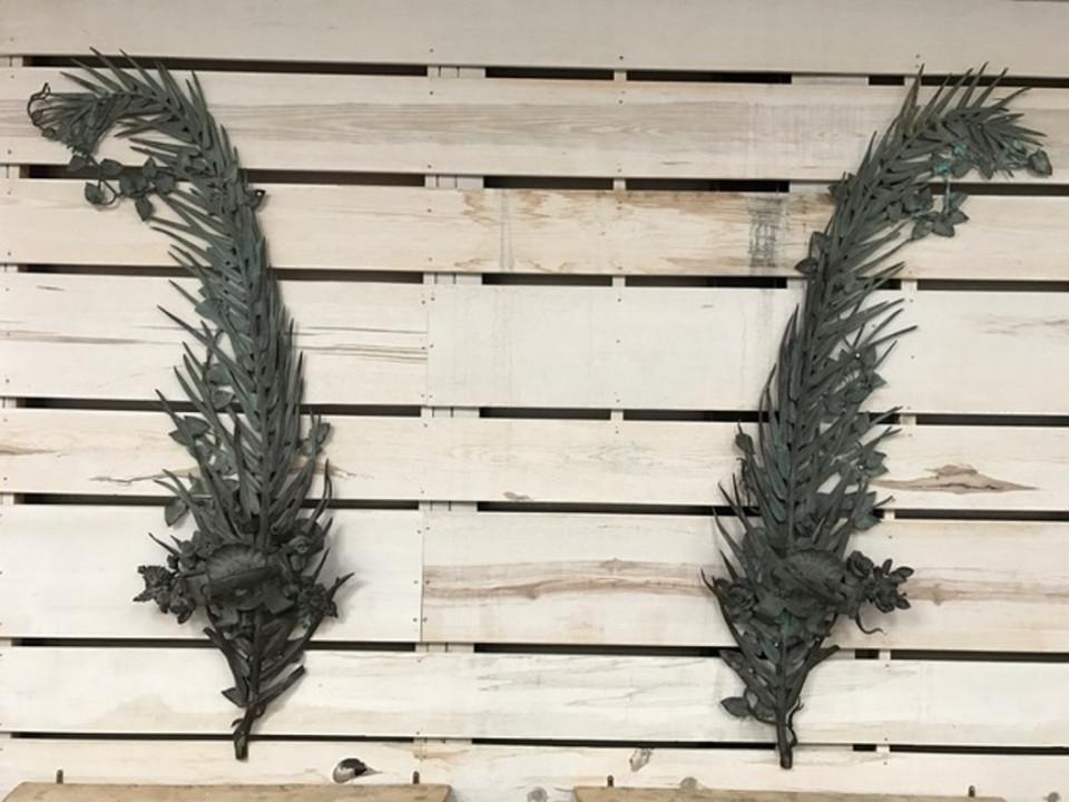 A sensational and monumental pair of late 19th century - early 20th century French door handles. Exquisitely crafted from bronze with a tremendous patina. Outstanding detail - both with palm fronds decorated with vines and magnificent flowers. One handle is of a fish with a smaller fish in its mouth. The second handle is a salamander. These impressive architectural pieces will will indeed make a any entry a unique statement. They will also serves stunningly as wall mounted artwork for the interior or garden.