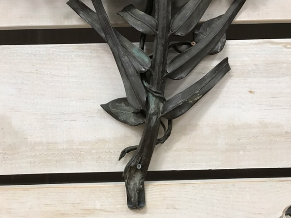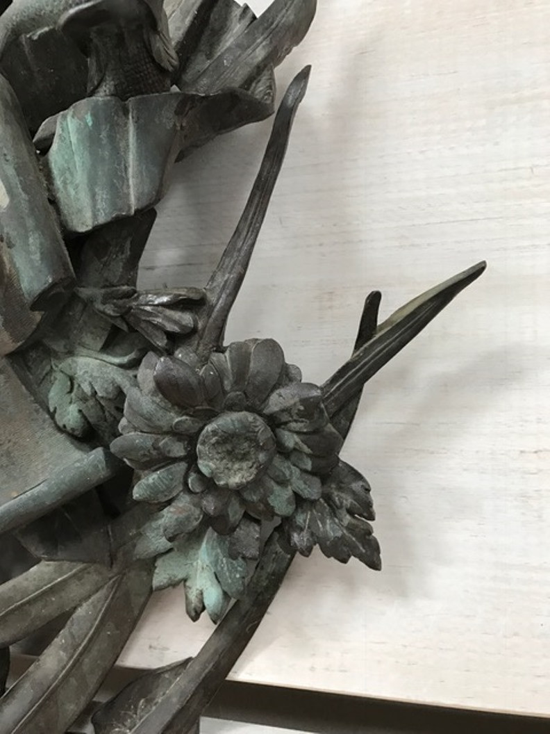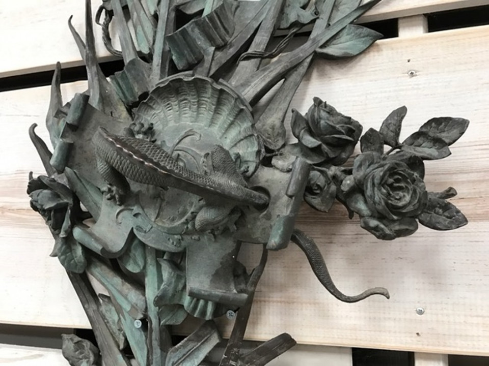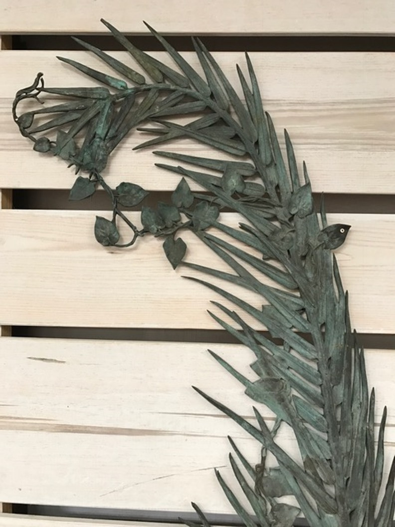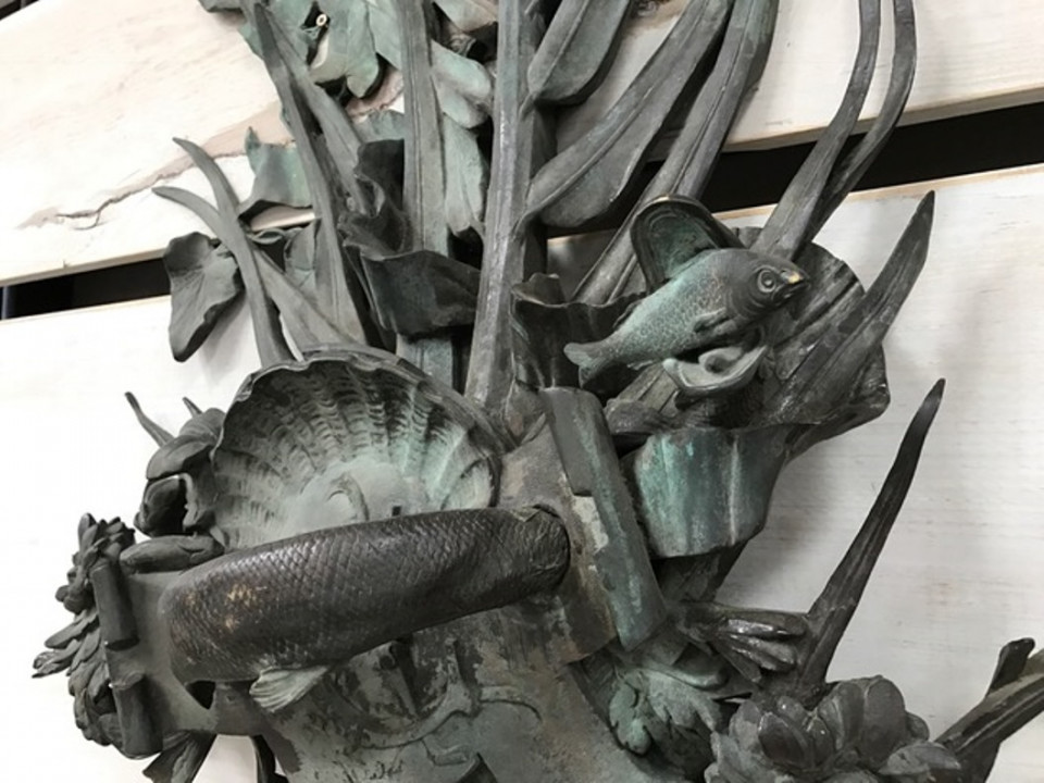 A sensational and monumental pair of late 19th century - early 20th century French door handles. Exquisitely crafted from bronze with a tremendous patina. Outstanding detail - both with palm fronds decorated with vines and magnificent flowers. One handle is of a fish with a smaller fish in its mouth. The second handle is a salamander. These impressive architectural pieces will will indeed make a any entry a unique statement. They will also serves stunningly as wall mounted artwork for the interior or garden.