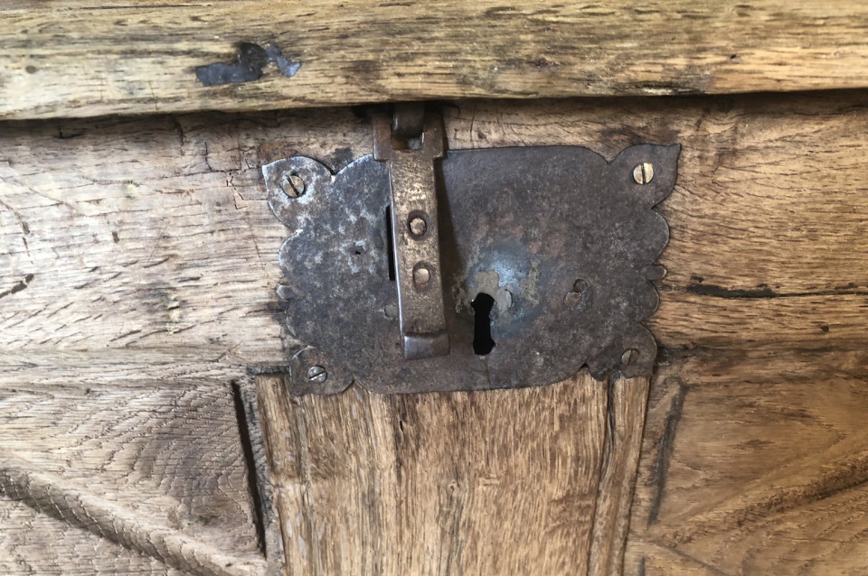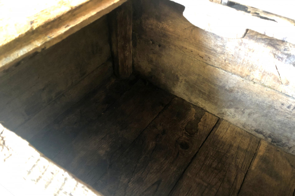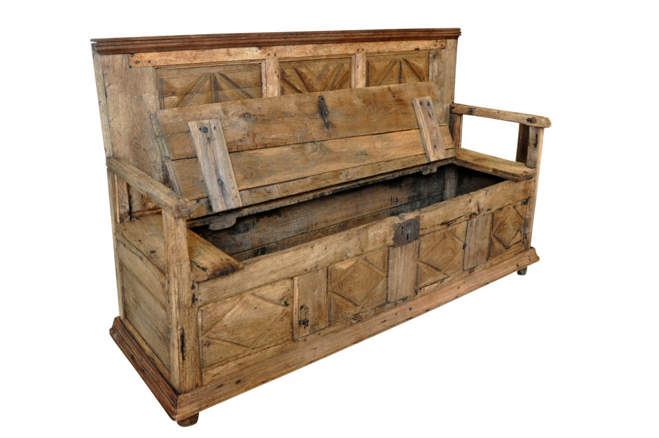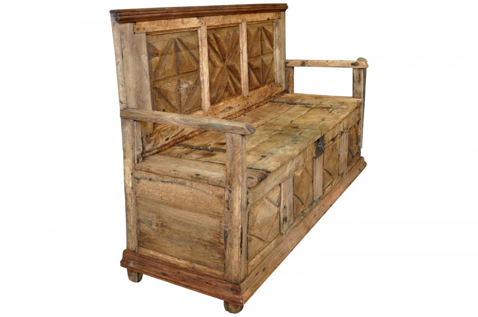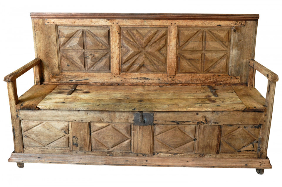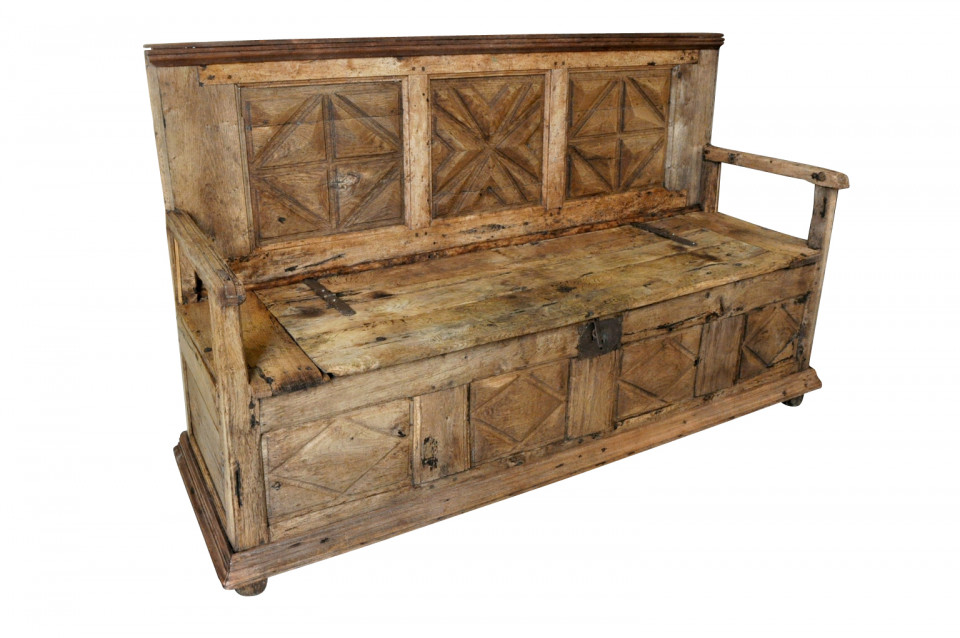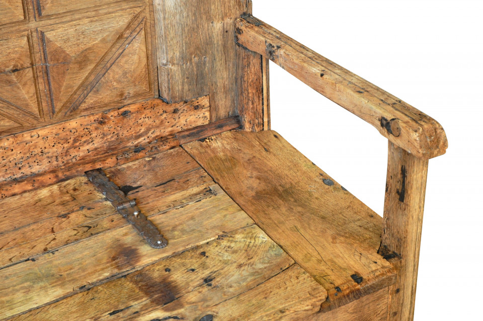 A very handsome and primitive Louis XIII style bench. Wonderfully constructed from washed oak with a beautiful carved paneled back with lifting seat. Great storage.
