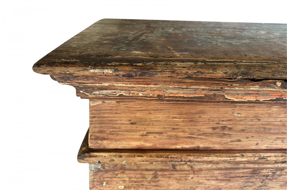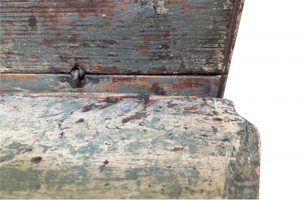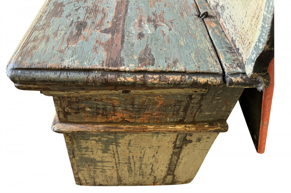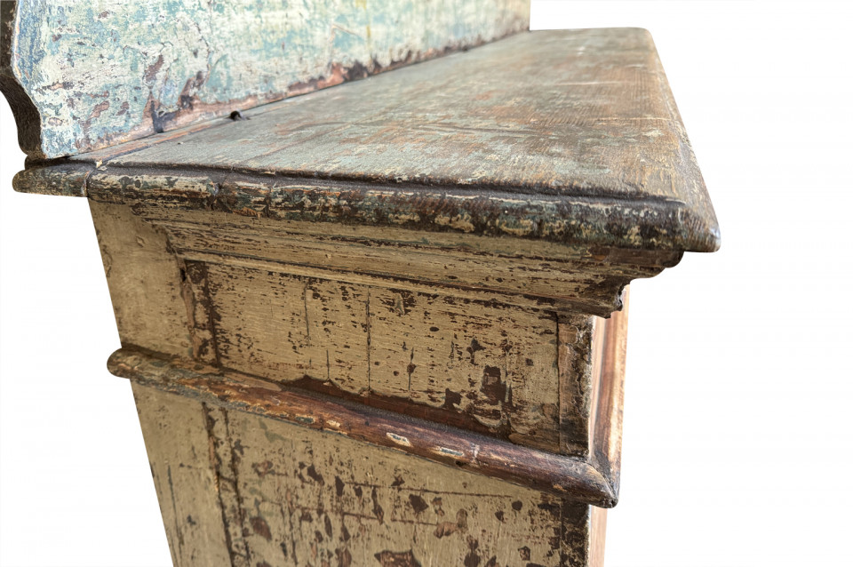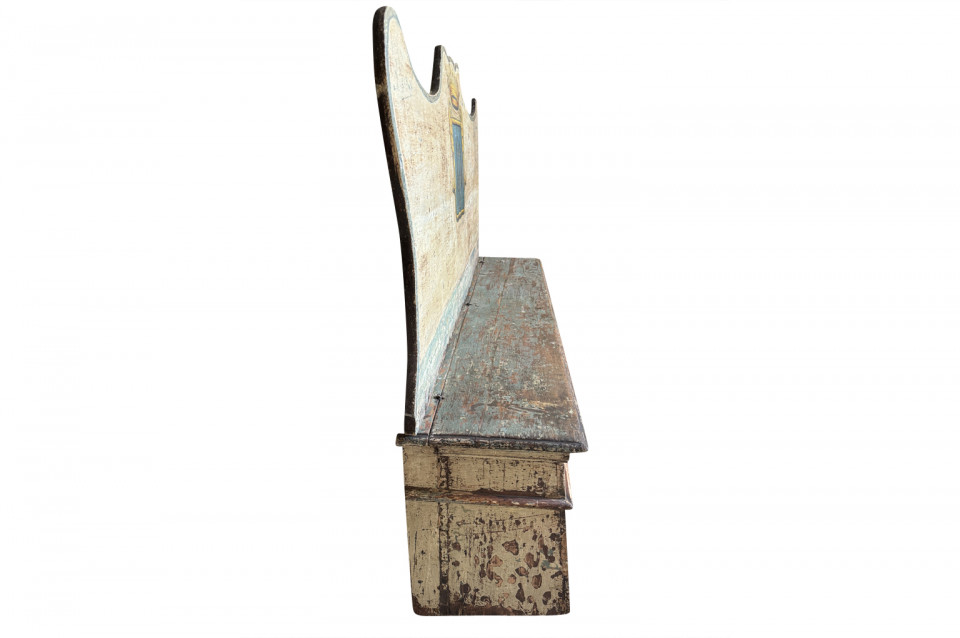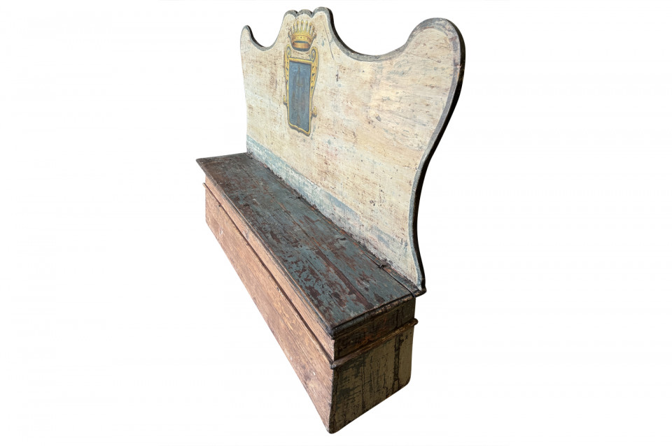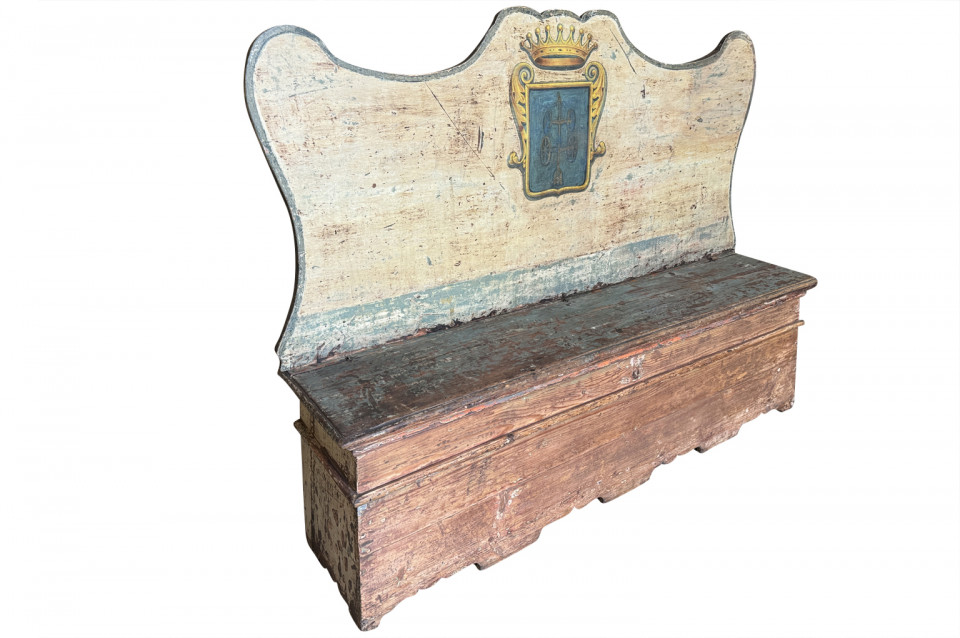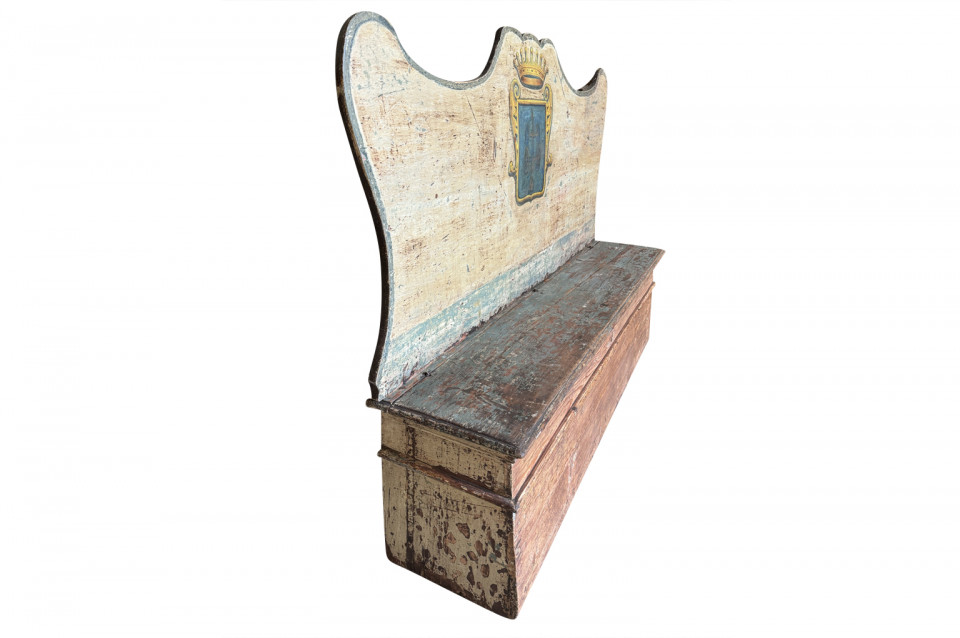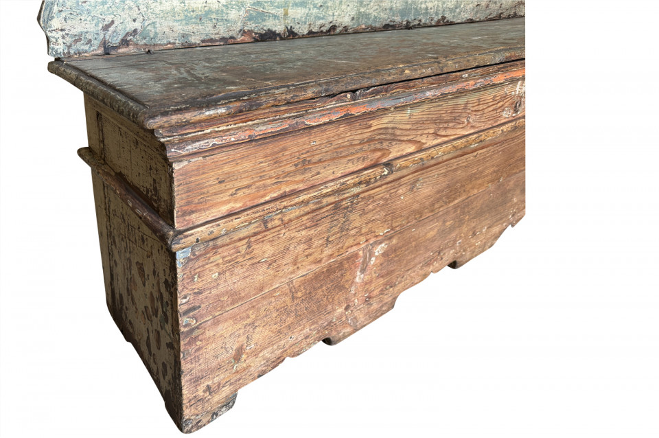 An outstanding late 17th - early 18th century Cassapanca - Bench from the Tuscan region of Italy. Beautifully constructed from pine with a lifting seat and removable back rest. Stunning paintings with fabulous color and patina. The seat height is 21 1/4".