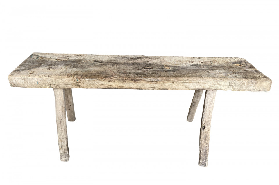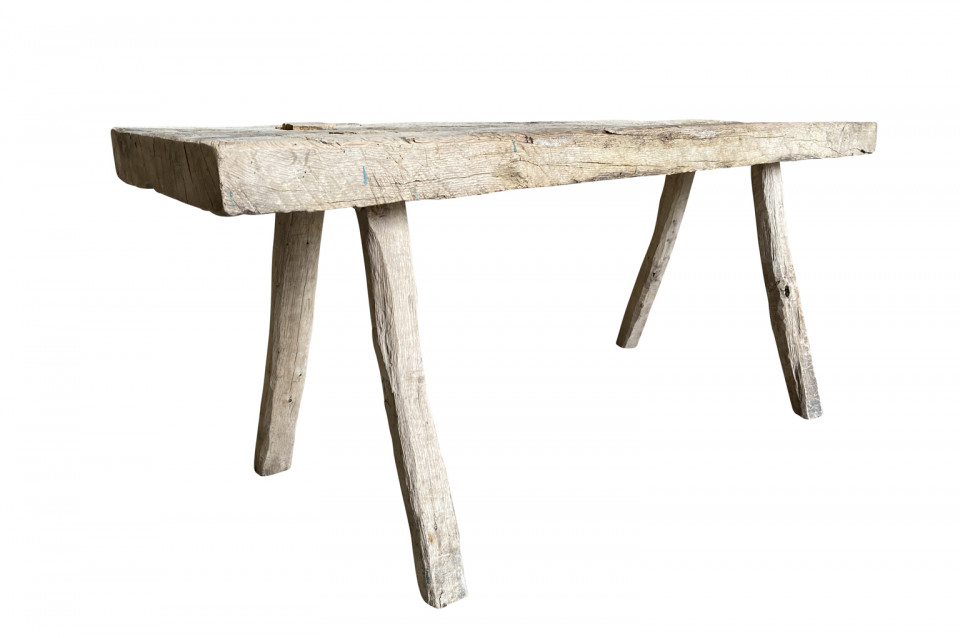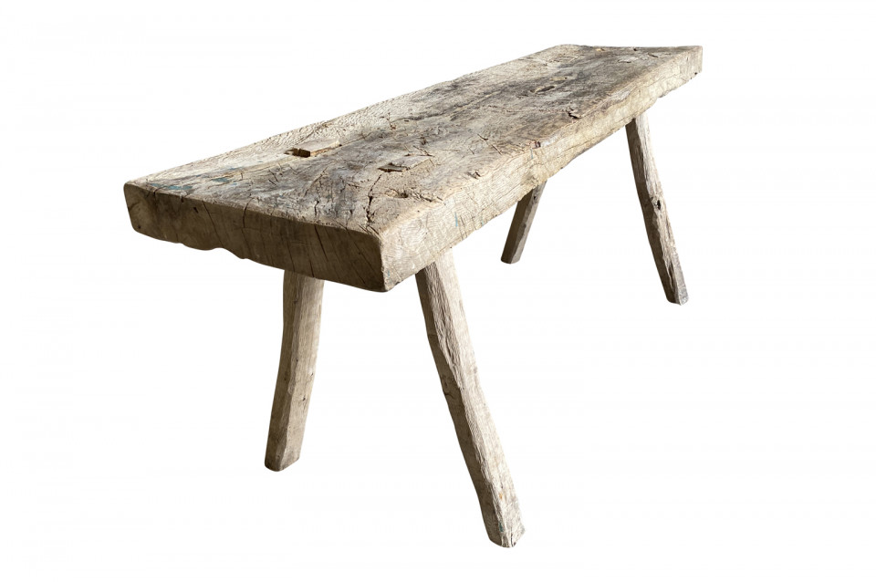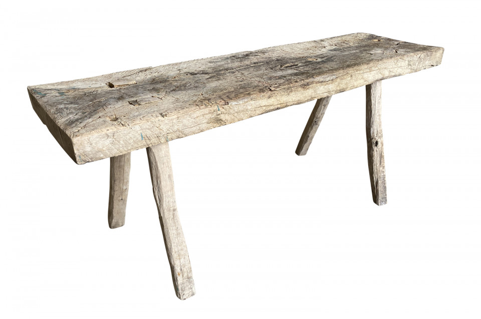 A handsome early 19th century rustic bench from the Catalan region of Spain. Soundly constructed from naturally washed chestnut with a solid board top and four splayed legs. Super patina. Wonderful not only as a bench, but as a coffee table as well.