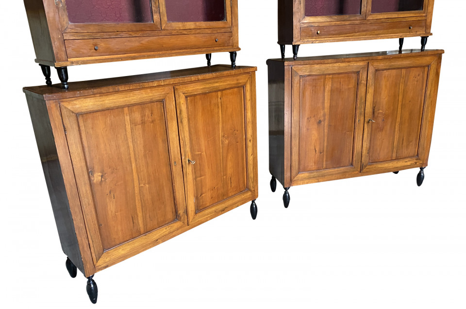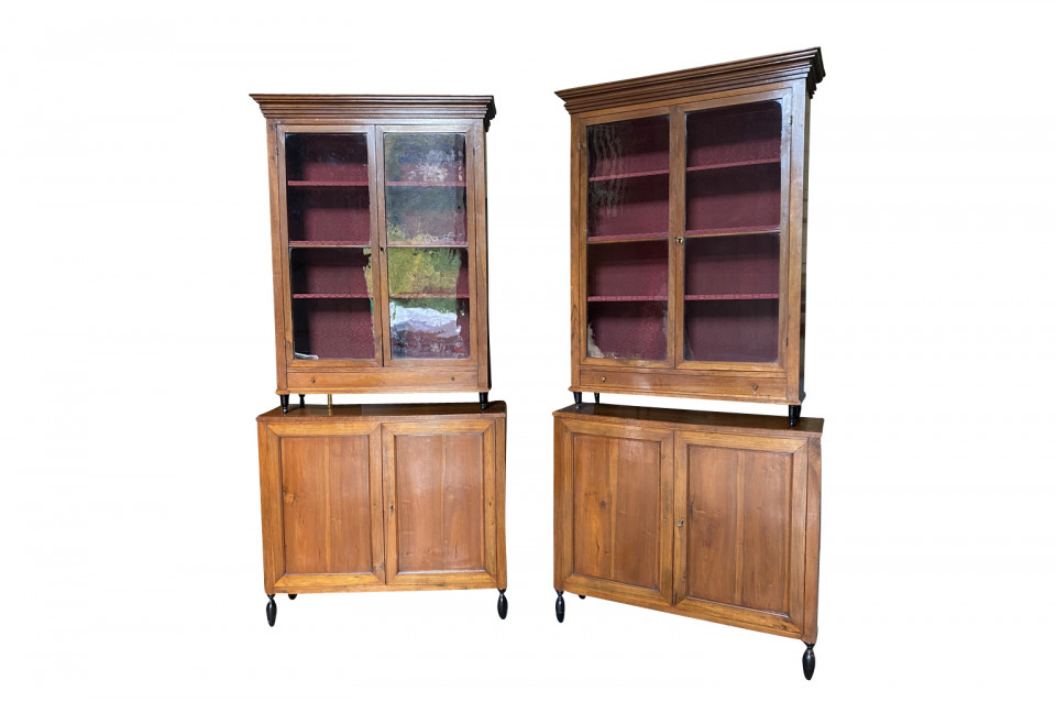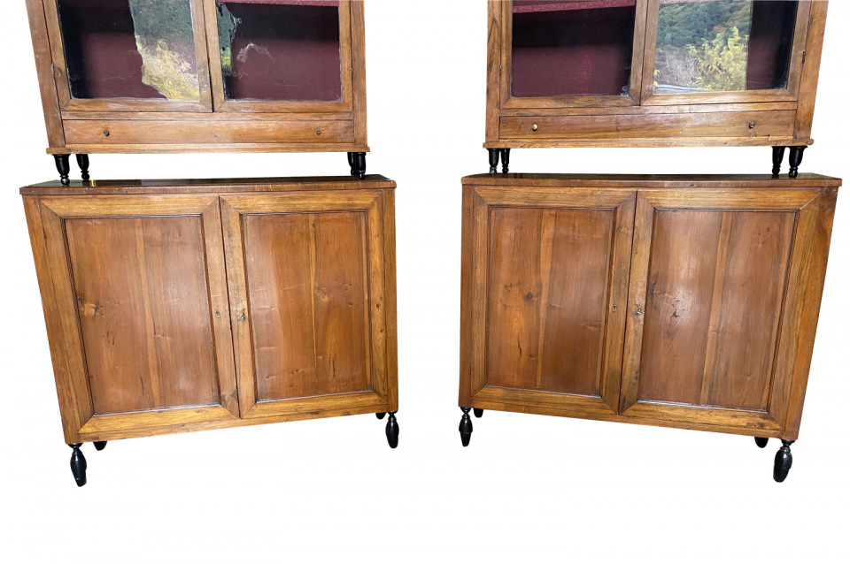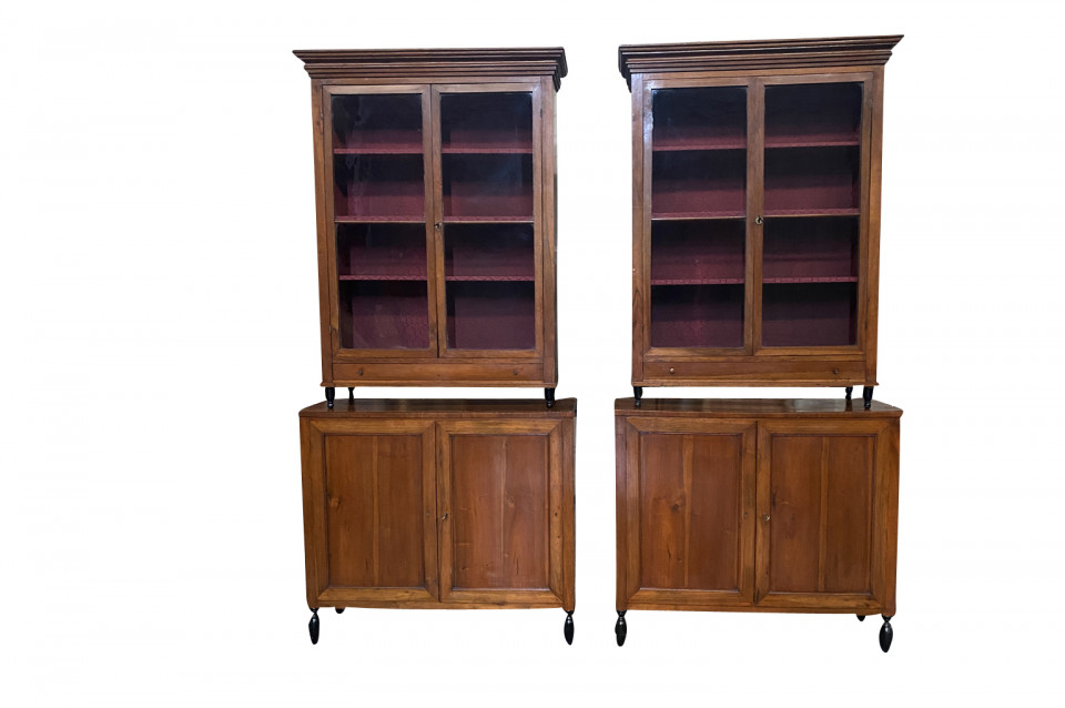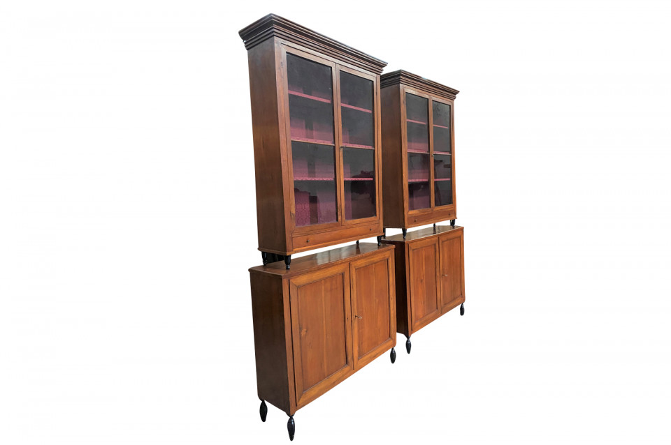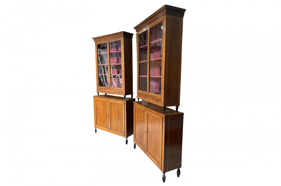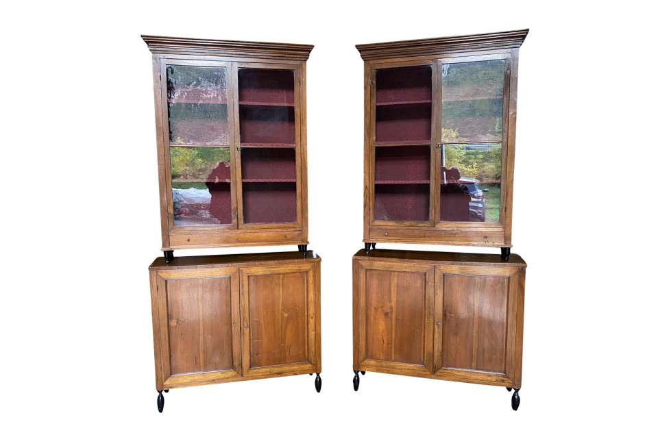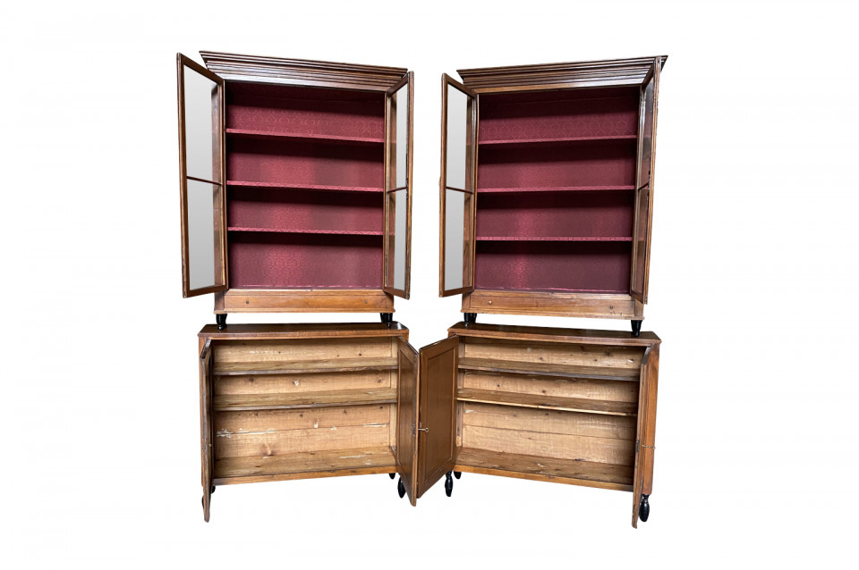 A very elegant pair of early 19th century Deux Corps Bibliotheque - Bookcase from the Veneto region of Italy, Beautifully constructed from stunning walnut. The upper sections retaining their original glass panes, drawers and shelving. The lower sections with double doors and shelving. Nice narrow depth.