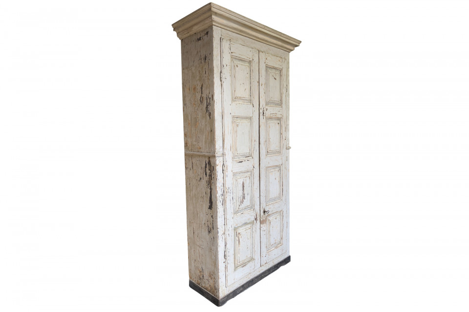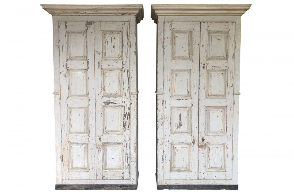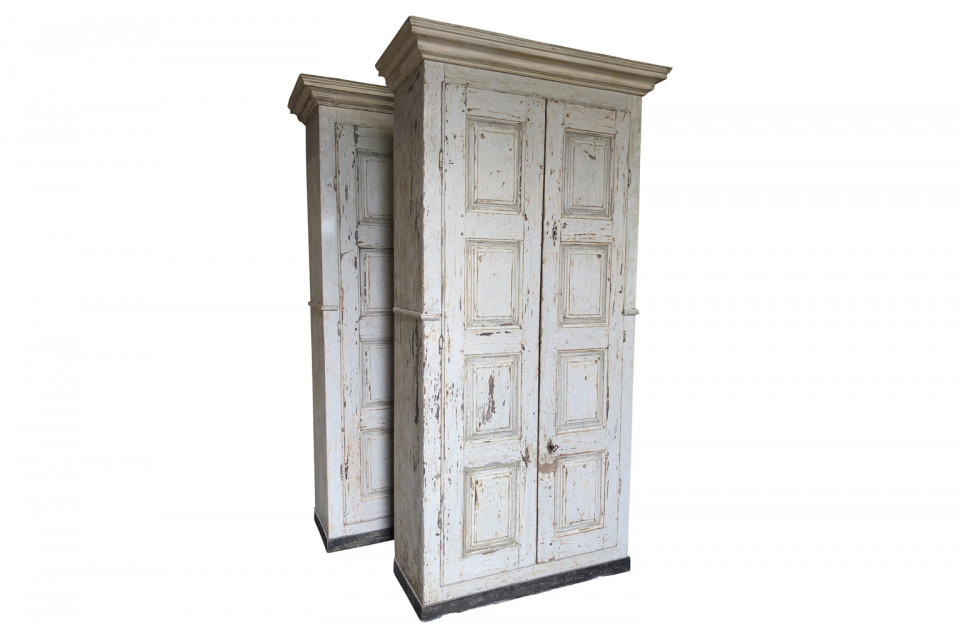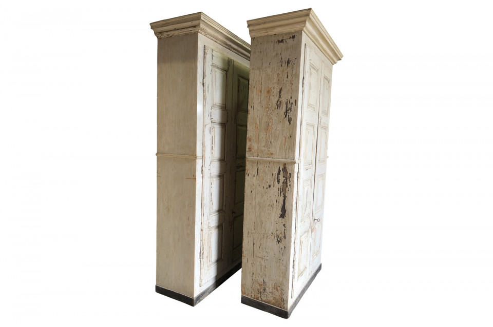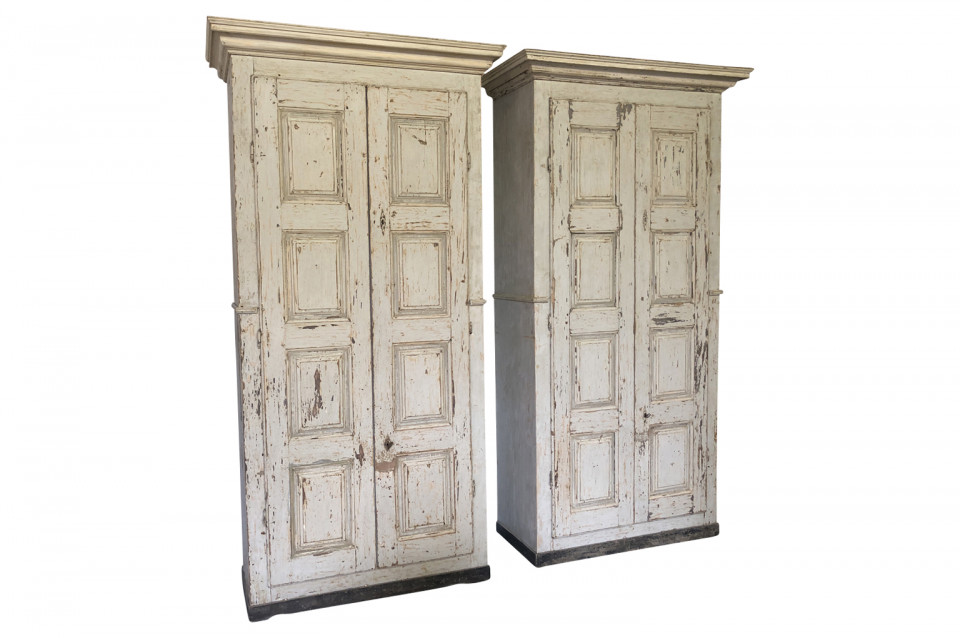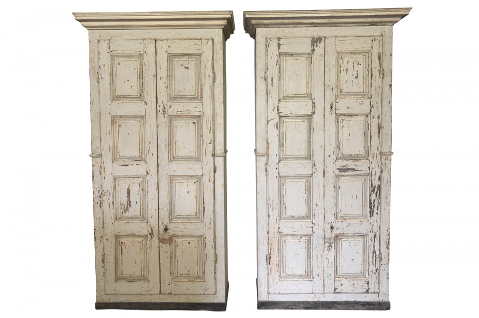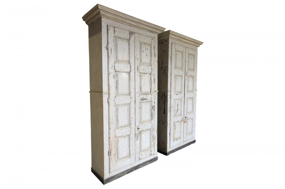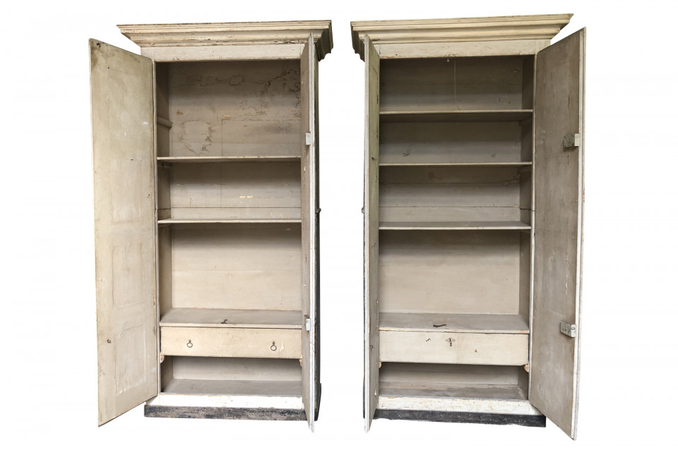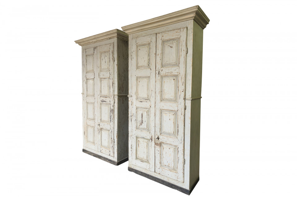 A very handsome pair of grand scale armoires from the Veneto region of Italy. Soundly constructed from painted wood with molded door panels and interior shelves and drawers. Excellent storage capacity. ONE PIECE AVAILABLE. Price per piece is $13750.