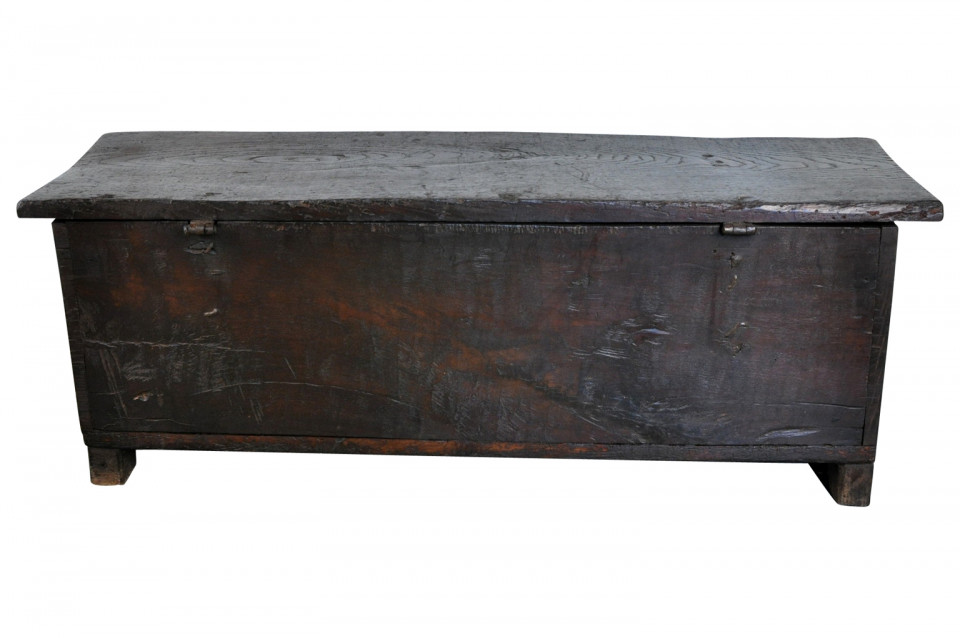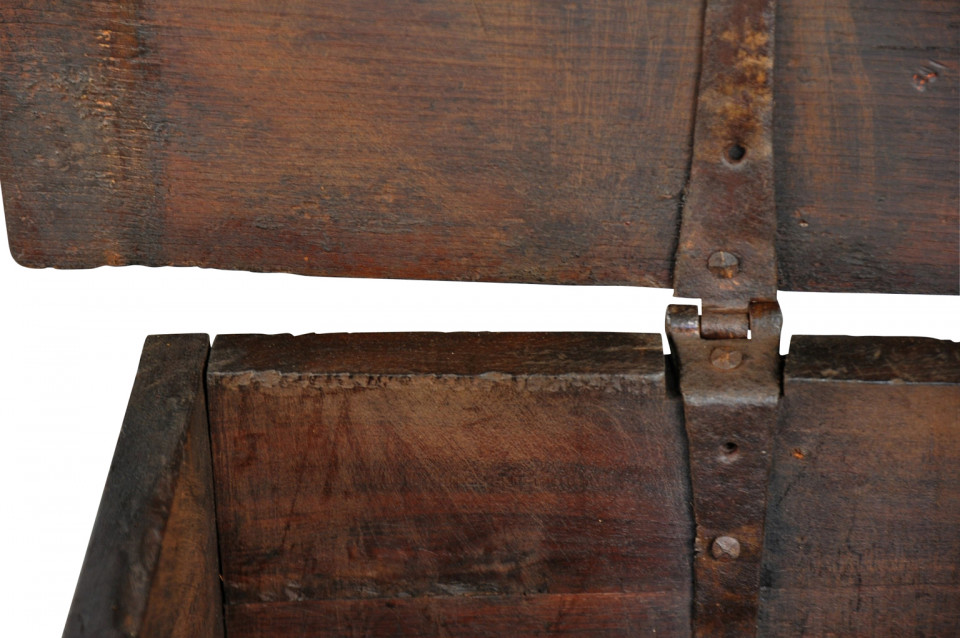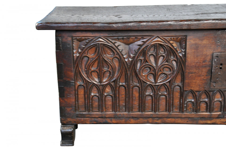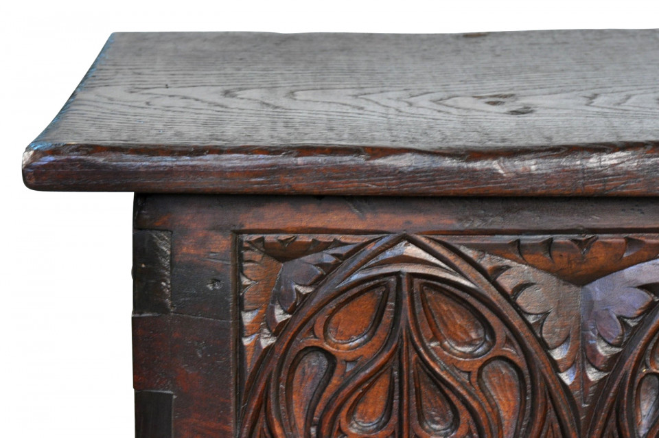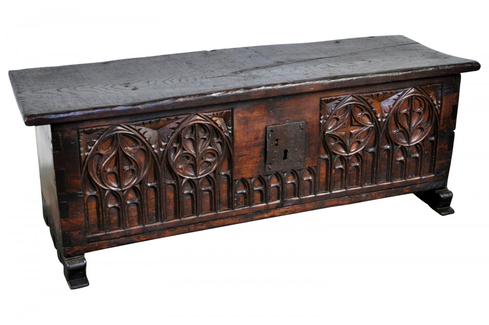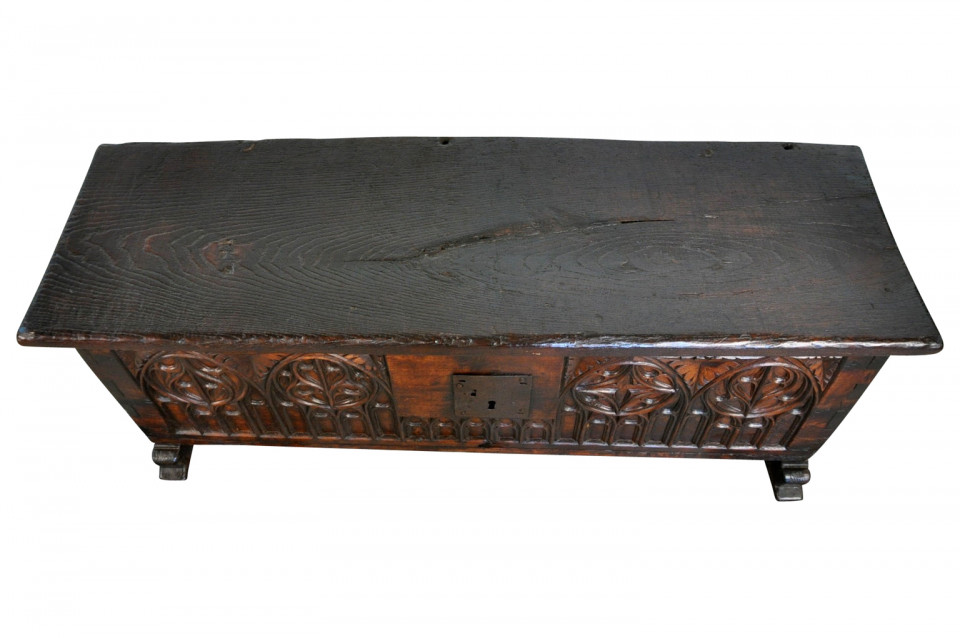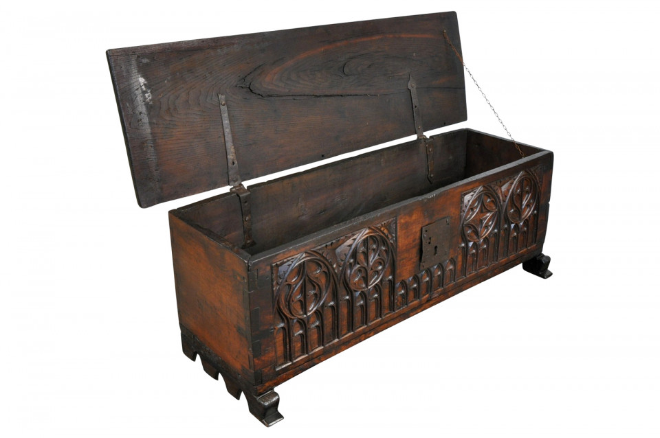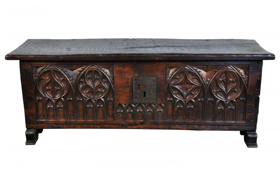 A very handsome 18th century Gothic style trunk from the Catalan region of Spain. Beautifully constructed from chestnut with a solid board top and wonderful carving detail. Terrific at the base of a bed or as a coffee table. Great patina.