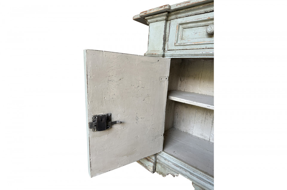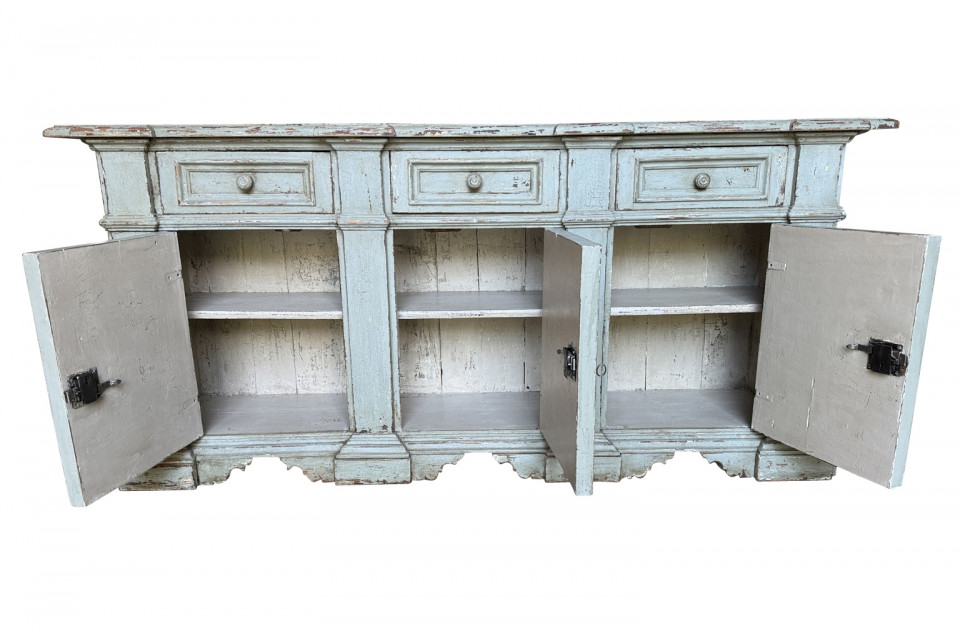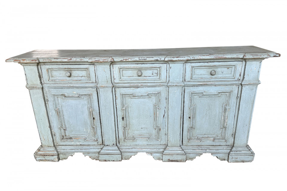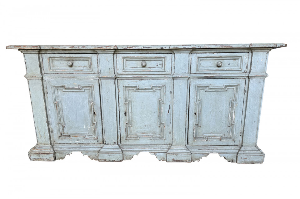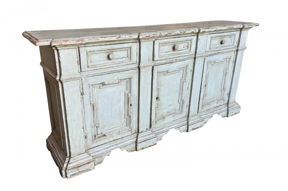 A very lovely early 20th century Credenza from the Genoa region of Italy. Soundly constructed from painted wood with a shaped rectangular top above a conforming case housing three drawers over three paneled doors between recessed paneled pilasters, interior shelving, raised on bracket feet. Wonderful finish and patina.