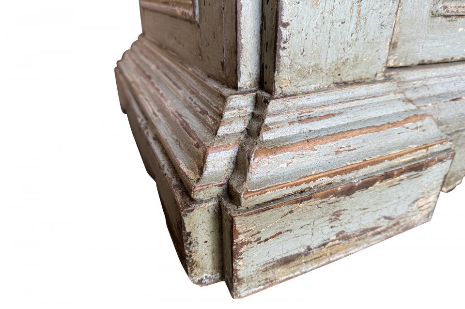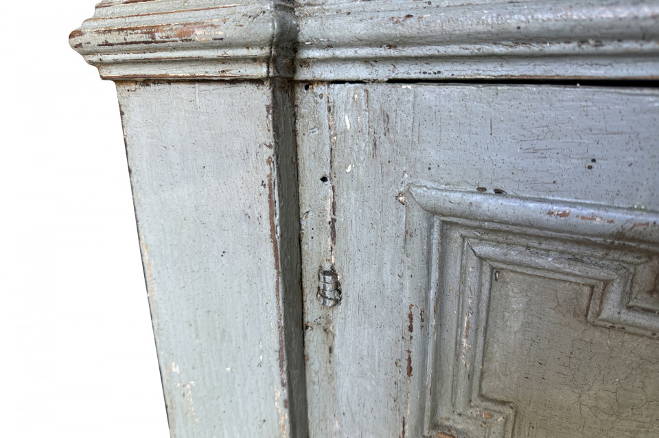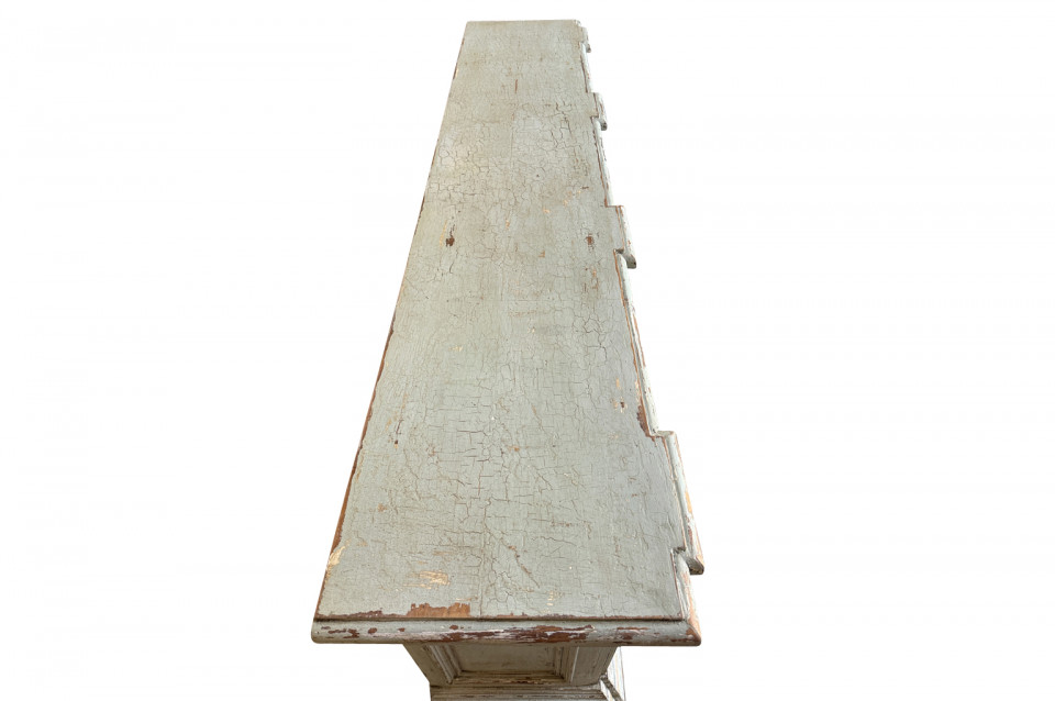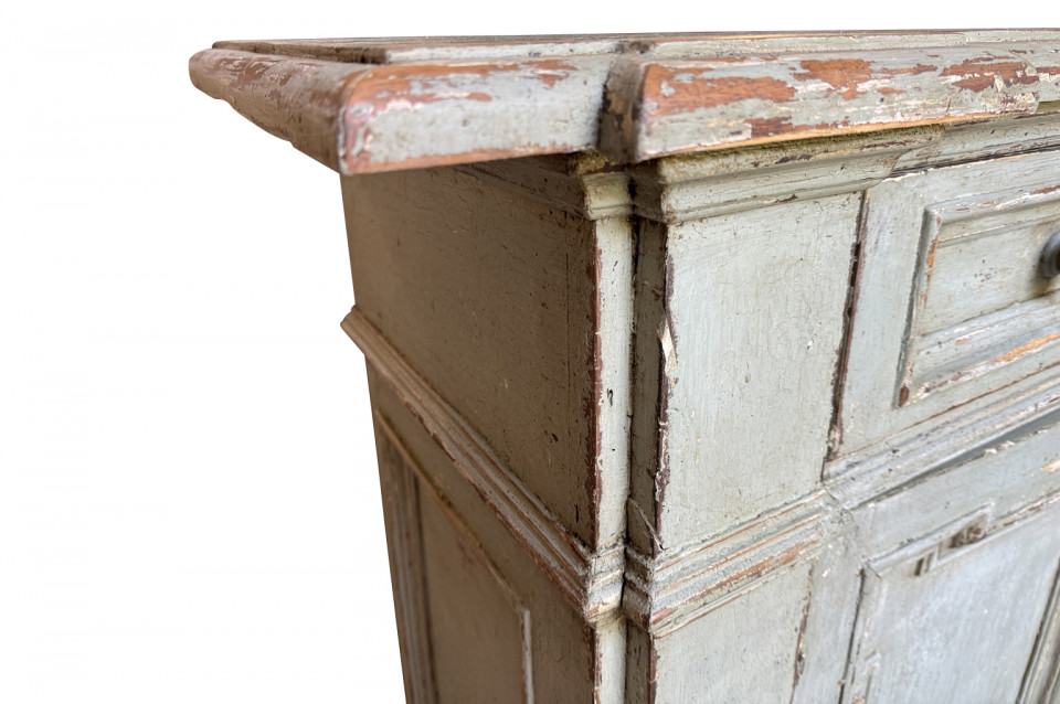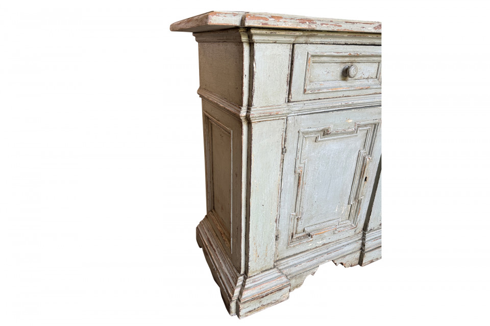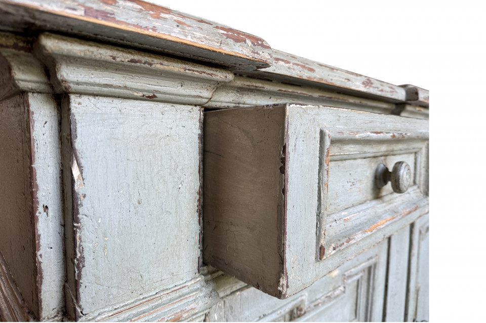 A very lovely early 20th century Credenza from the Genoa region of Italy. Soundly constructed from painted wood with a shaped rectangular top above a conforming case housing three drawers over three paneled doors between recessed paneled pilasters, interior shelving, raised on bracket feet. Wonderful finish and patina.