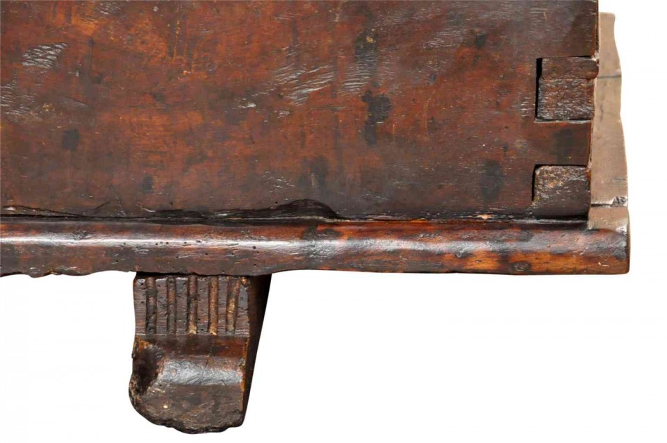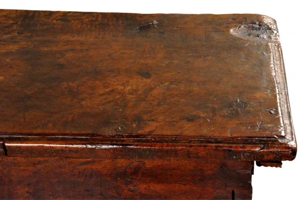 A very handsome 18th century Cassone - or storage trunk - from Northern Italy. Beautifully constructed in hand hewn very thick planks of walnut. The graining and patina are simply exceptional. Mortise and tenon joints, raised on feet.
