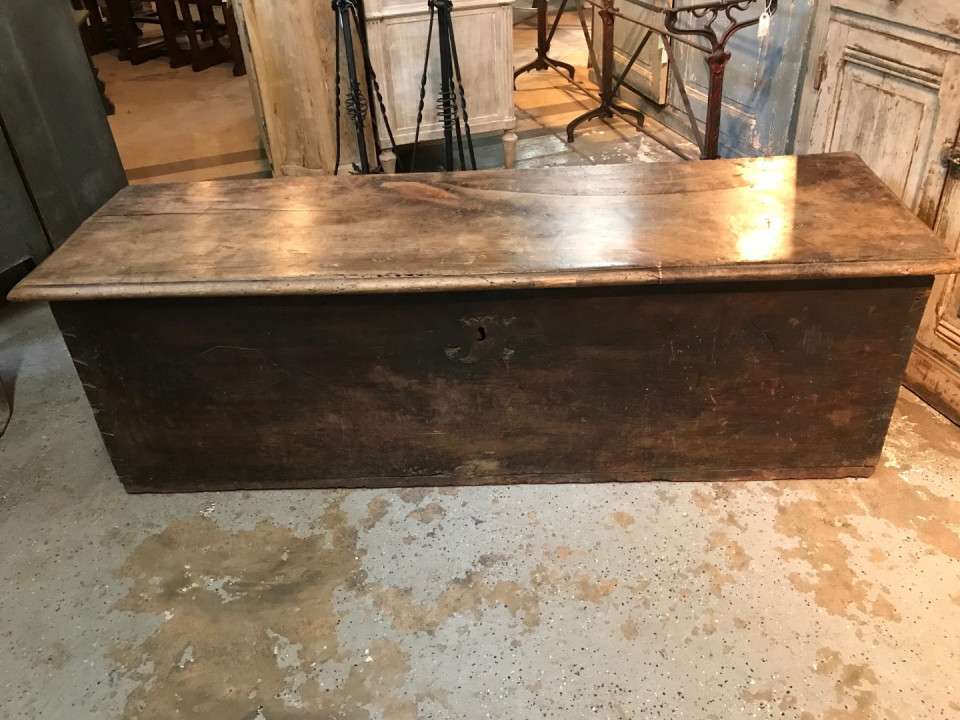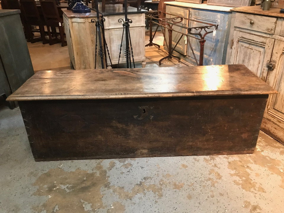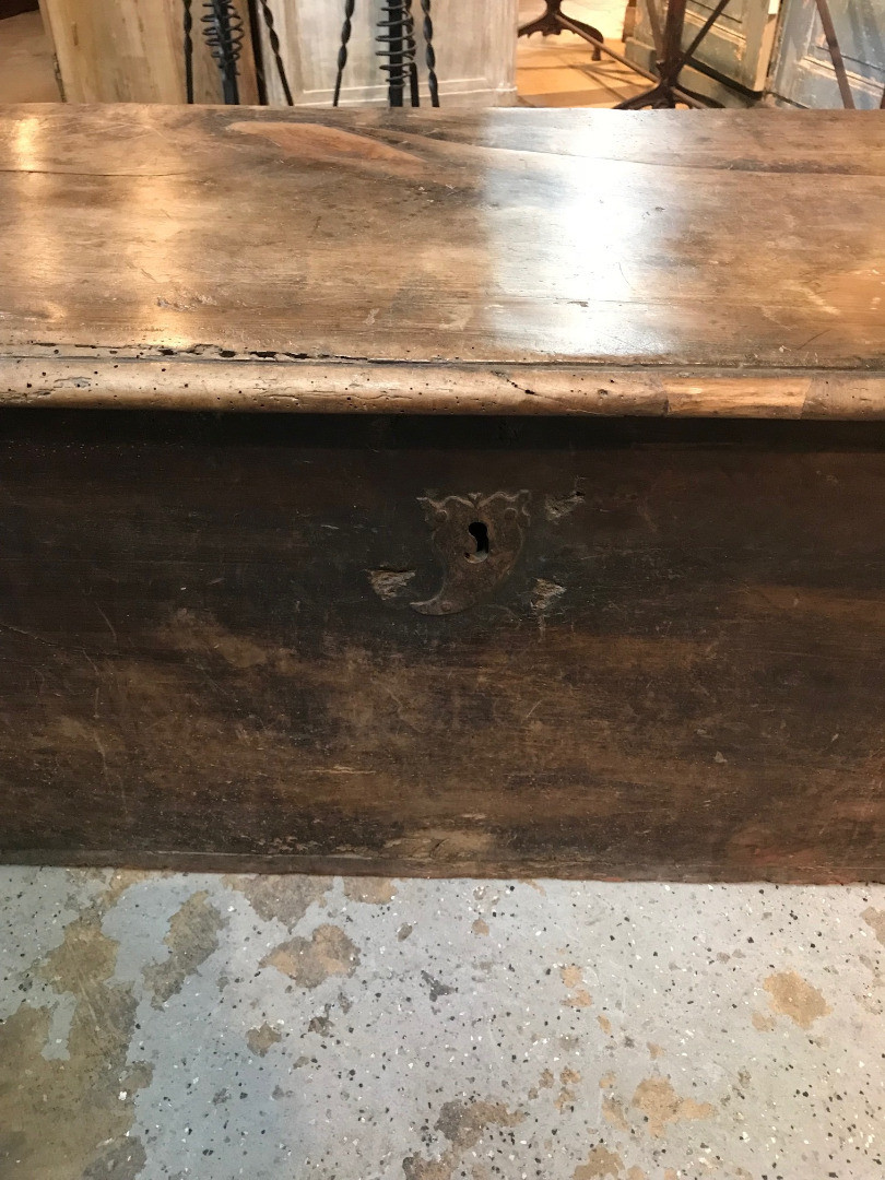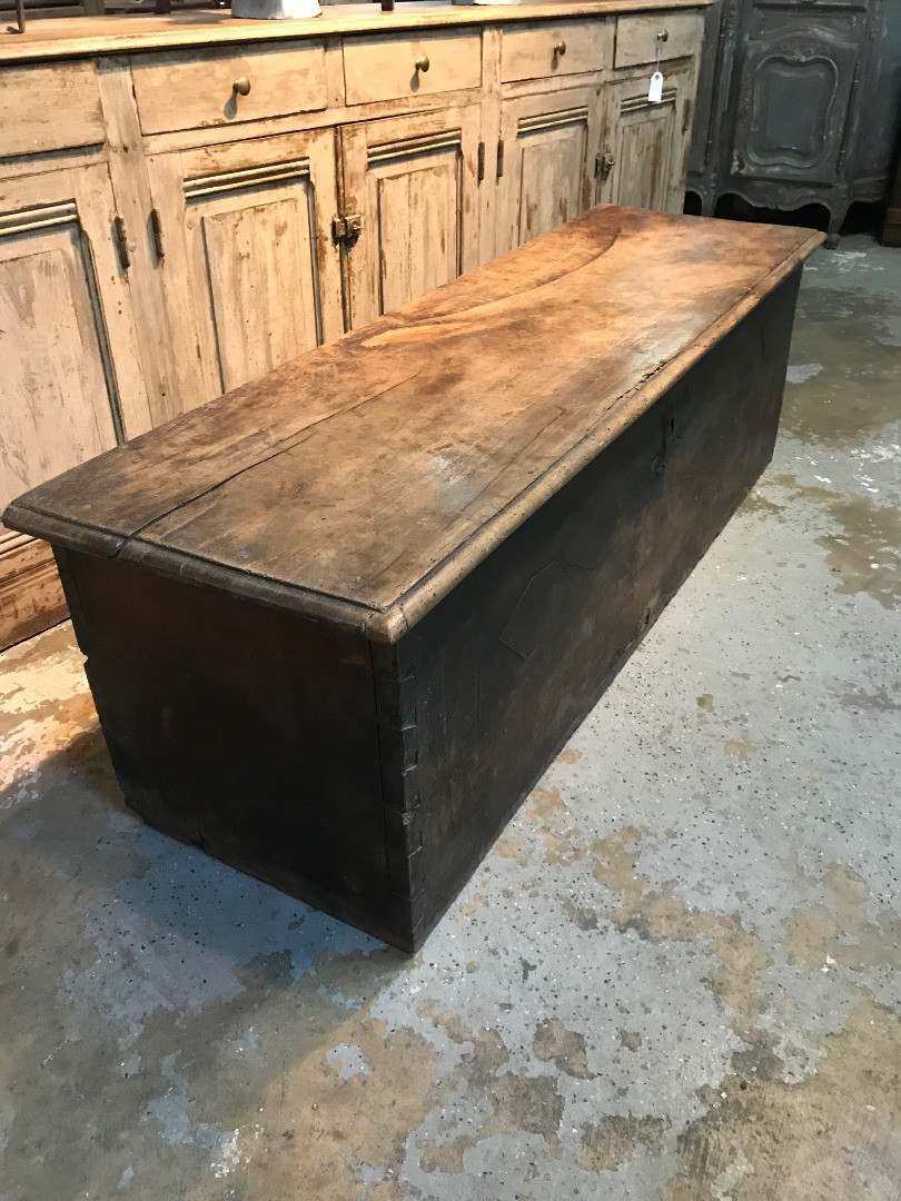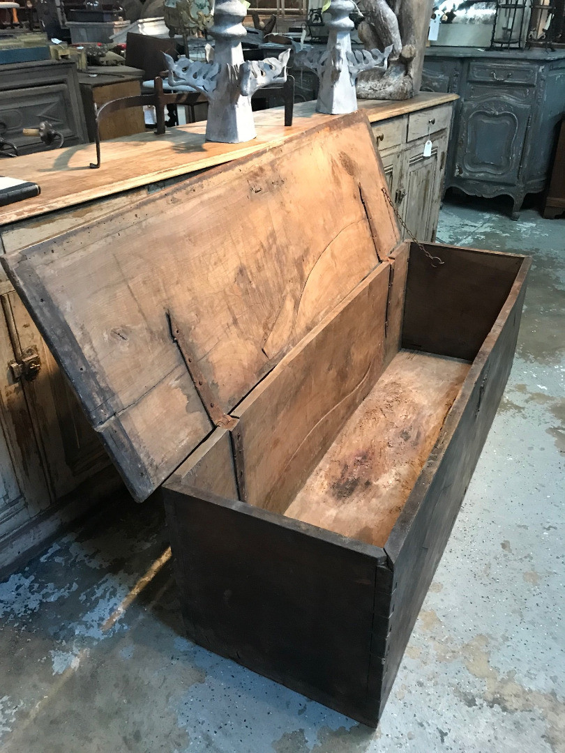 An outstanding primitive trunk or coffre from the Catalan region of Spain. Wonderfully constructed from thick and solid boards of walnut with dovetail joinery. Terrific patina. Perfect at the foot of a bed or under a picture window.